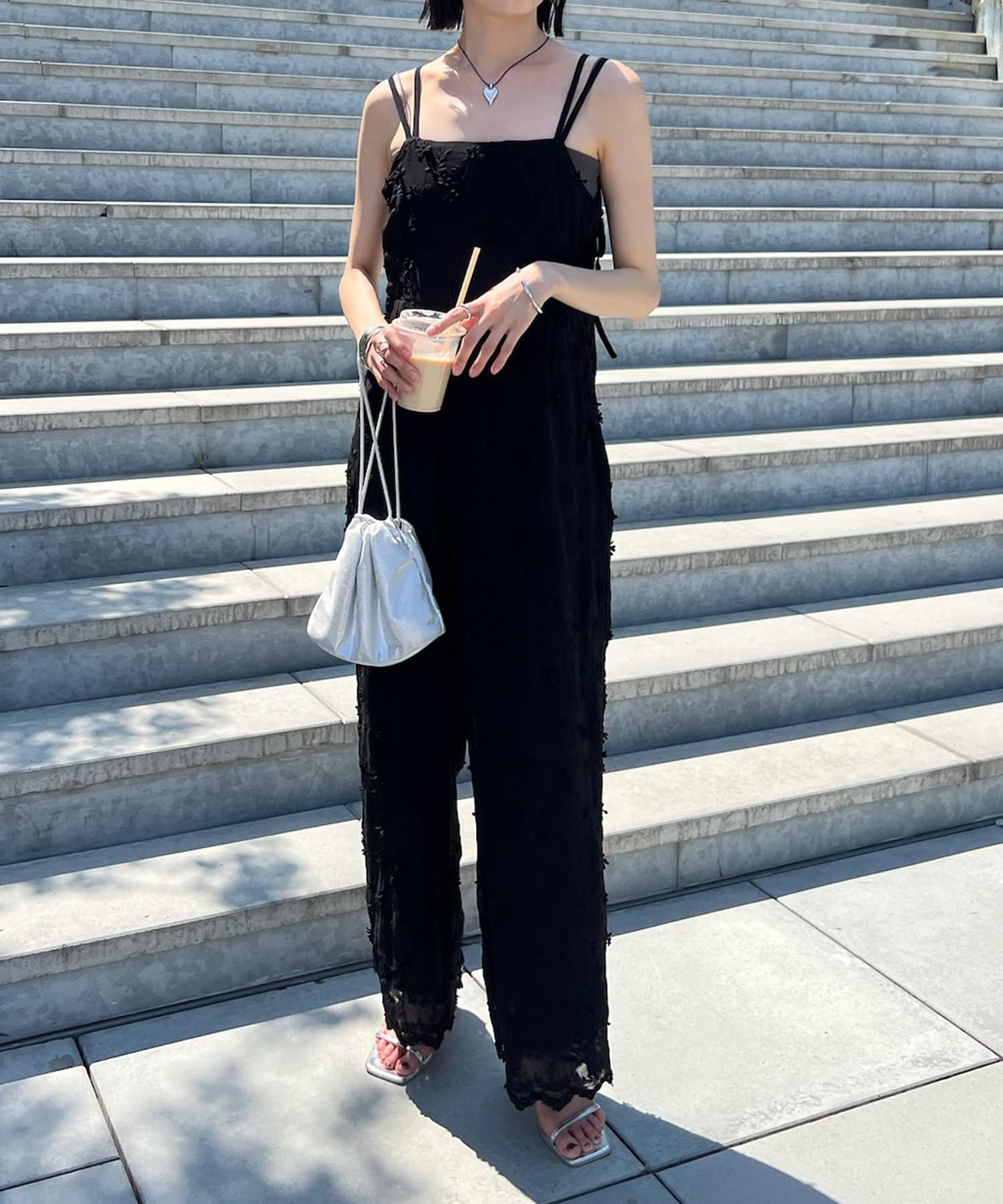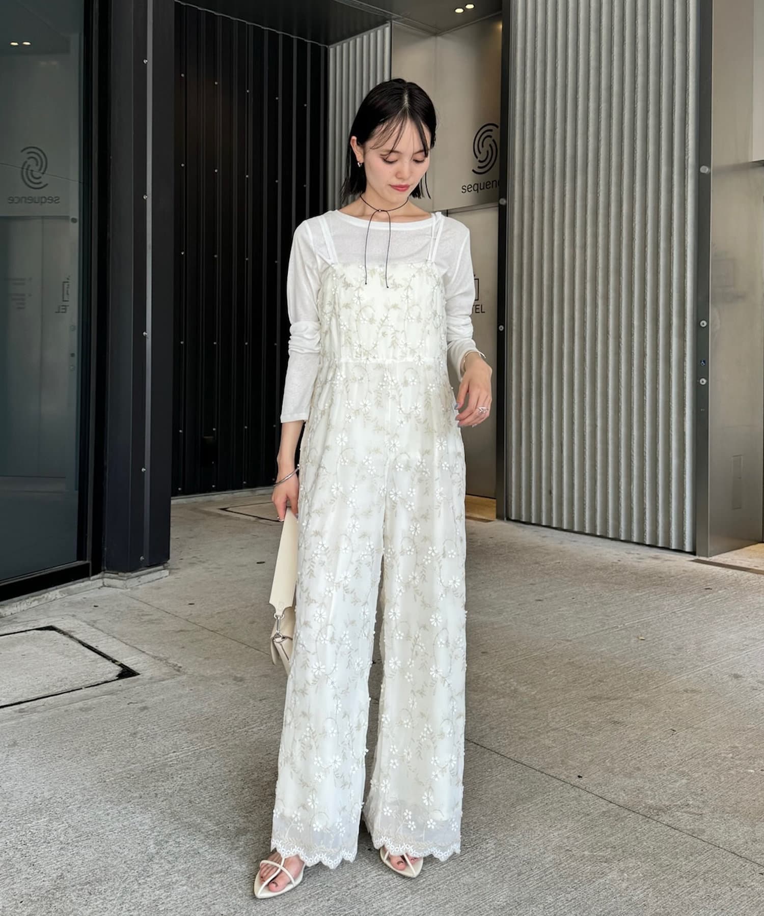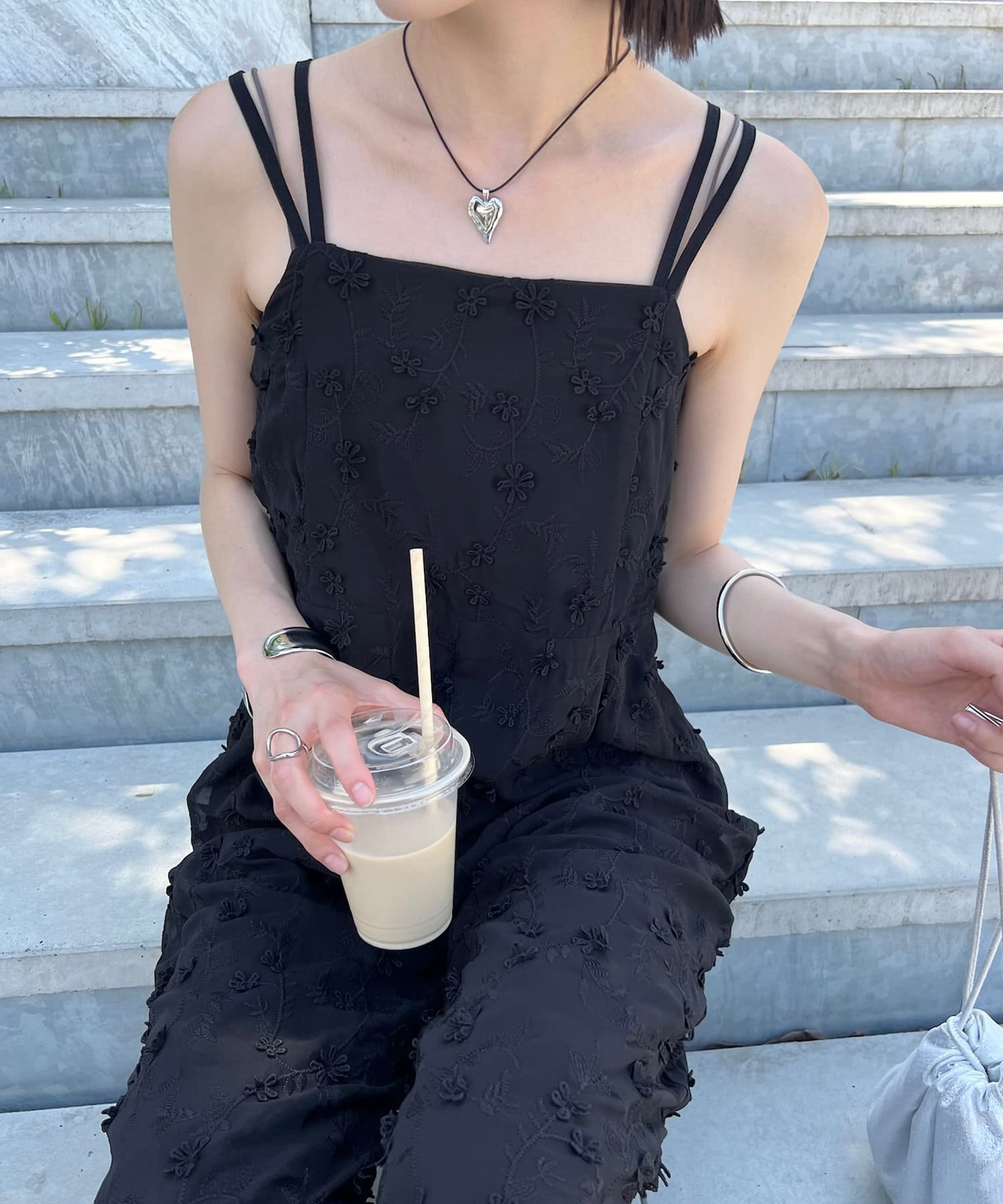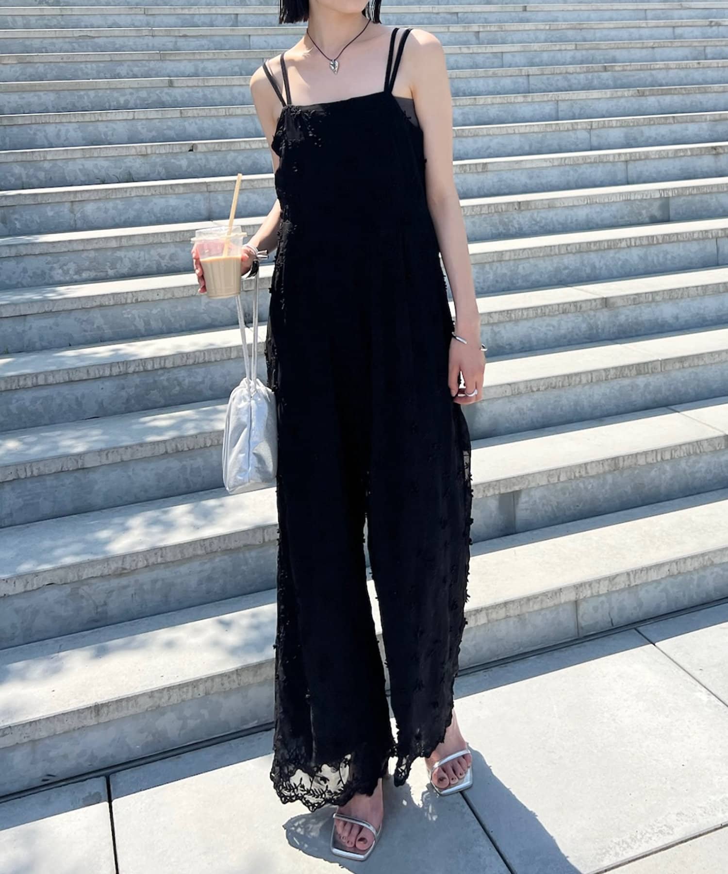 【きらきらの花柄刺繍が映える】フラワー生地サロペット。