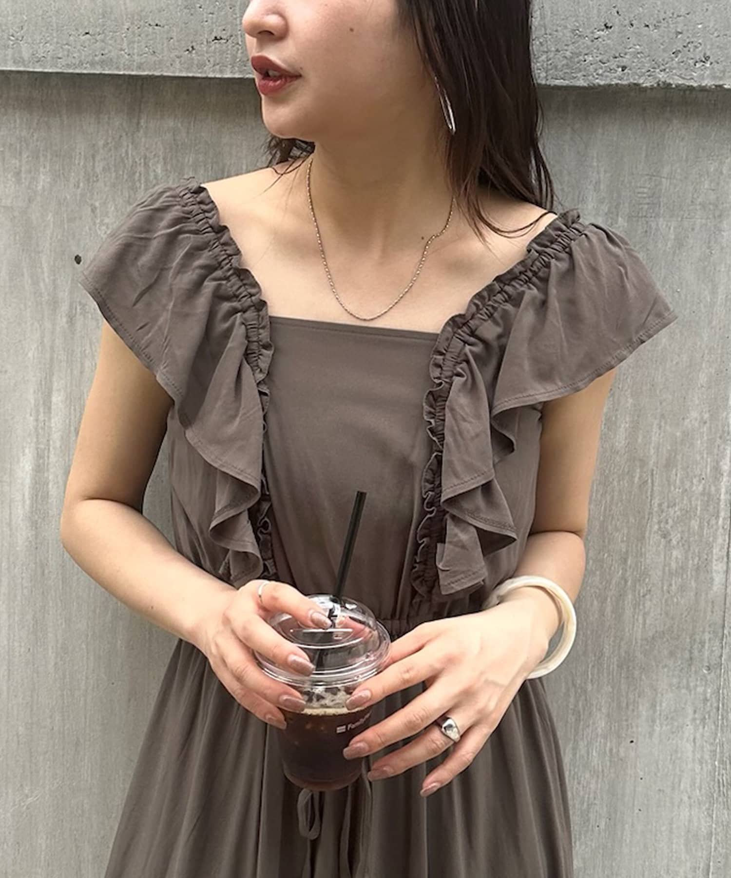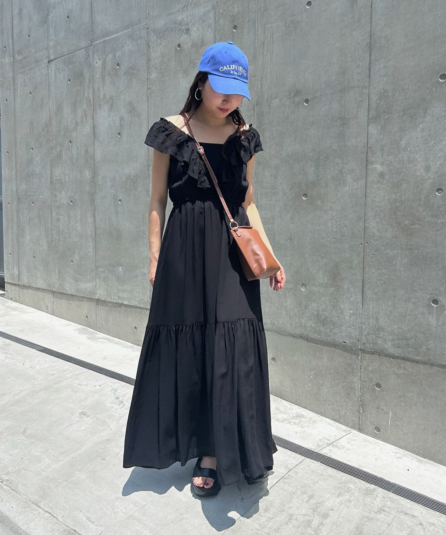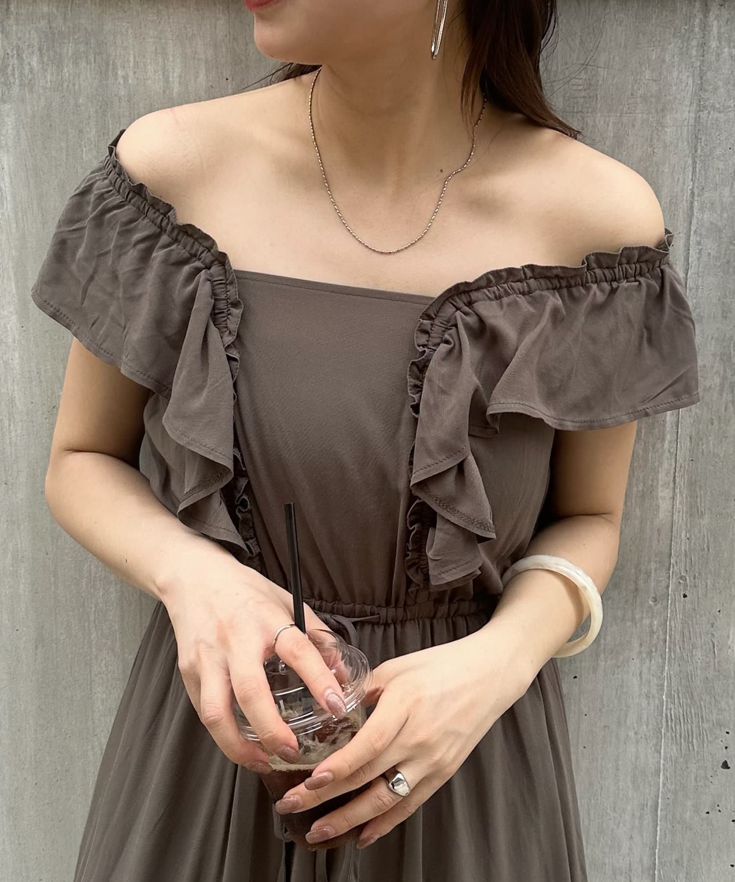 ・肩のフリル部分を下げてオフショルワンピースにもできるのが嬉しいポイント◎