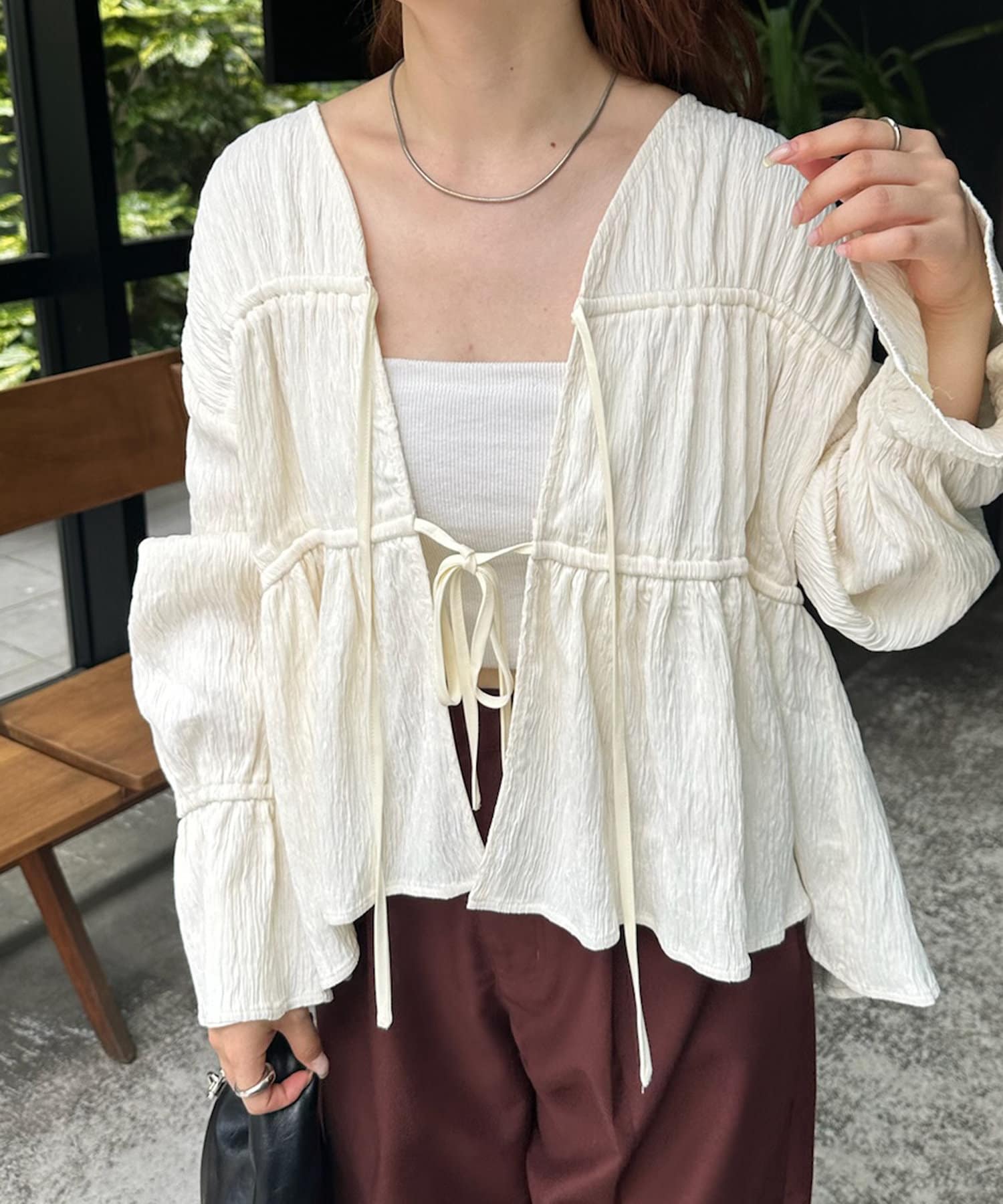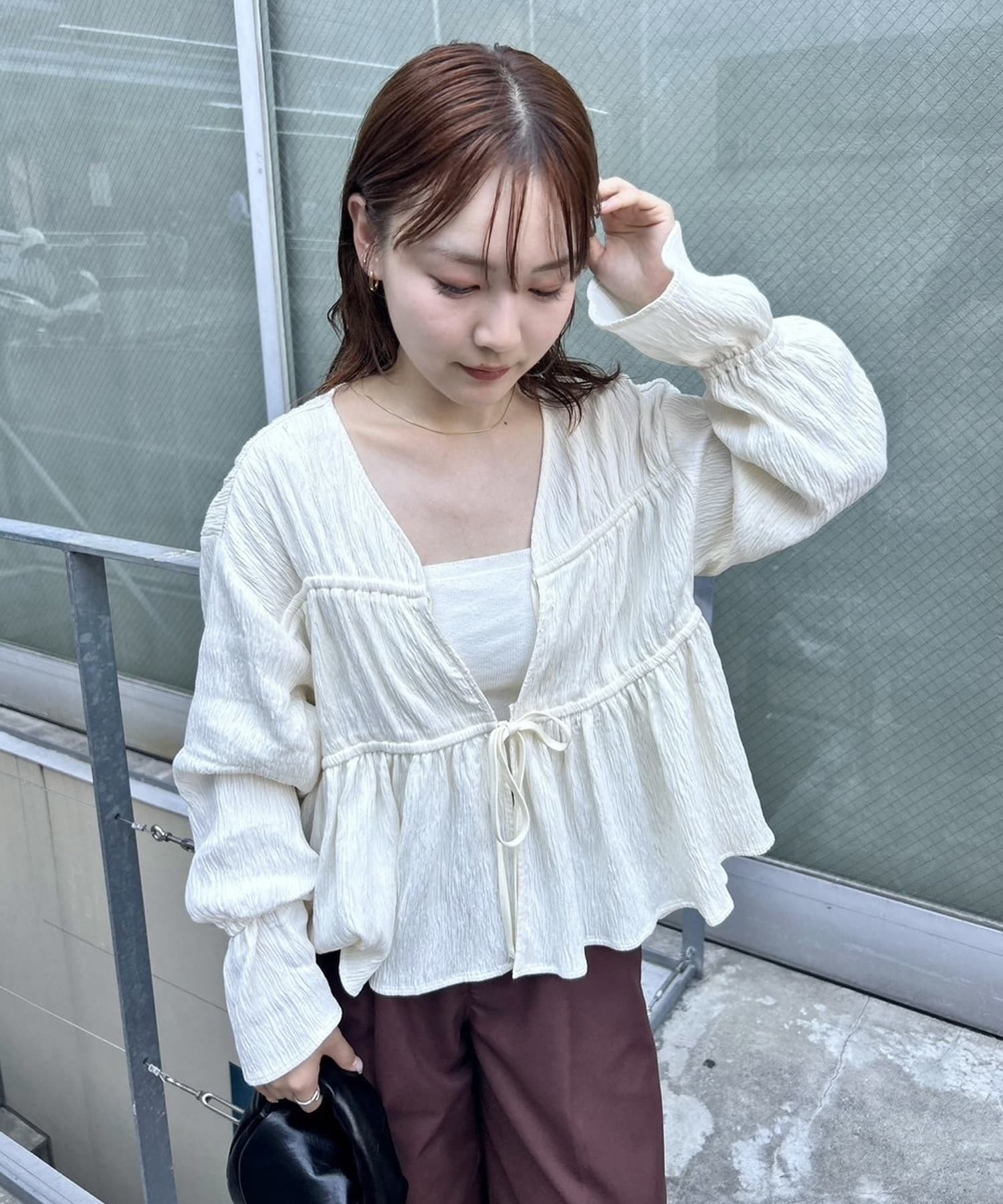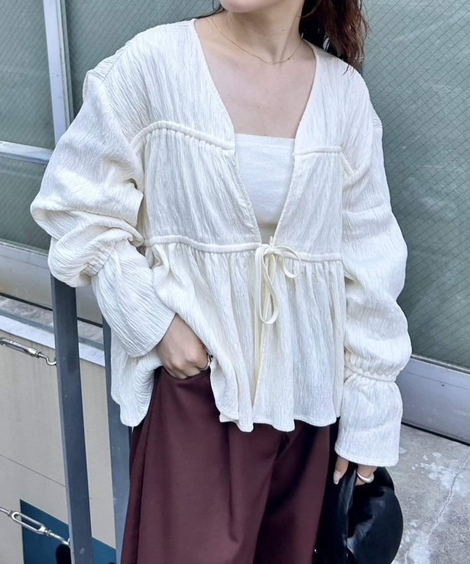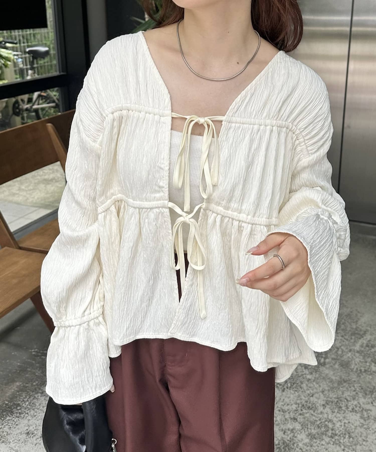 ・袖口の広がるデザインとフロントのリボンで、ふわっと可愛いらしい印象に◎