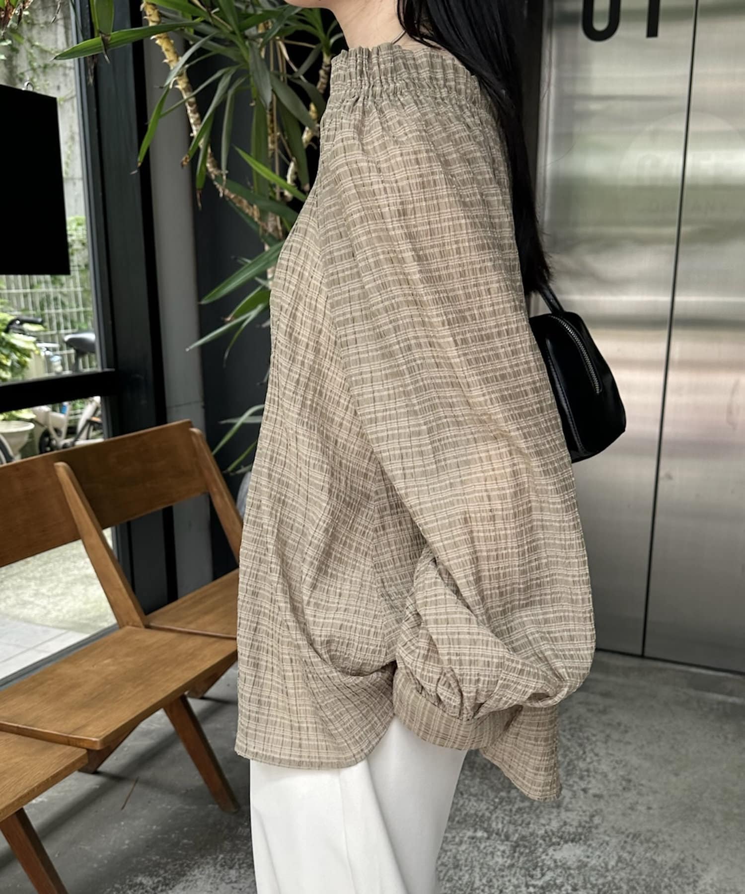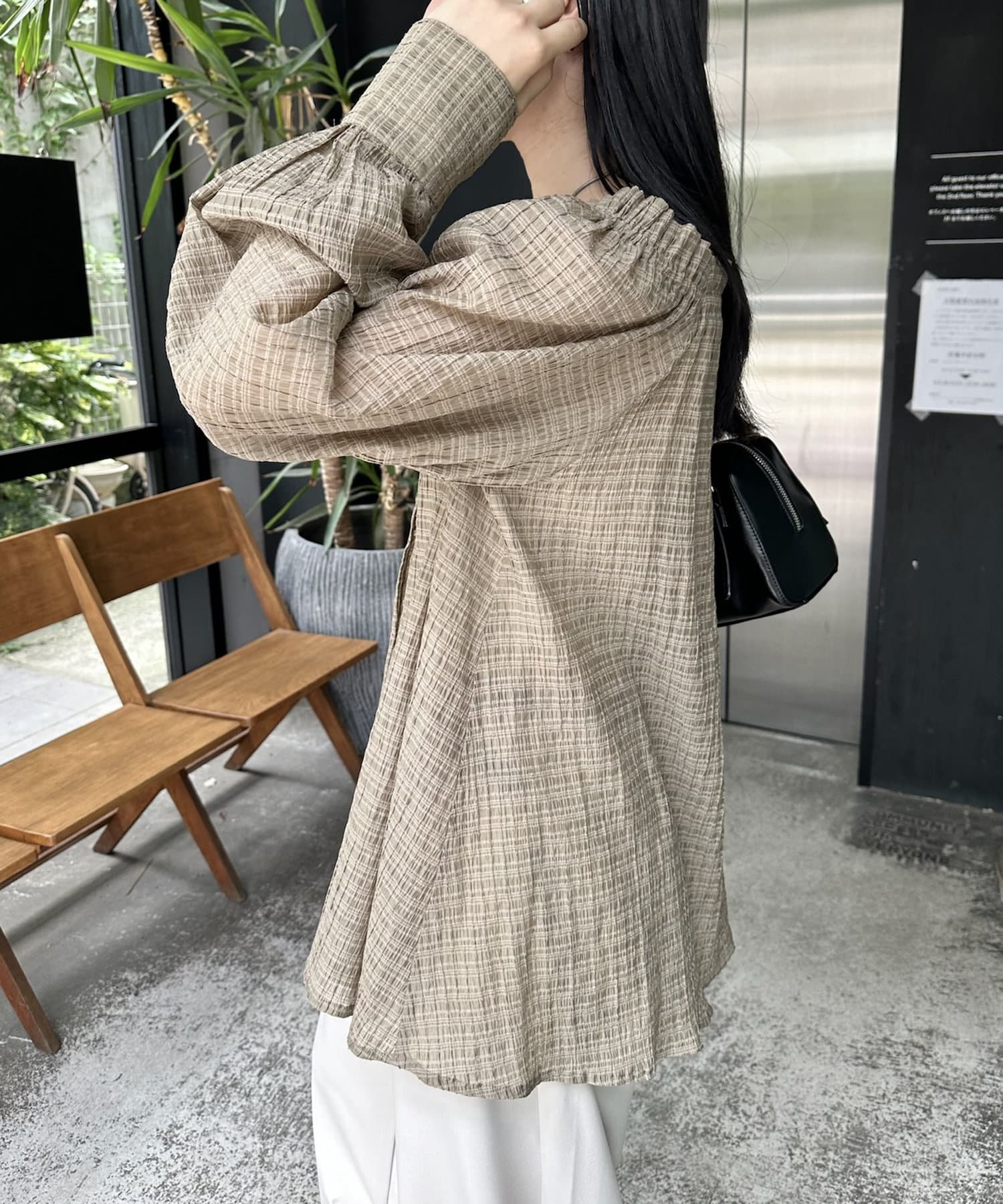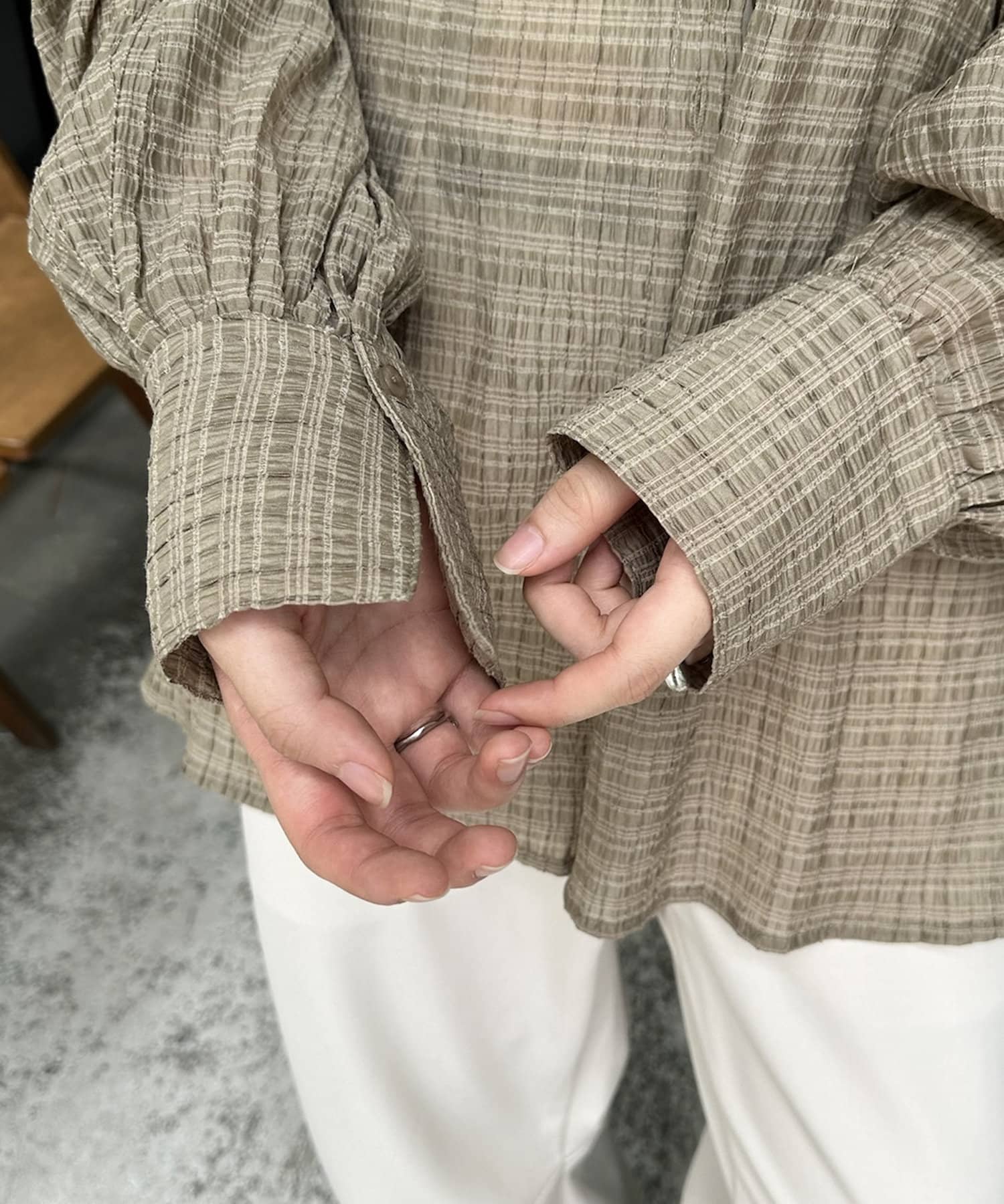 ・表面感のあるチェック柄とほどよいシアー感が魅力的なブラウス。