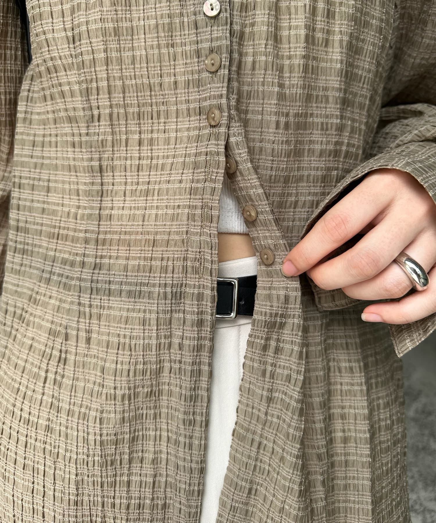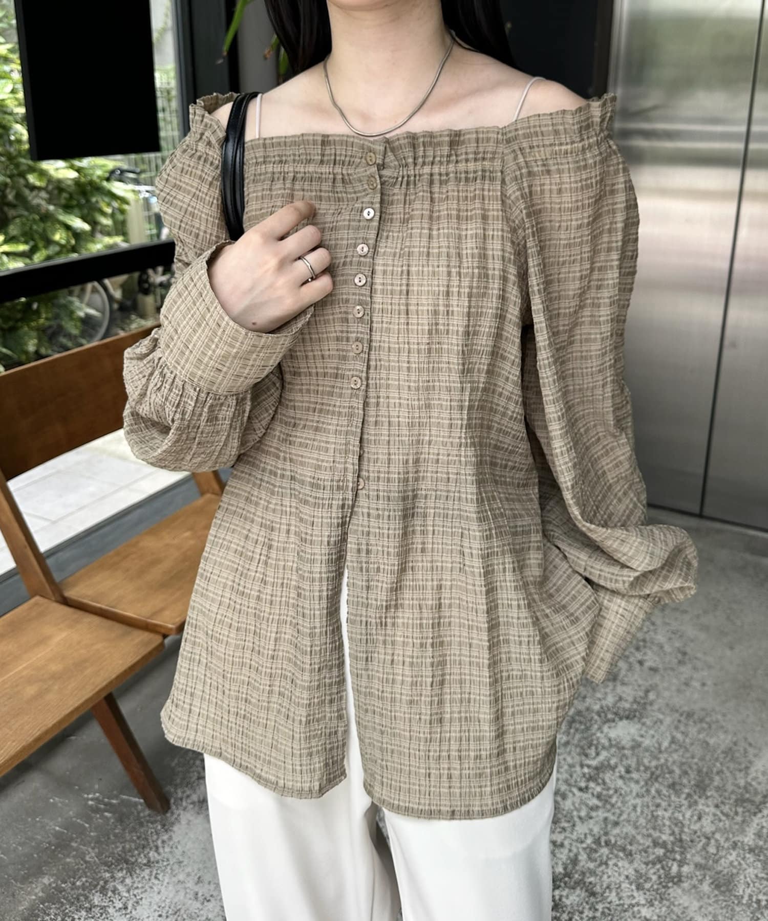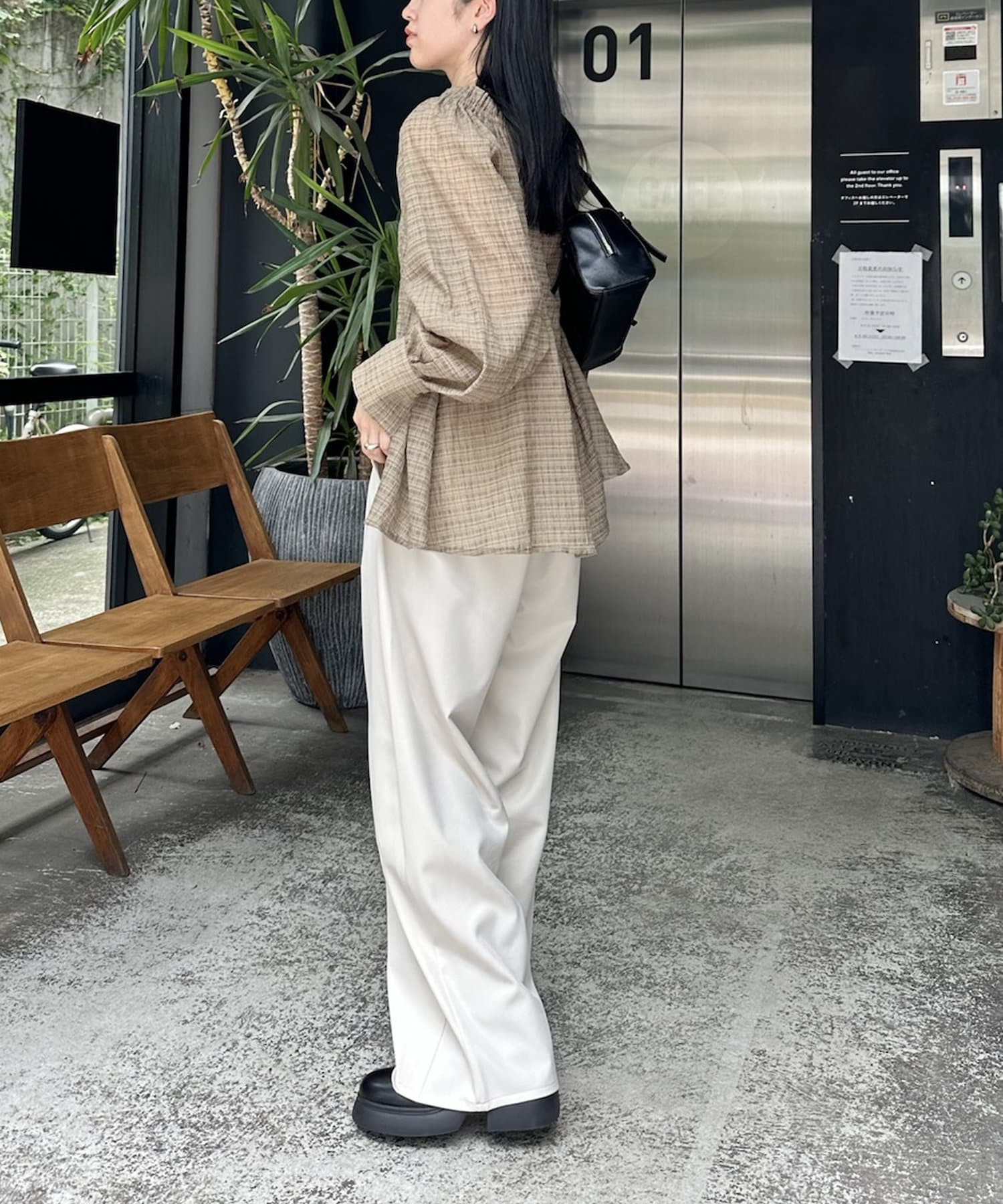 ・表面感のあるチェック柄とほどよいシアー感が魅力的なブラウス。