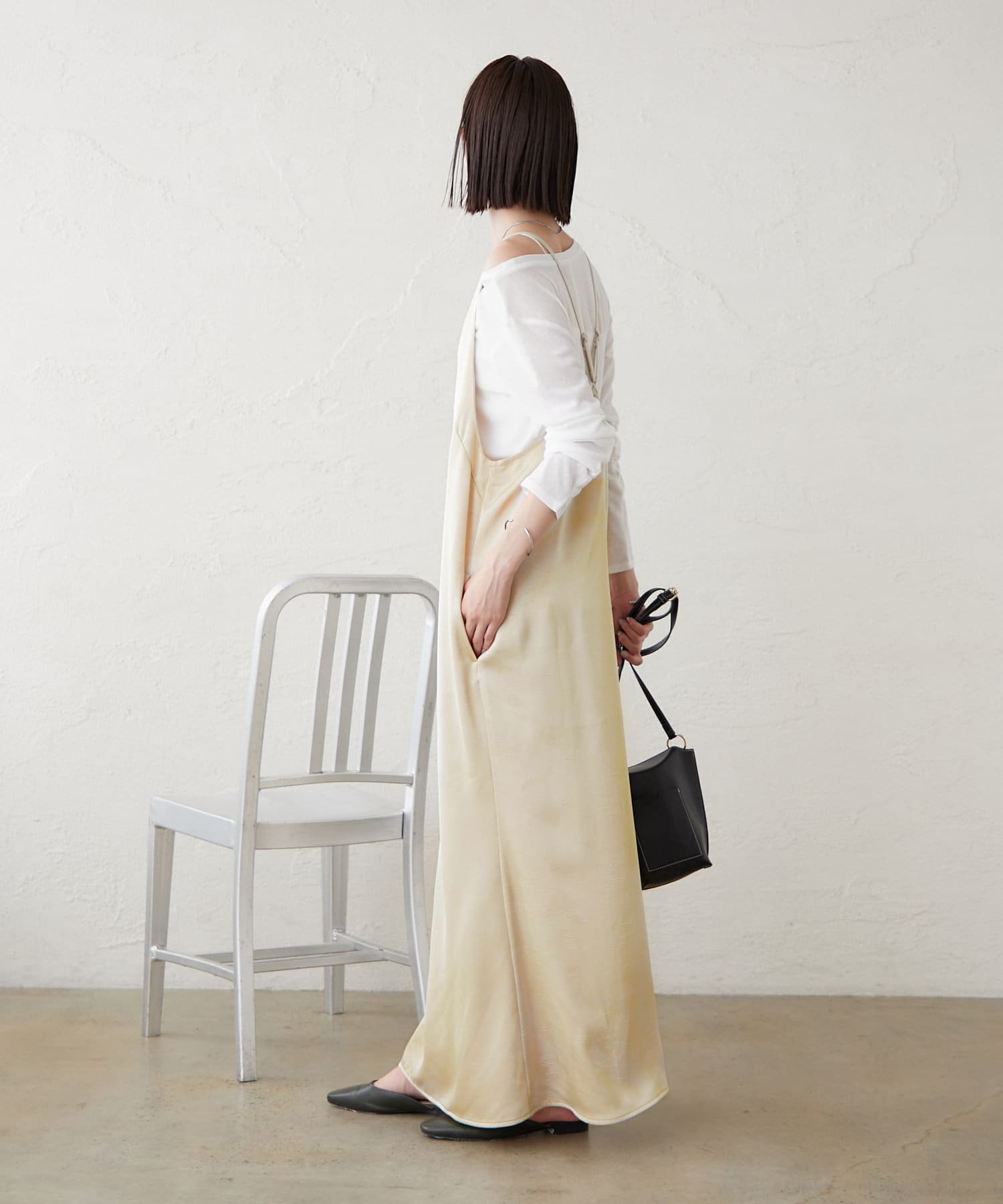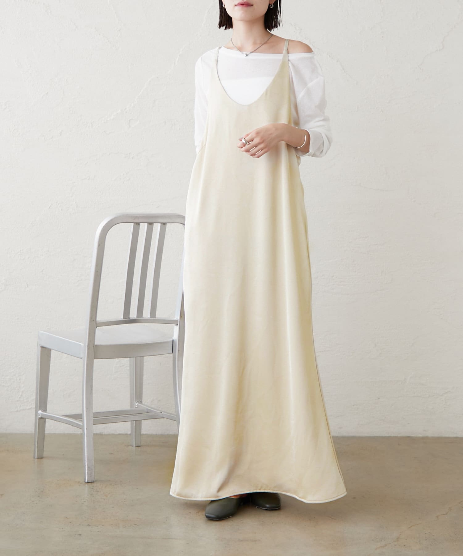・サテン生地でさらっと着られる女性らしい印象のキャミワンピ―ス。