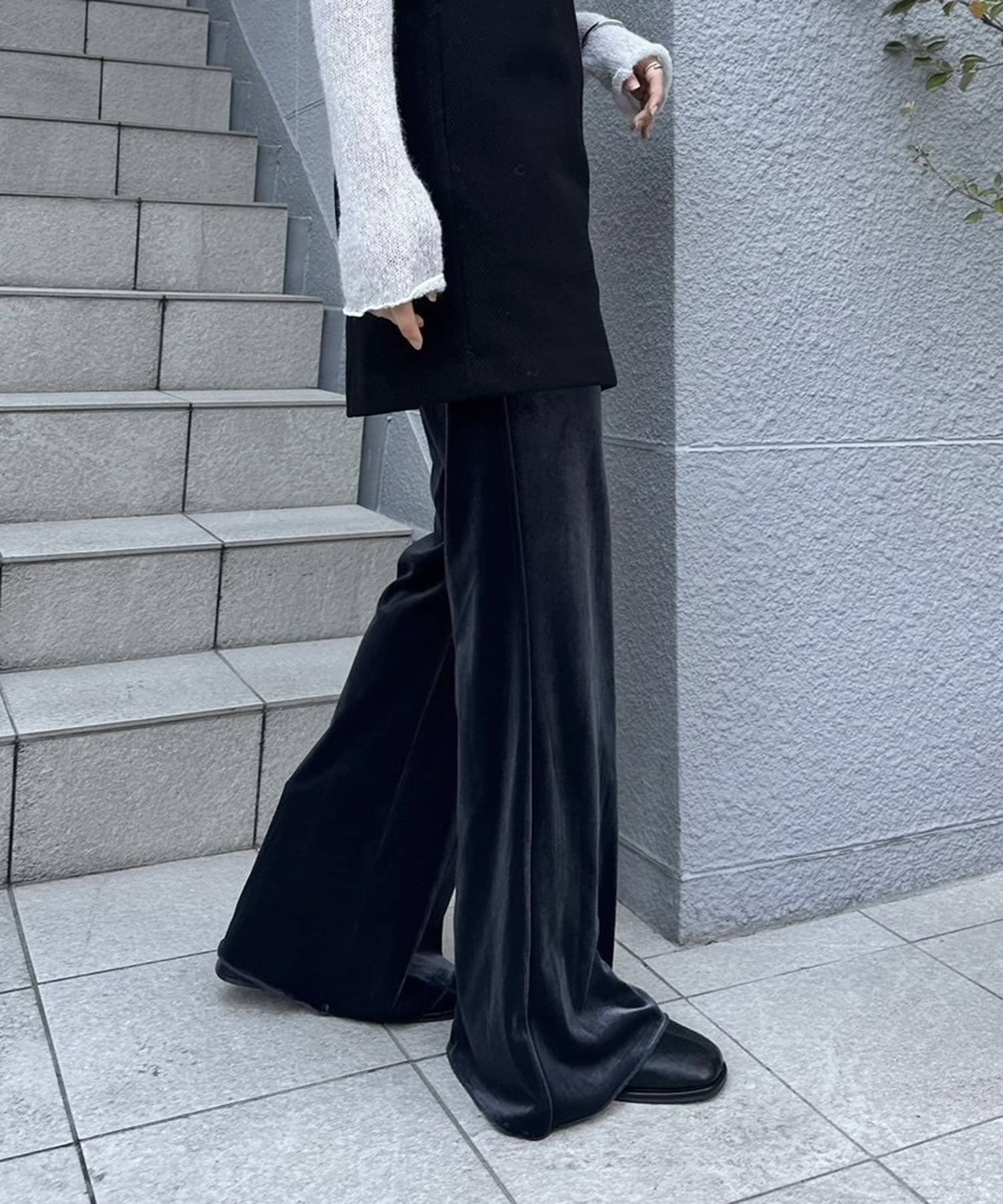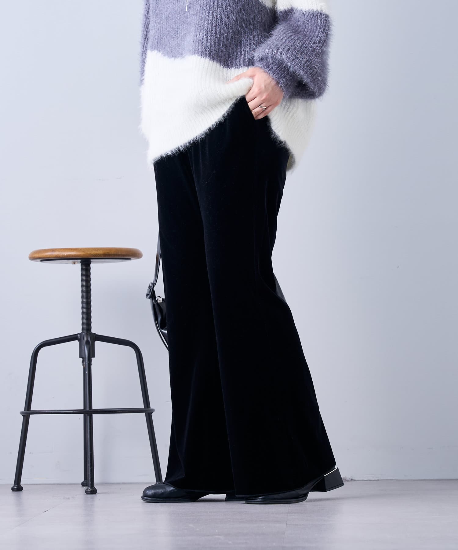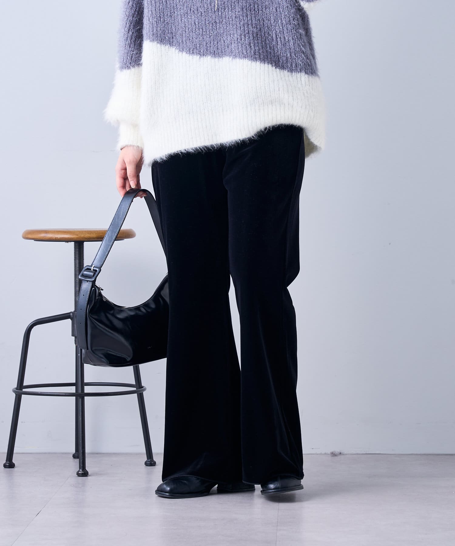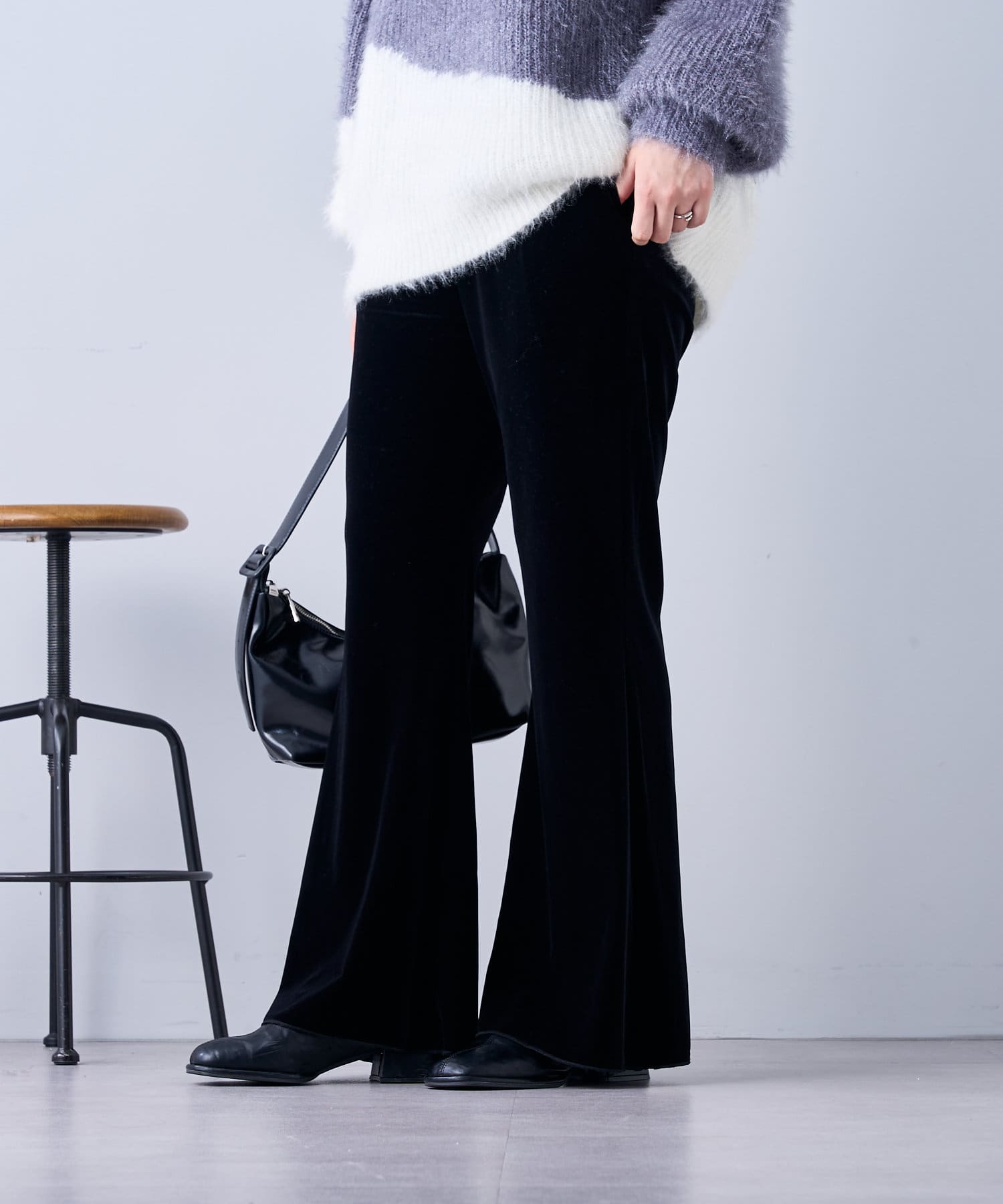 ・ツヤッとしたベロア素材がコーディネートの主役にもなるフレアパンツ。