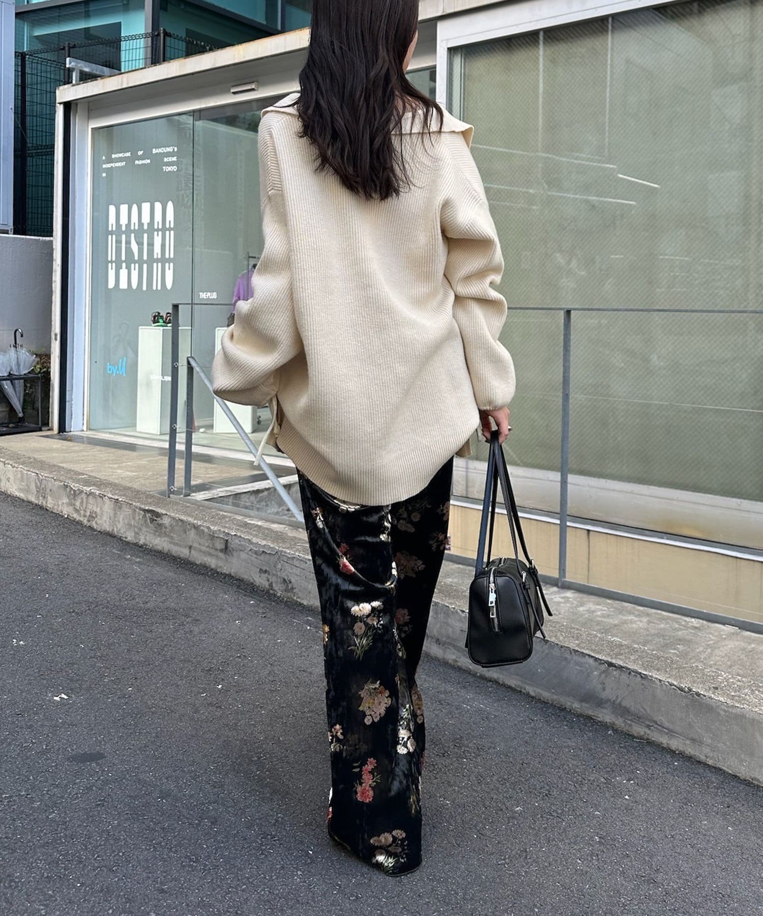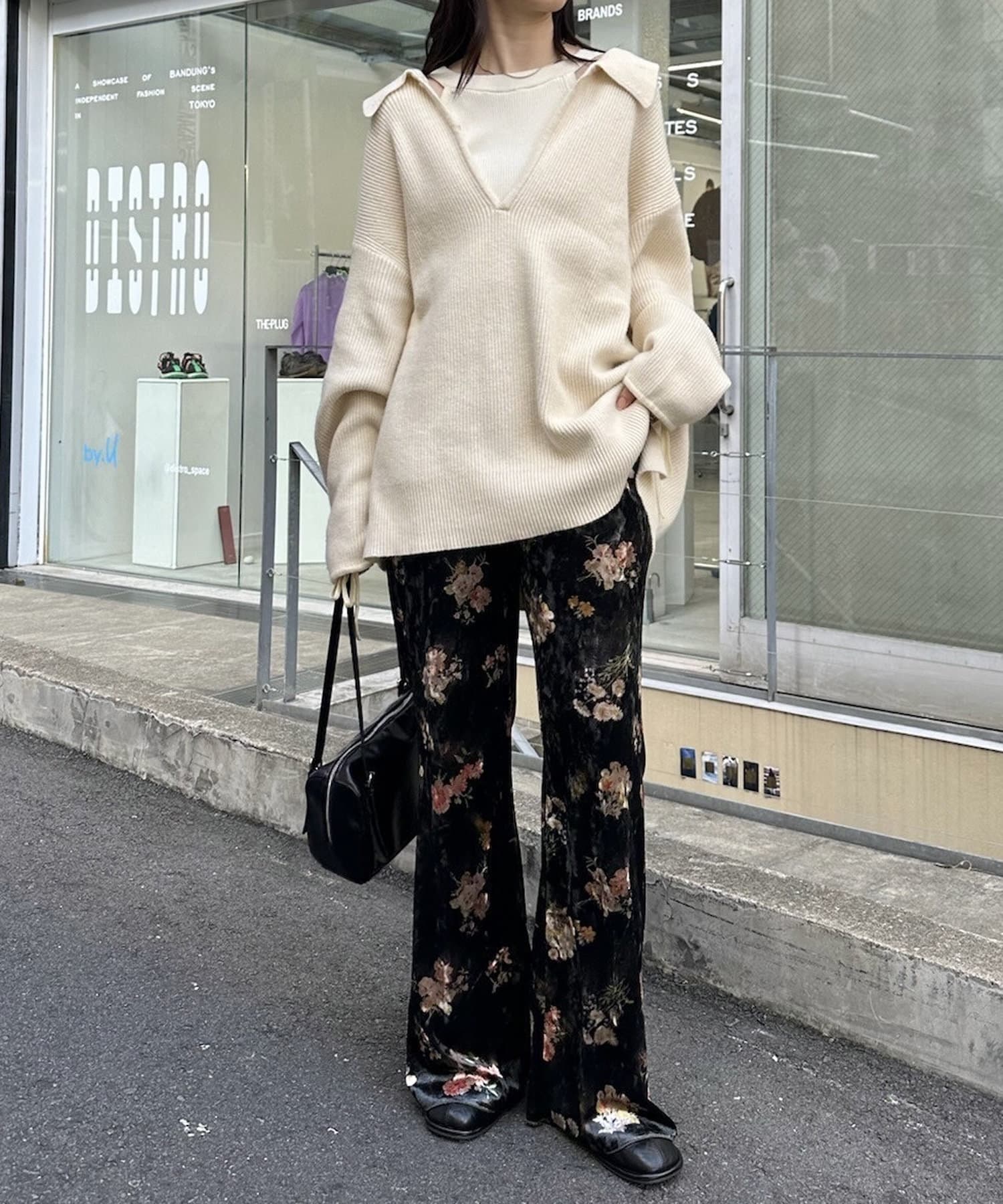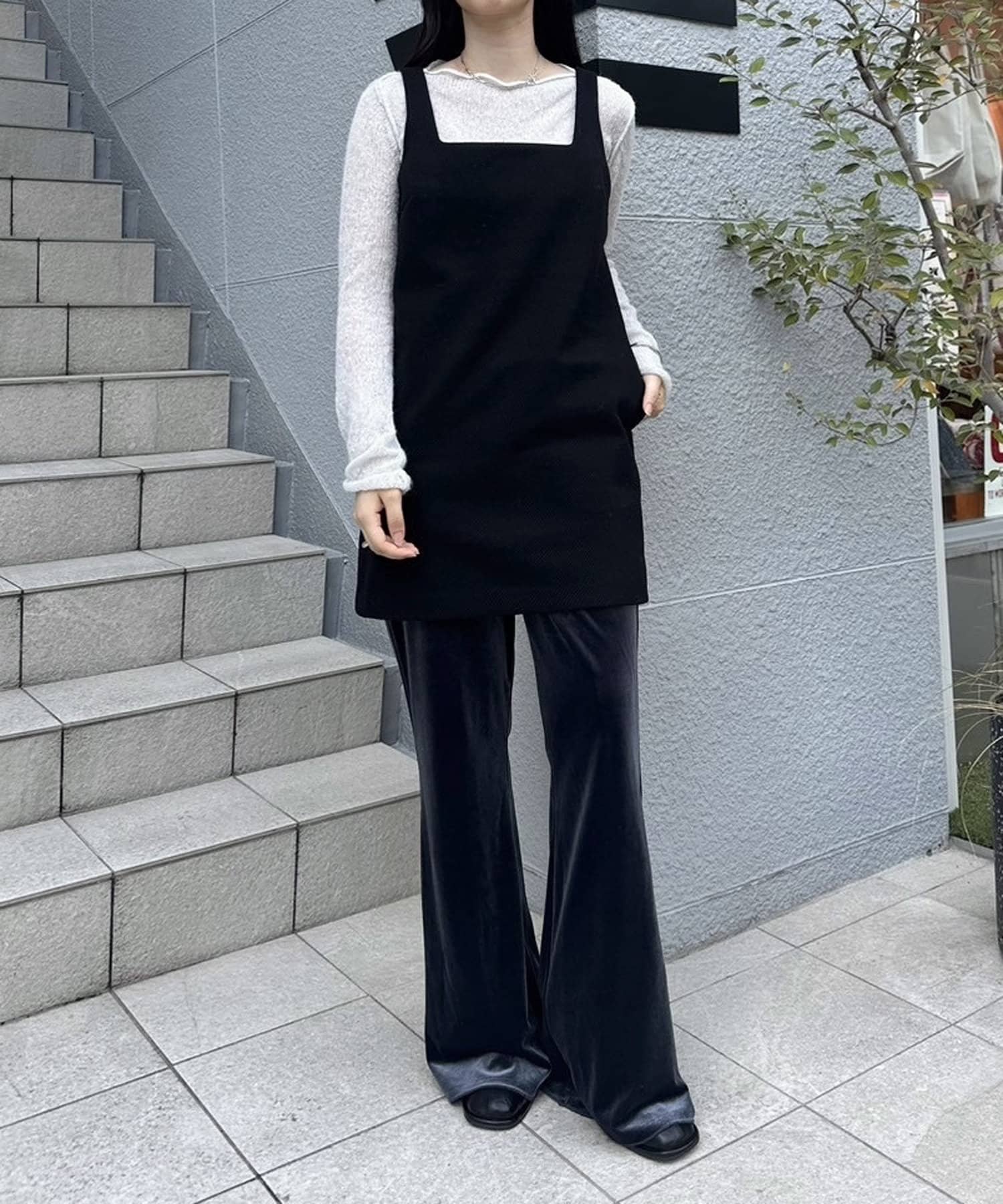 ・細身のシルエットのボトムスなので、トップスはアウトスタイルでバランスよく決まります!