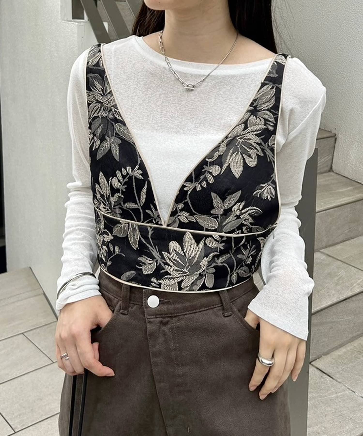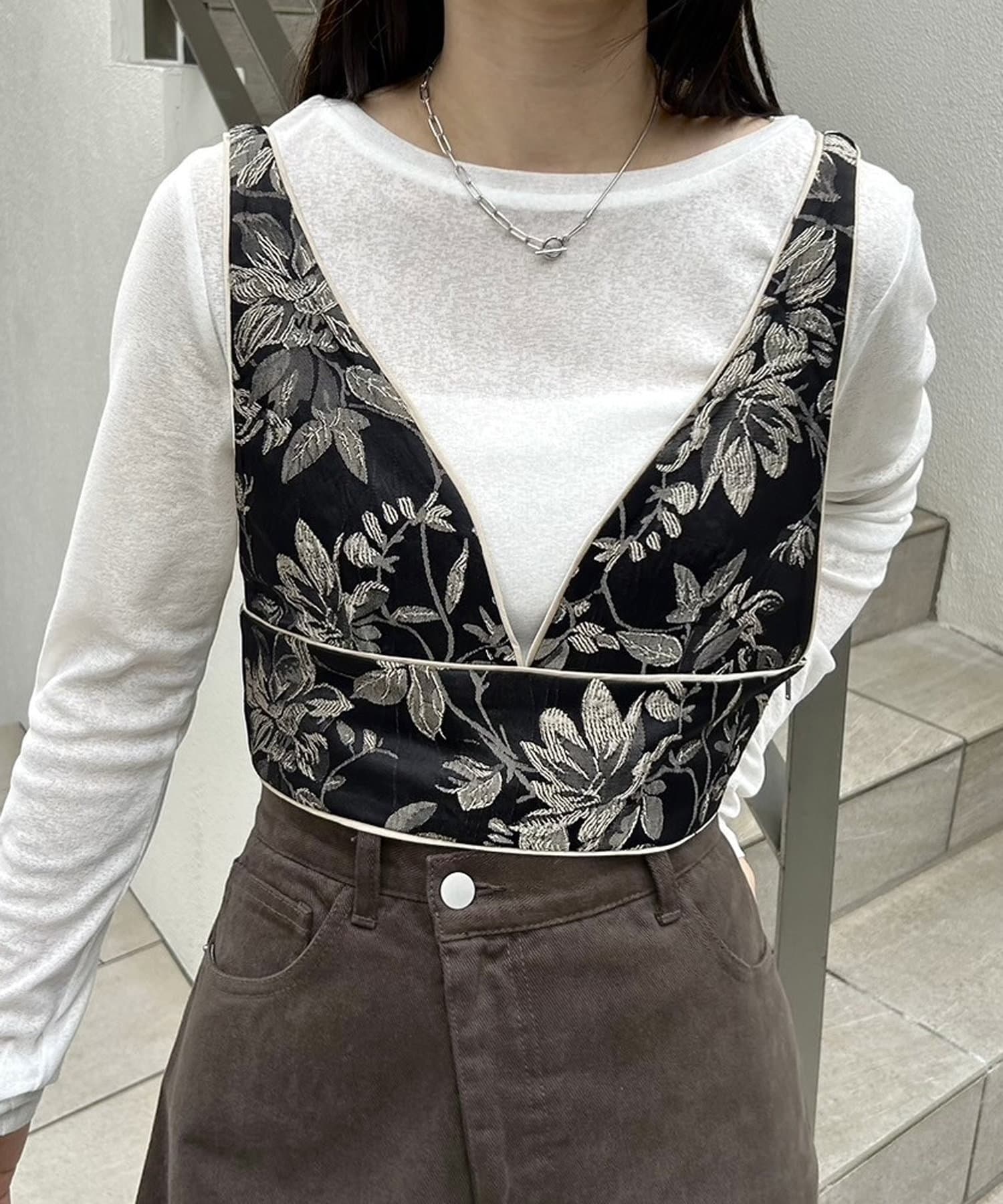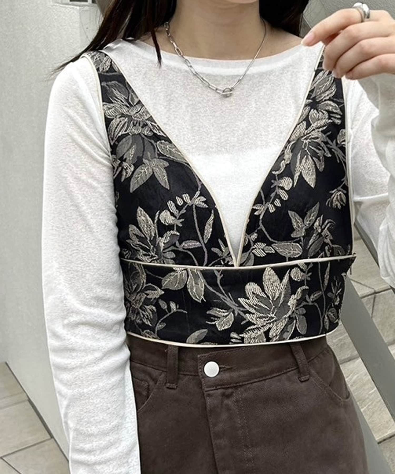 ・ハリ感のある上品な素材と全体に施された花柄が魅力的なジャガードビスチェ。