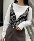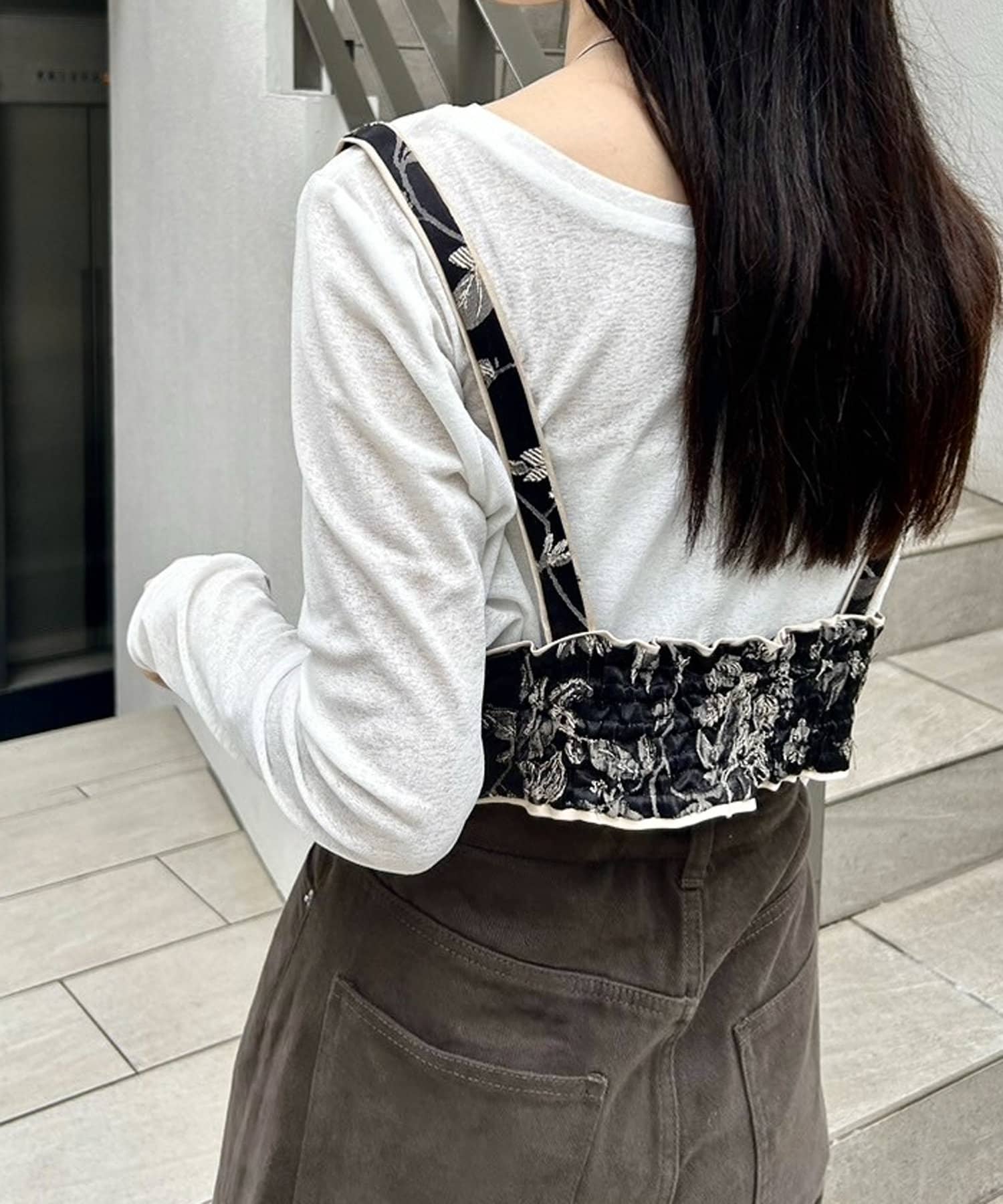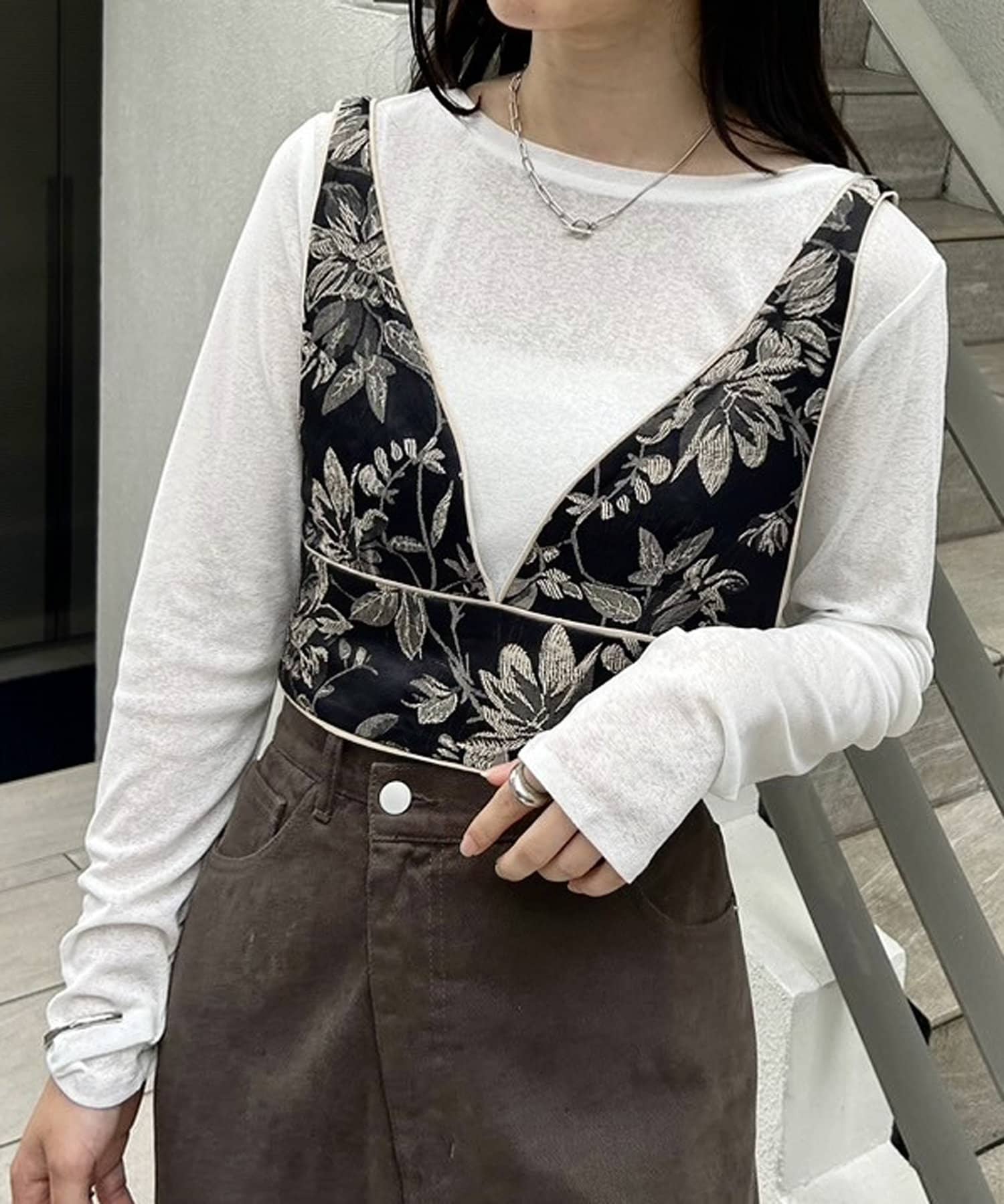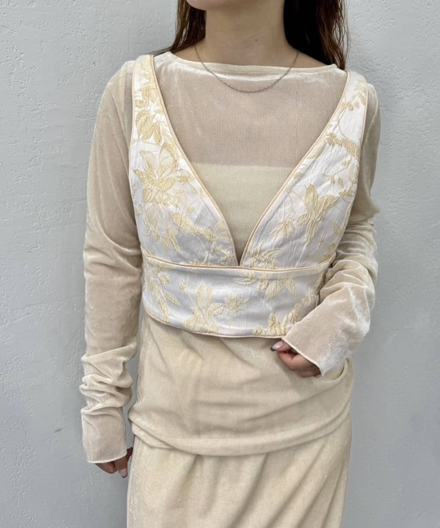 ・ハリ感のある上品な素材と全体に施された花柄が魅力的なジャガードビスチェ。