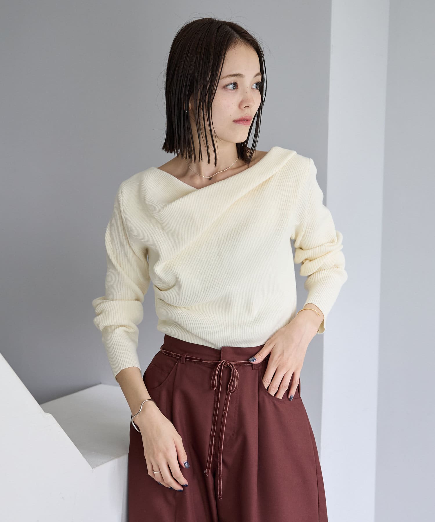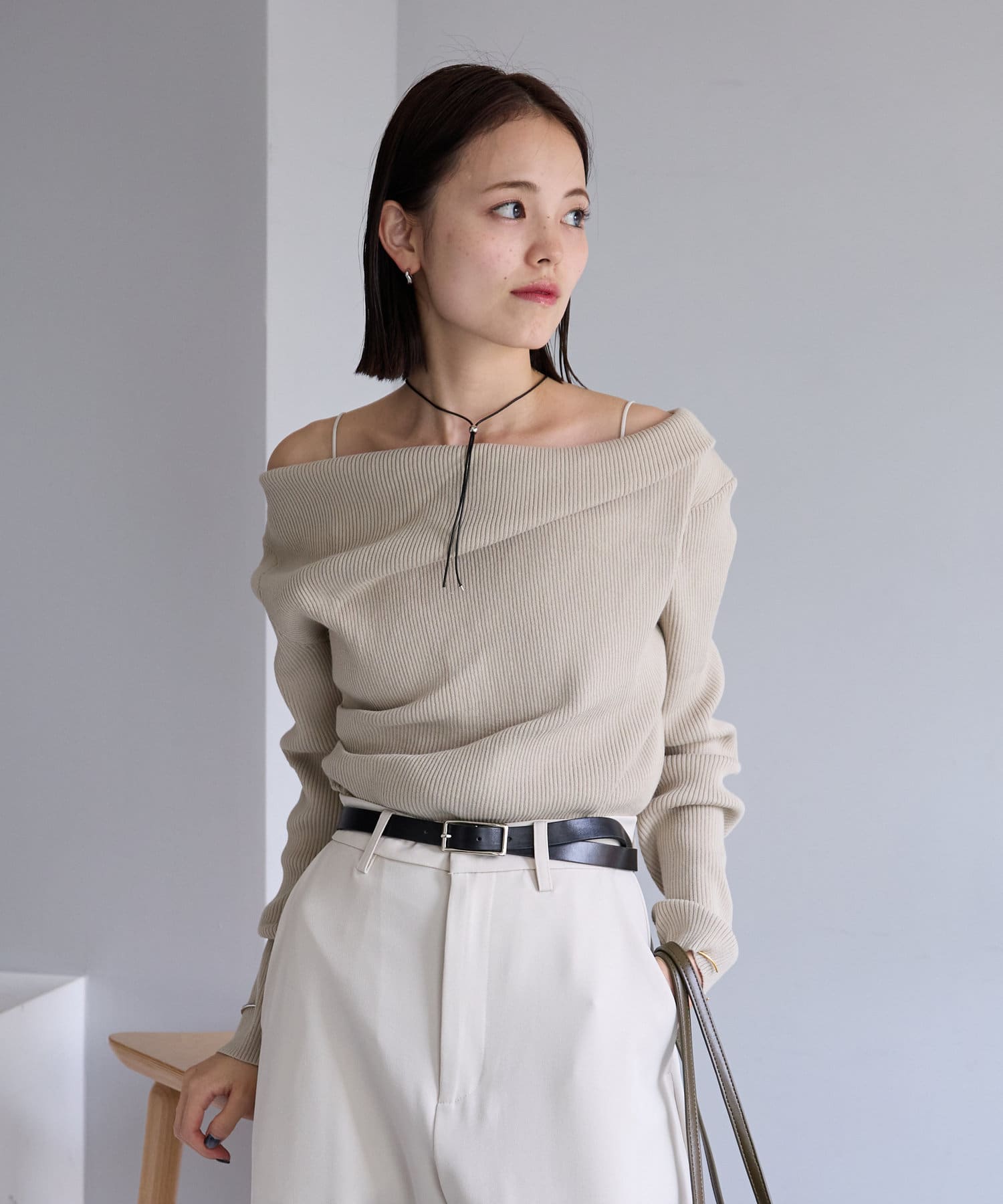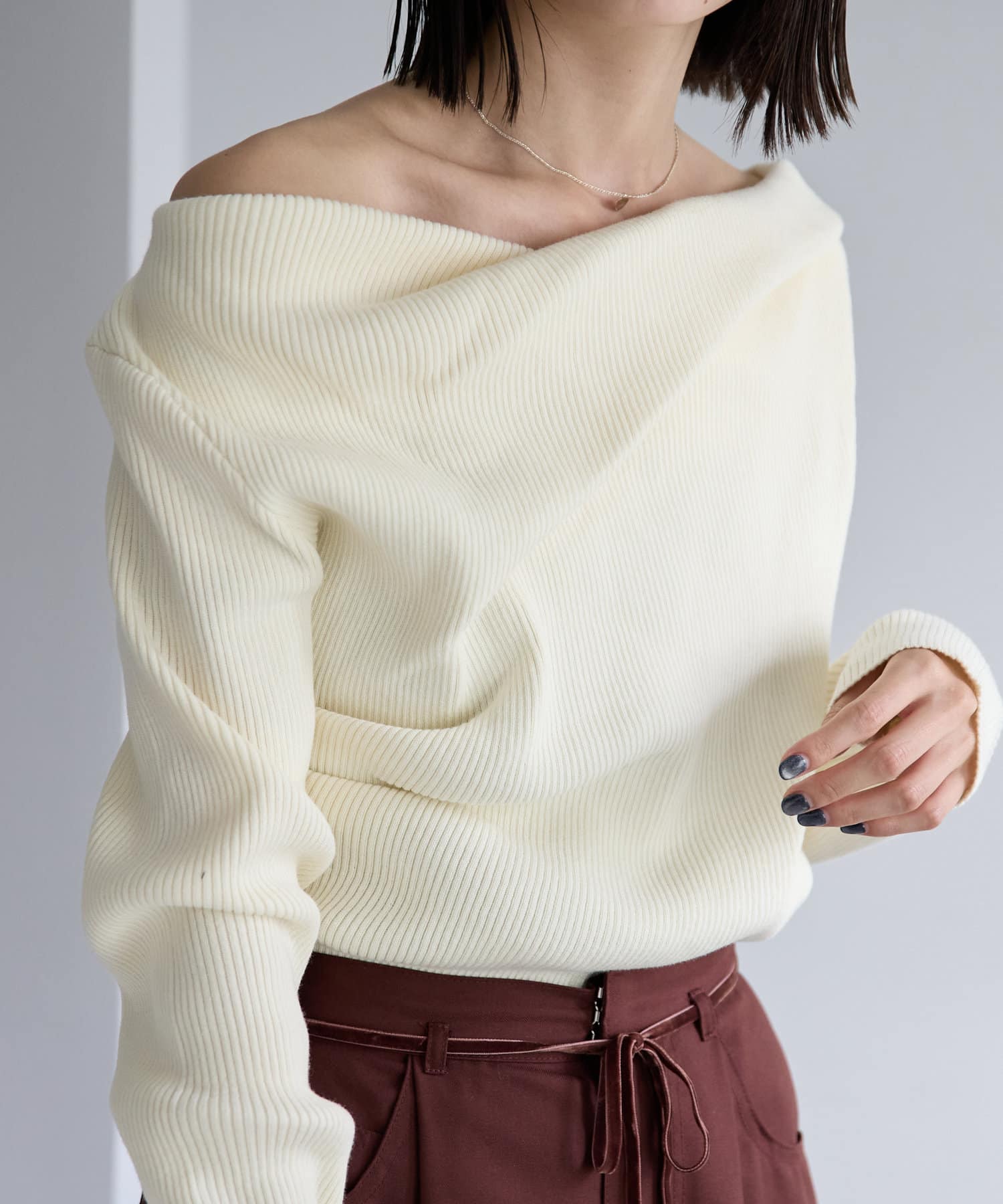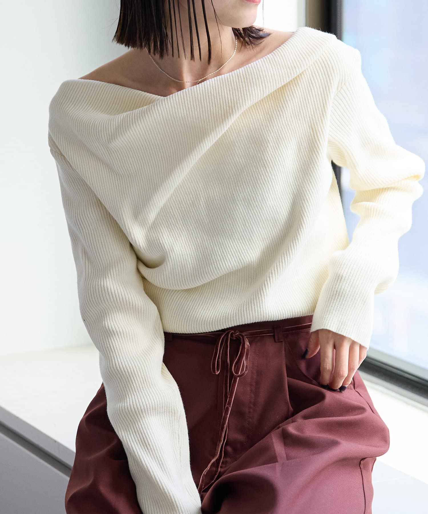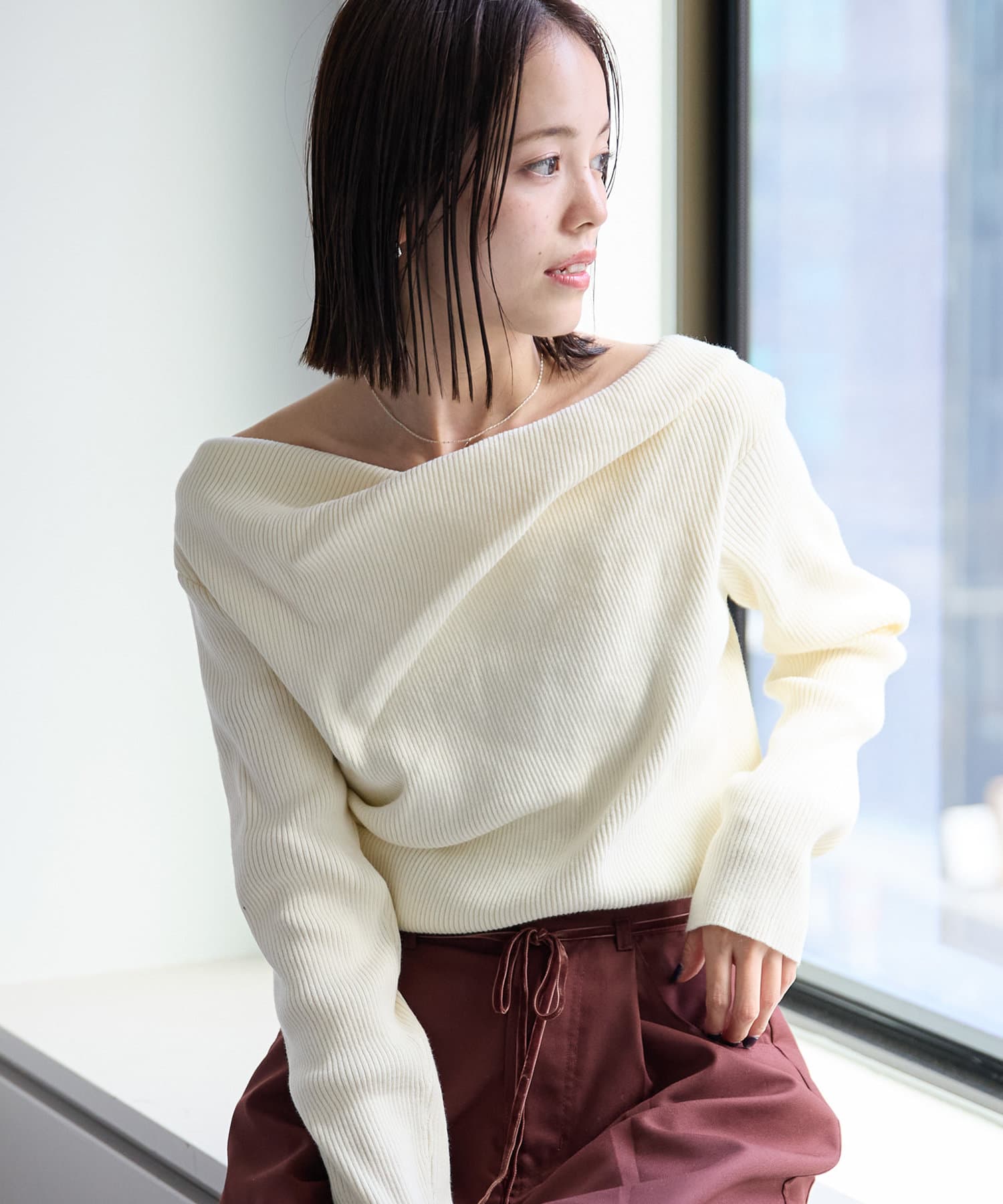 ・オフショルデザインが目を惹く女性らしい印象のリブニット。