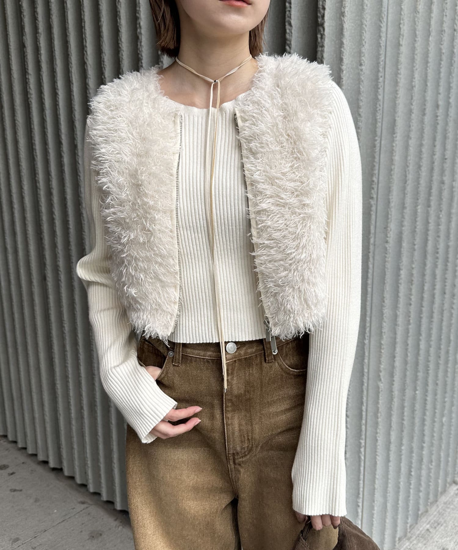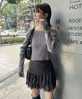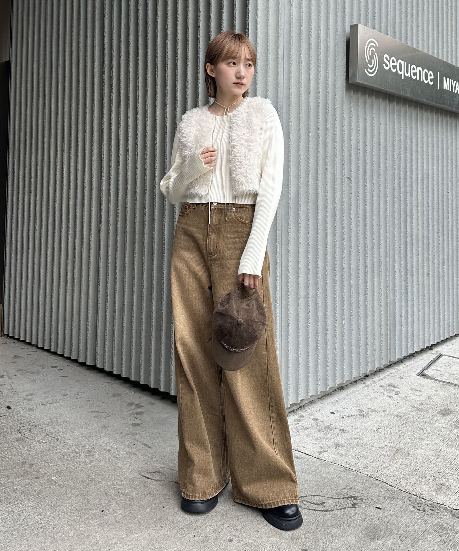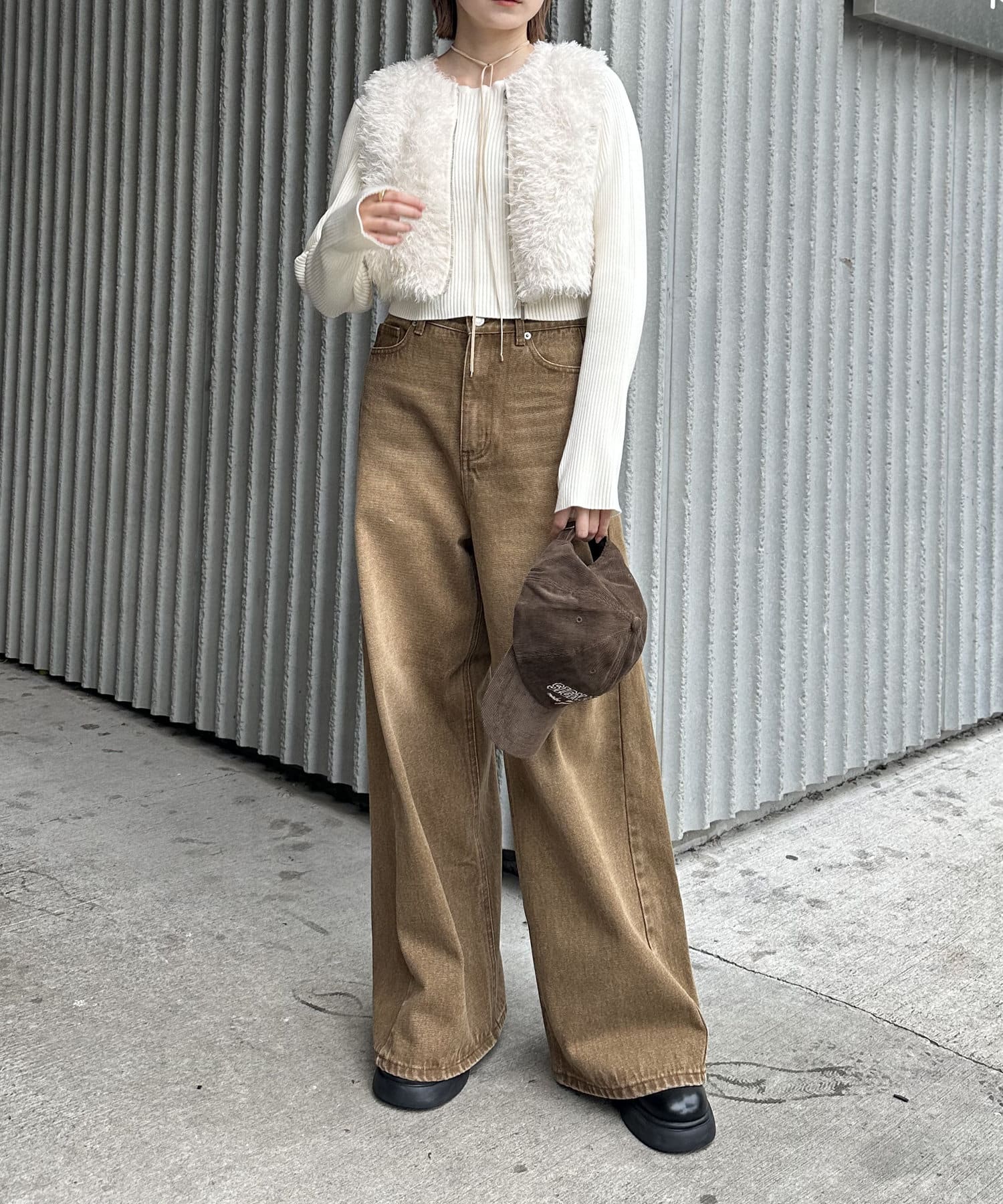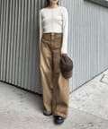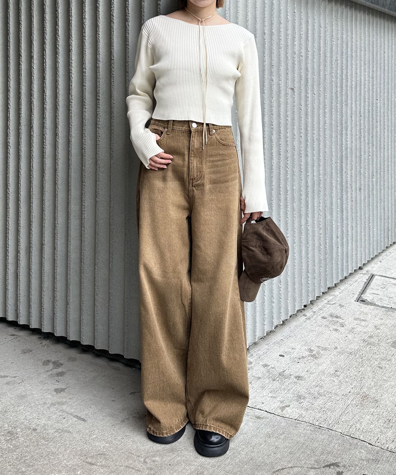 ・コンパクトなトップスなので、ワイドシルエットのボトムス合わせでトレンド感あるスタイリングに!