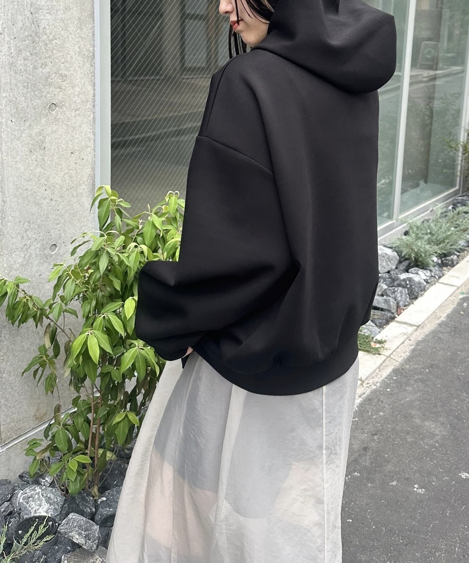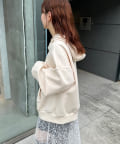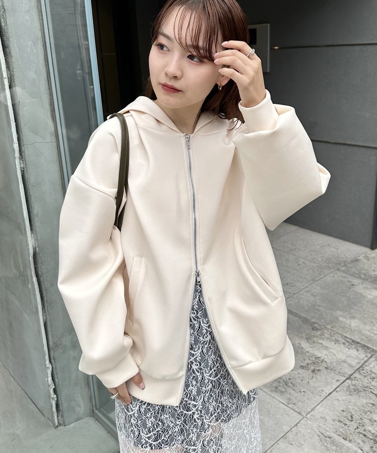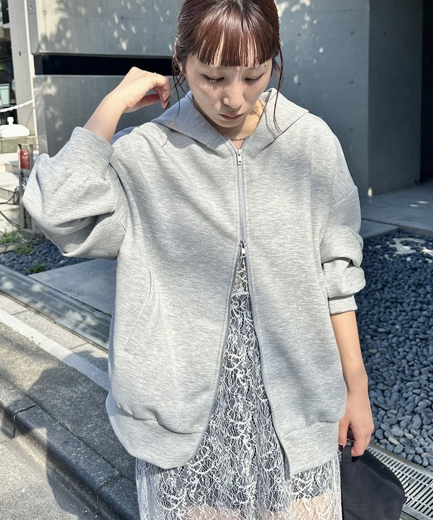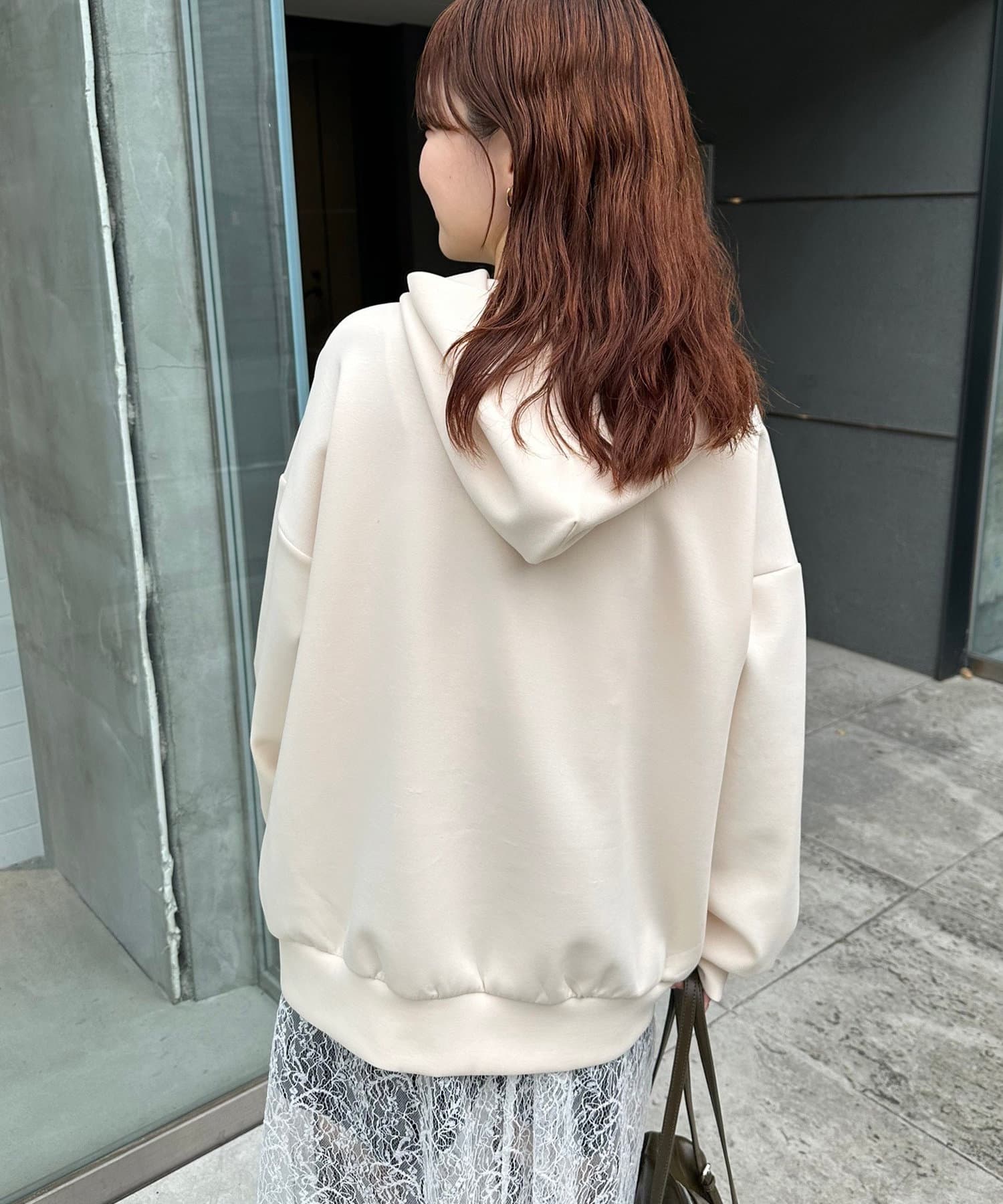 オーバーサイズのパーカーで女性らしい印象で着られるパーカー。