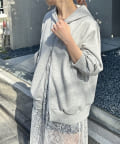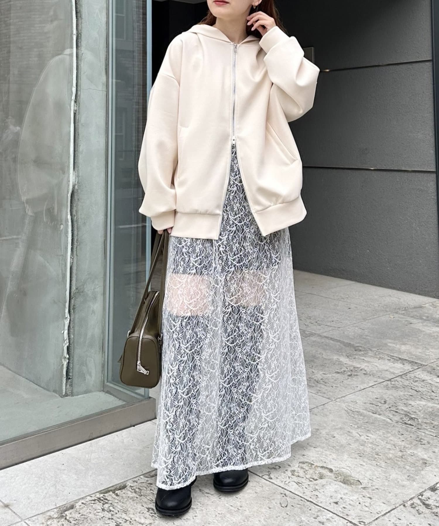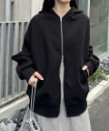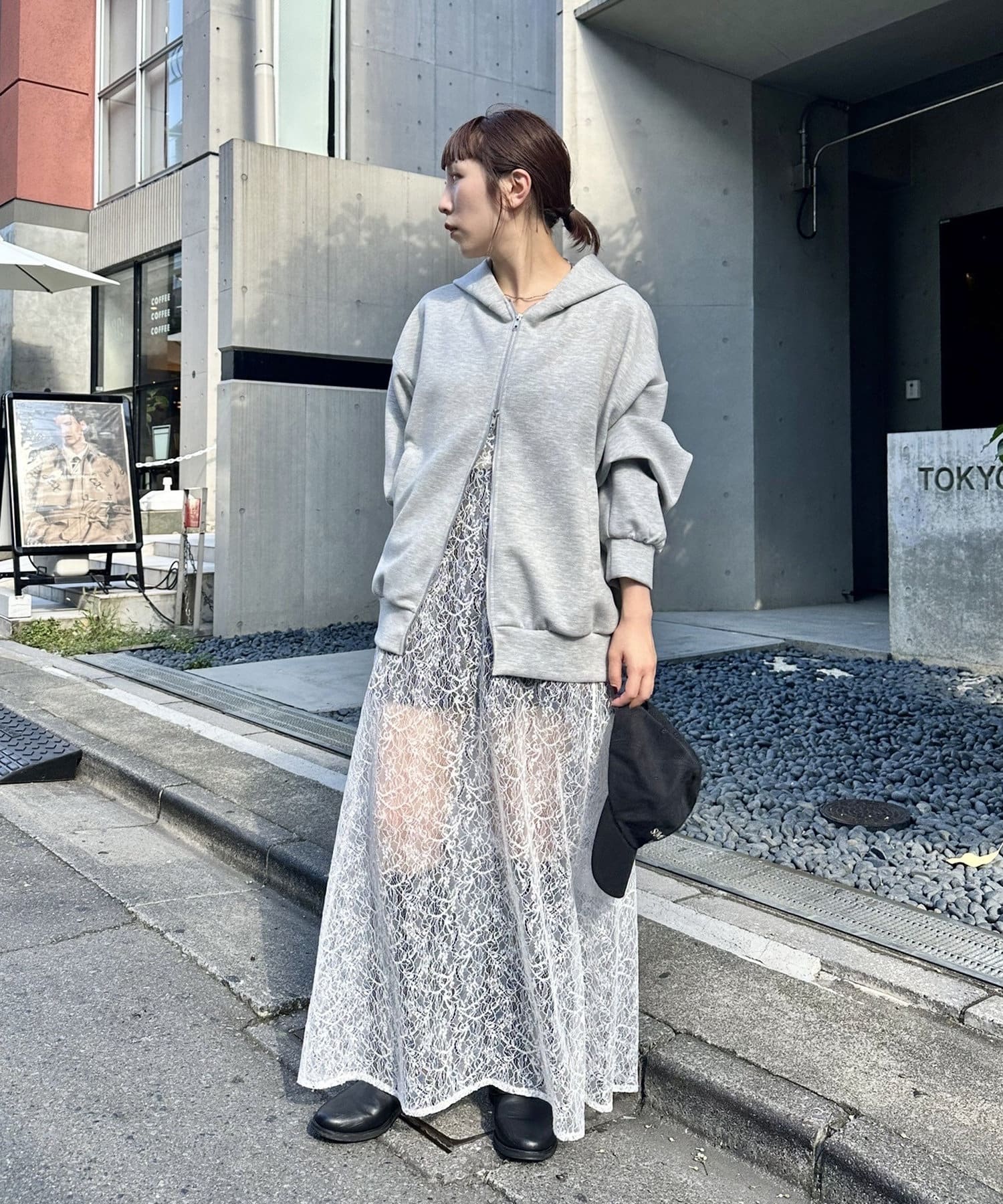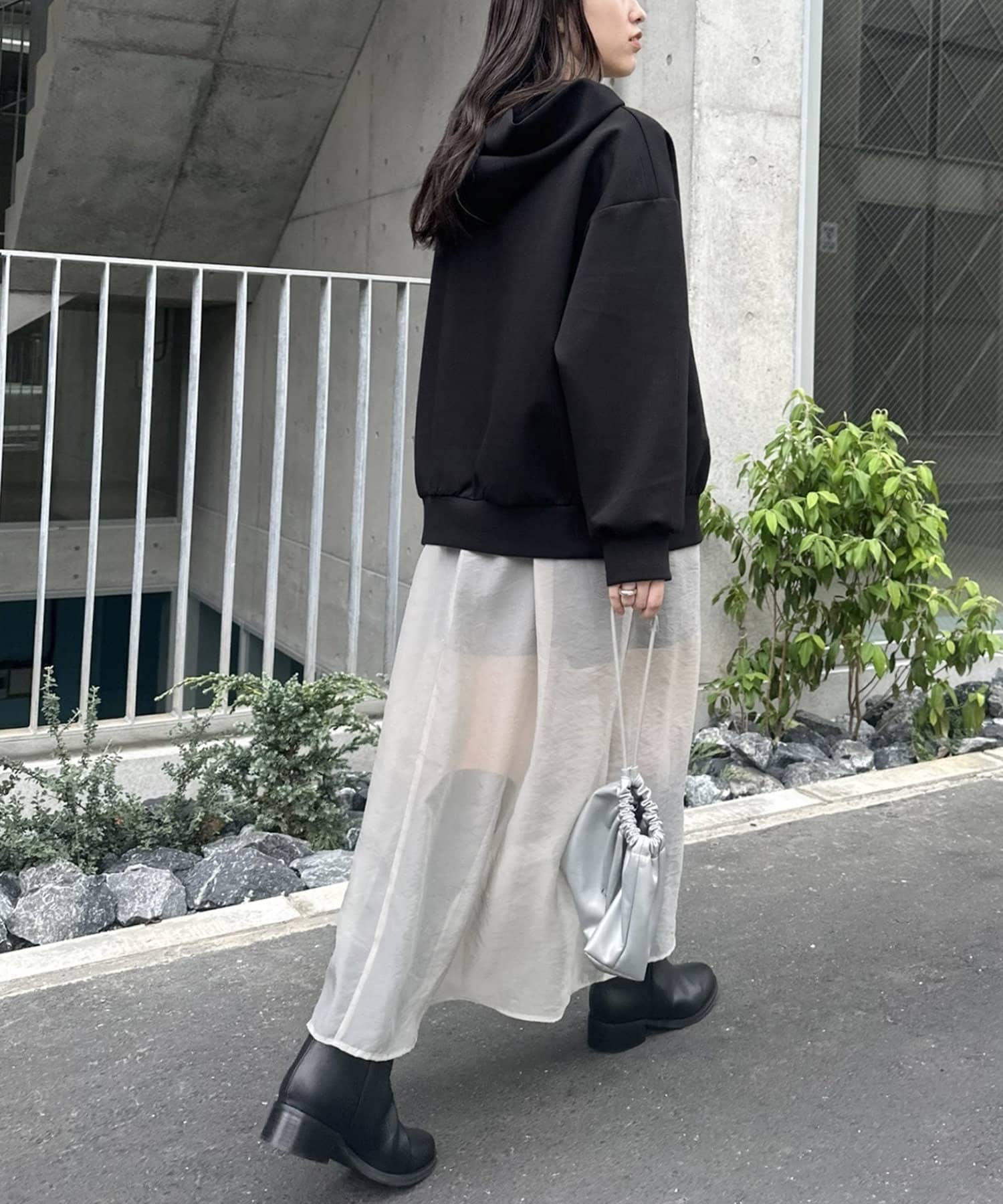 オーバーサイズのパーカーで女性らしい印象で着られるパーカー。