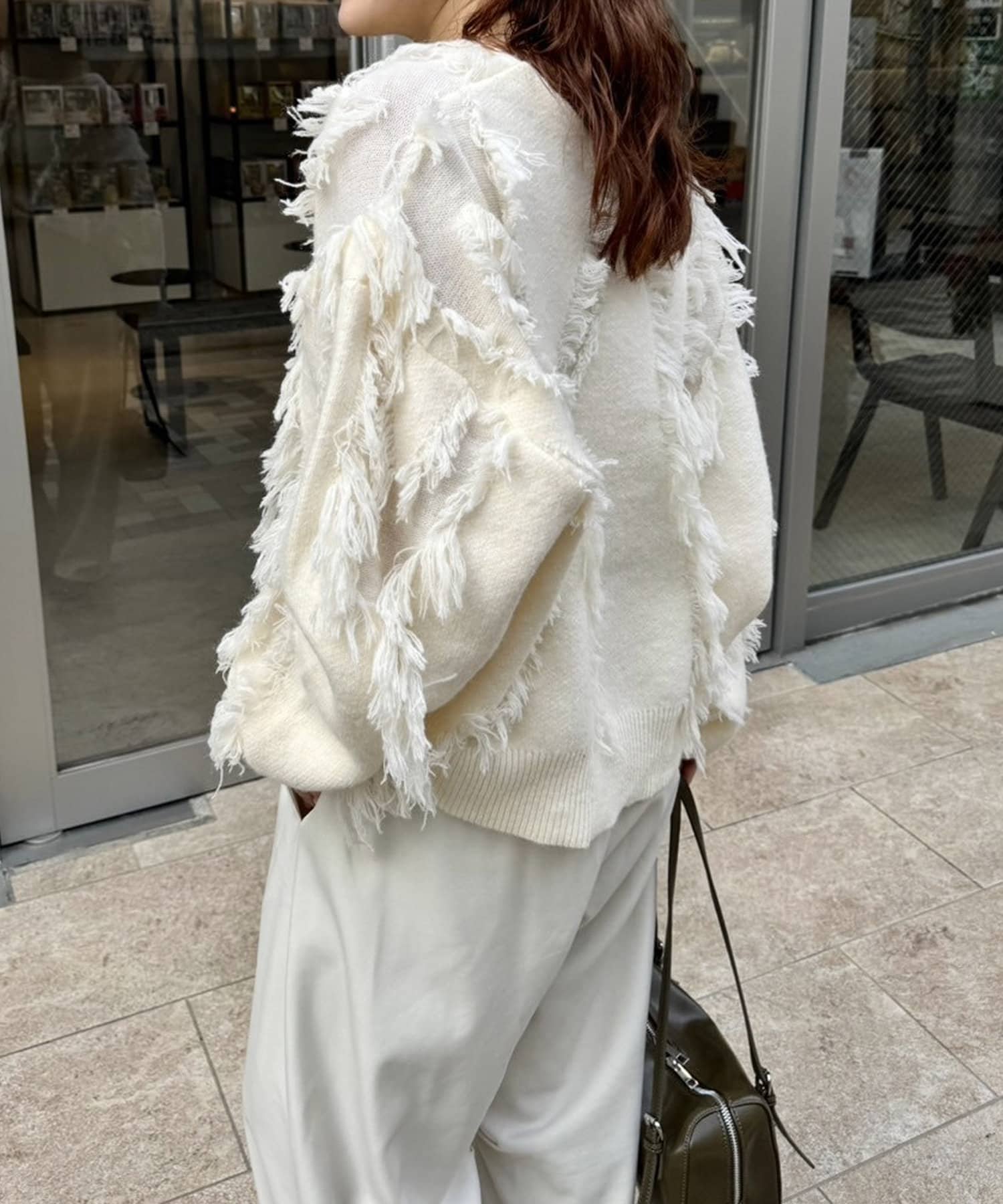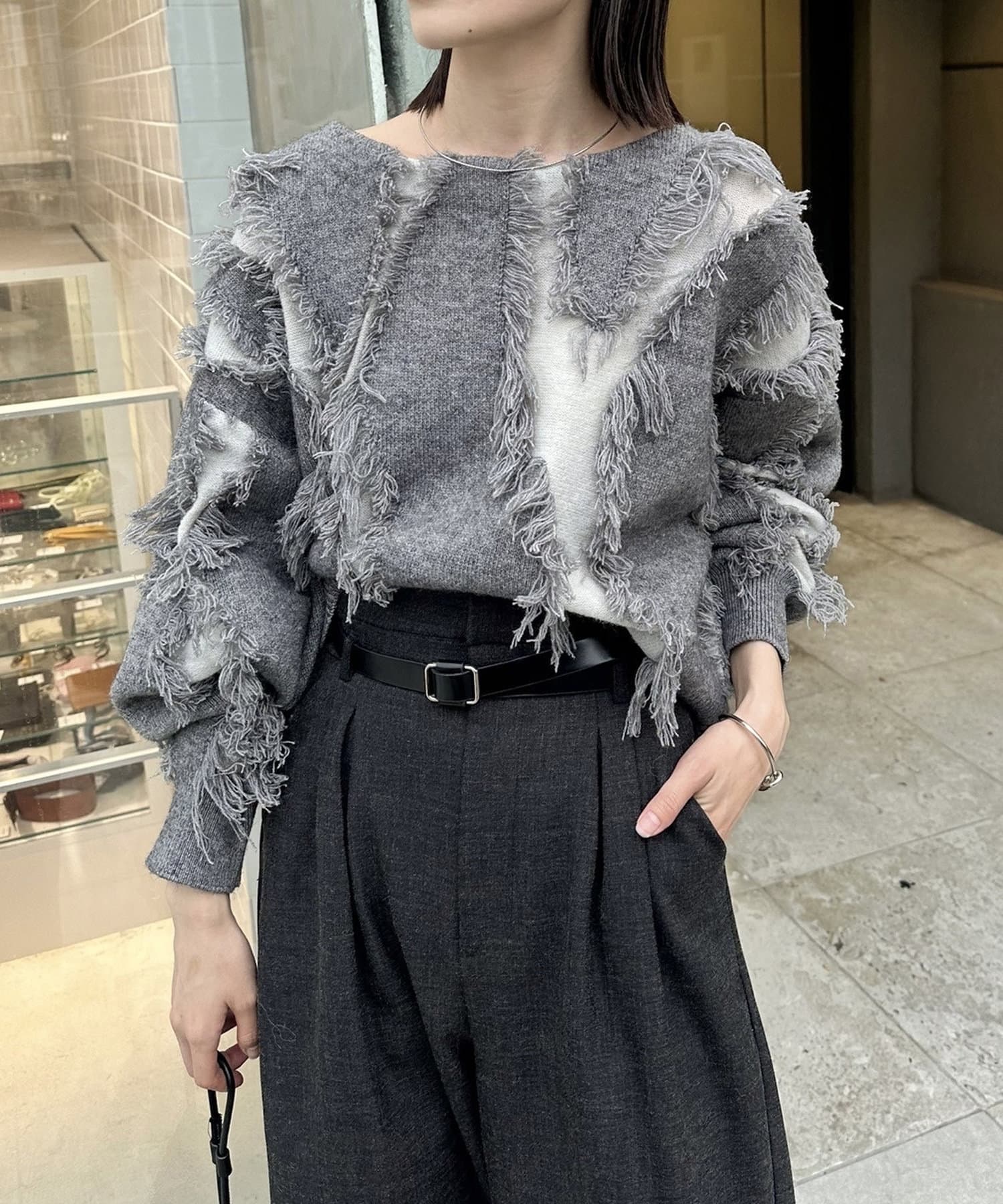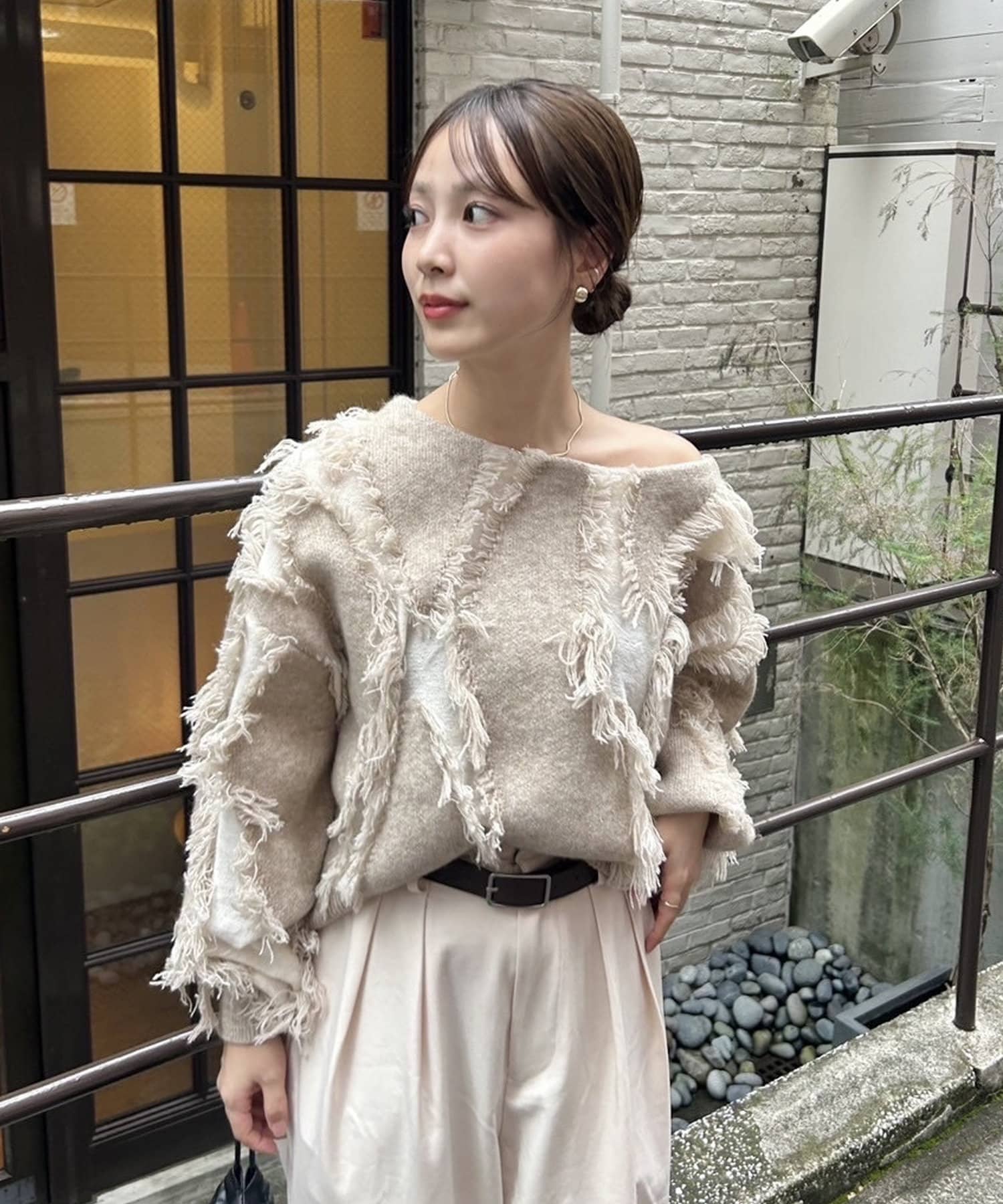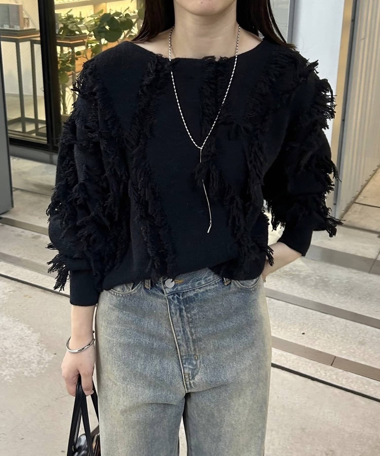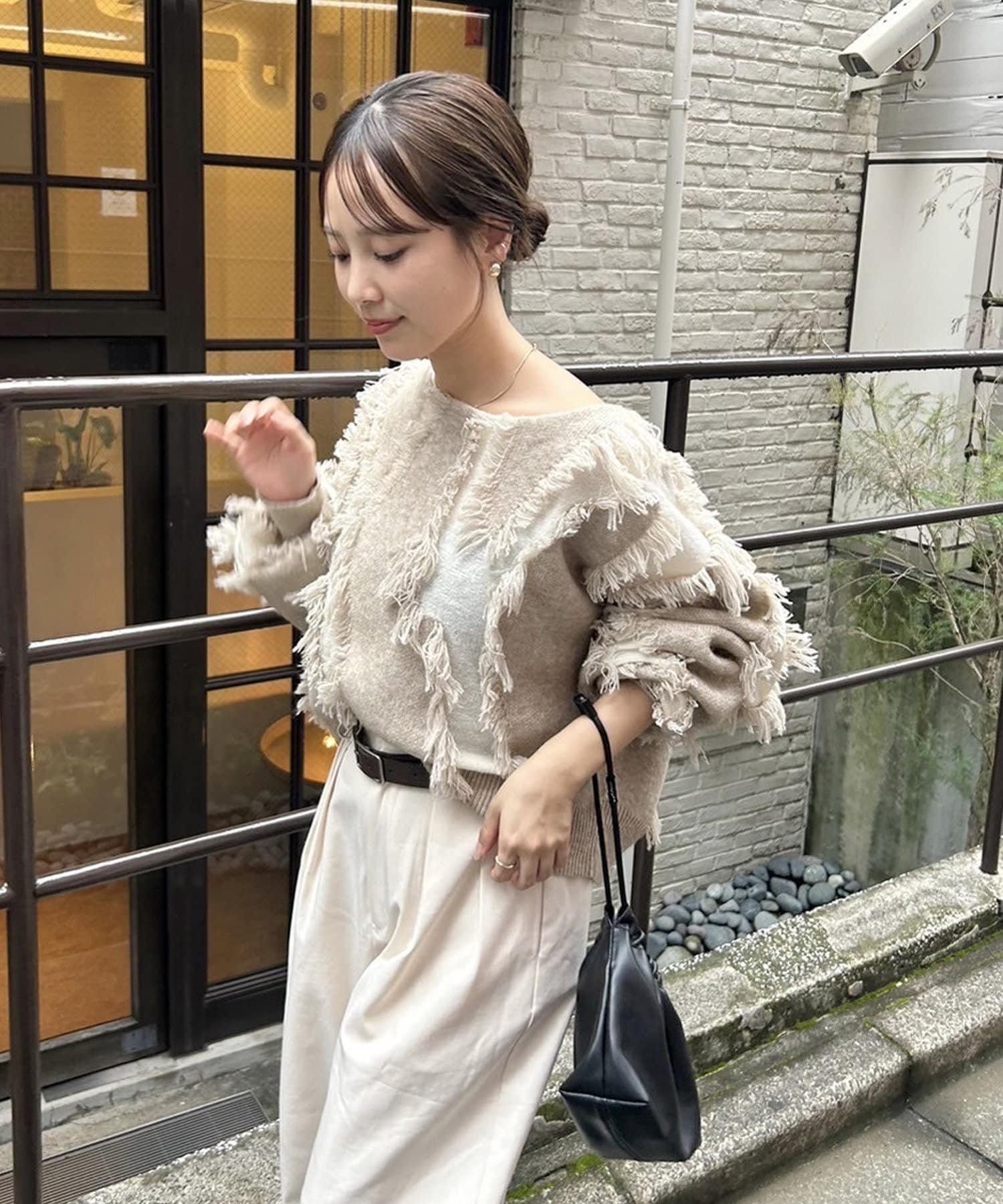 ・フリンジの部分は程よい透け感があり、ニットで重くなりがちですが抜け感あるスタイリングに!