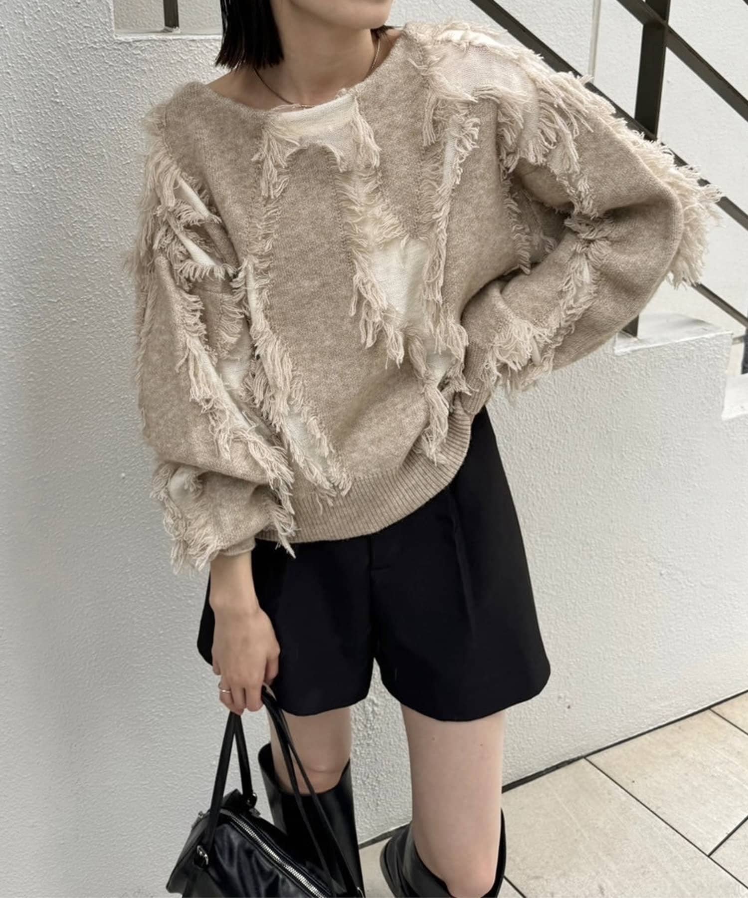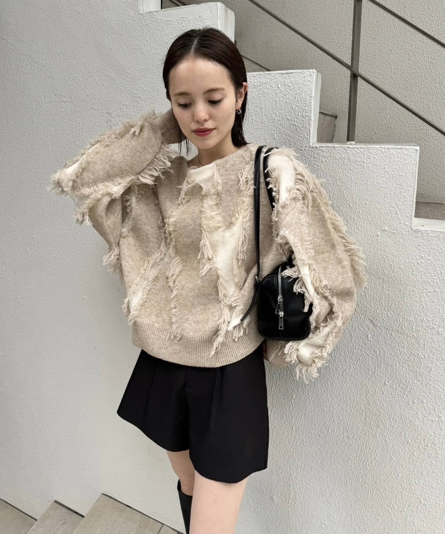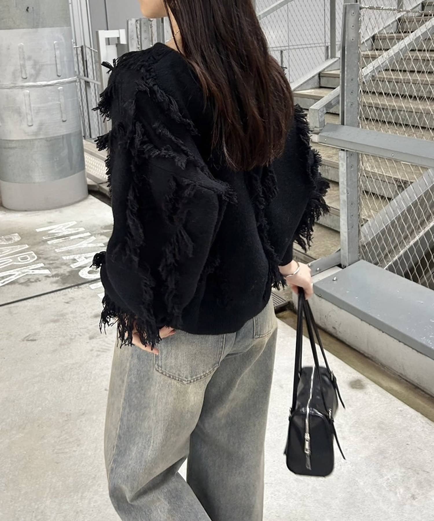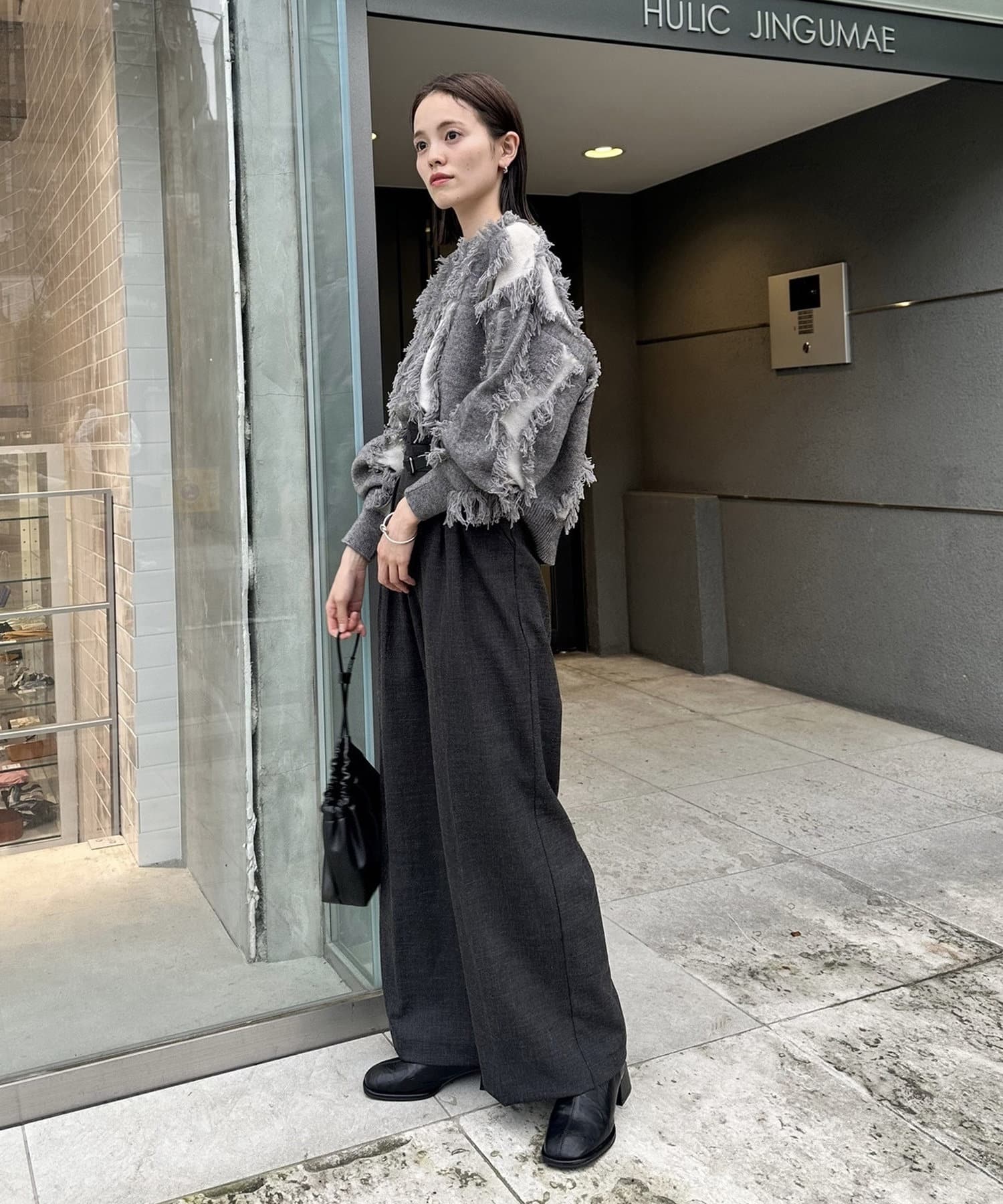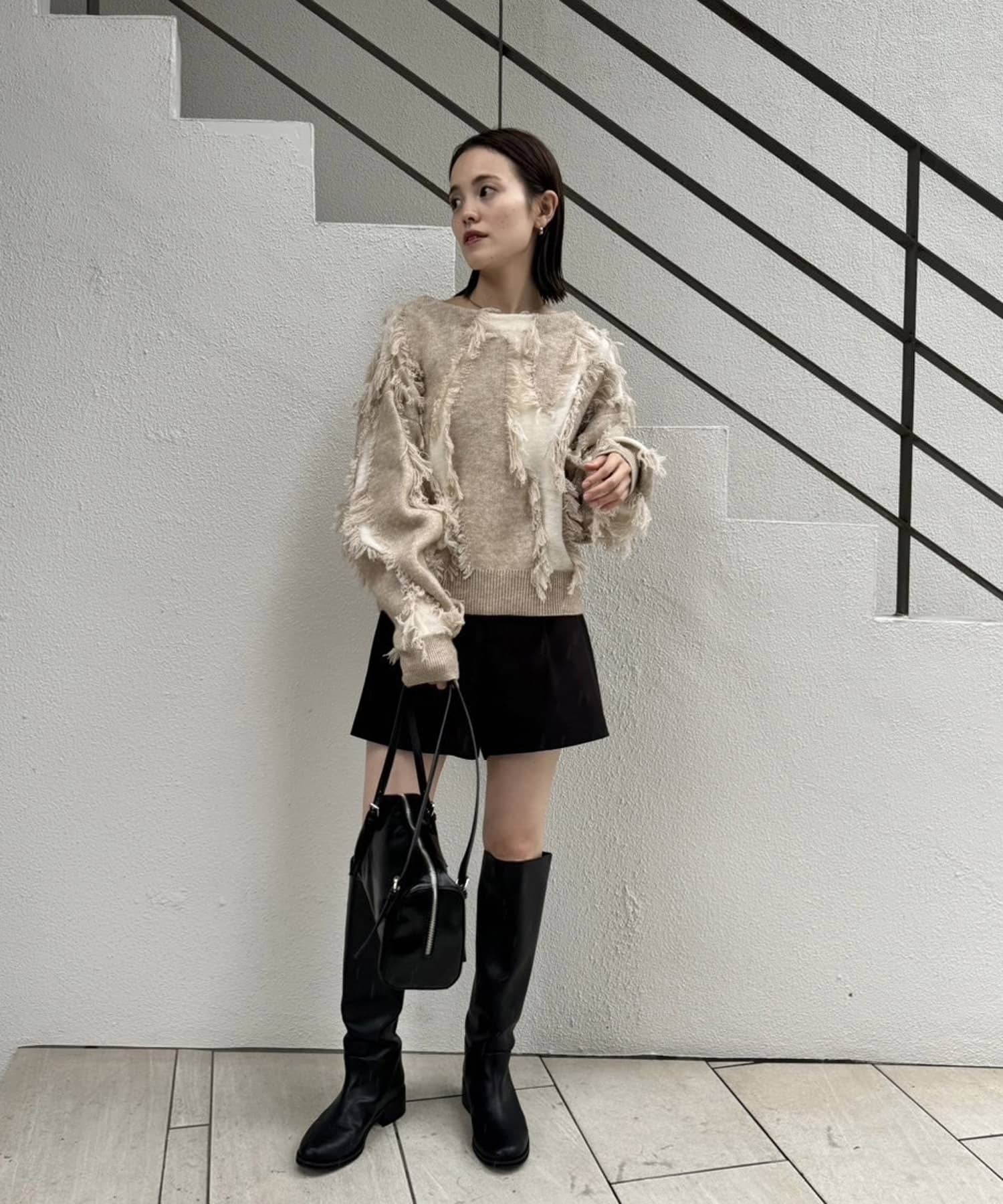 ・フリンジの部分は程よい透け感があり、ニットで重くなりがちですが抜け感あるスタイリングに!