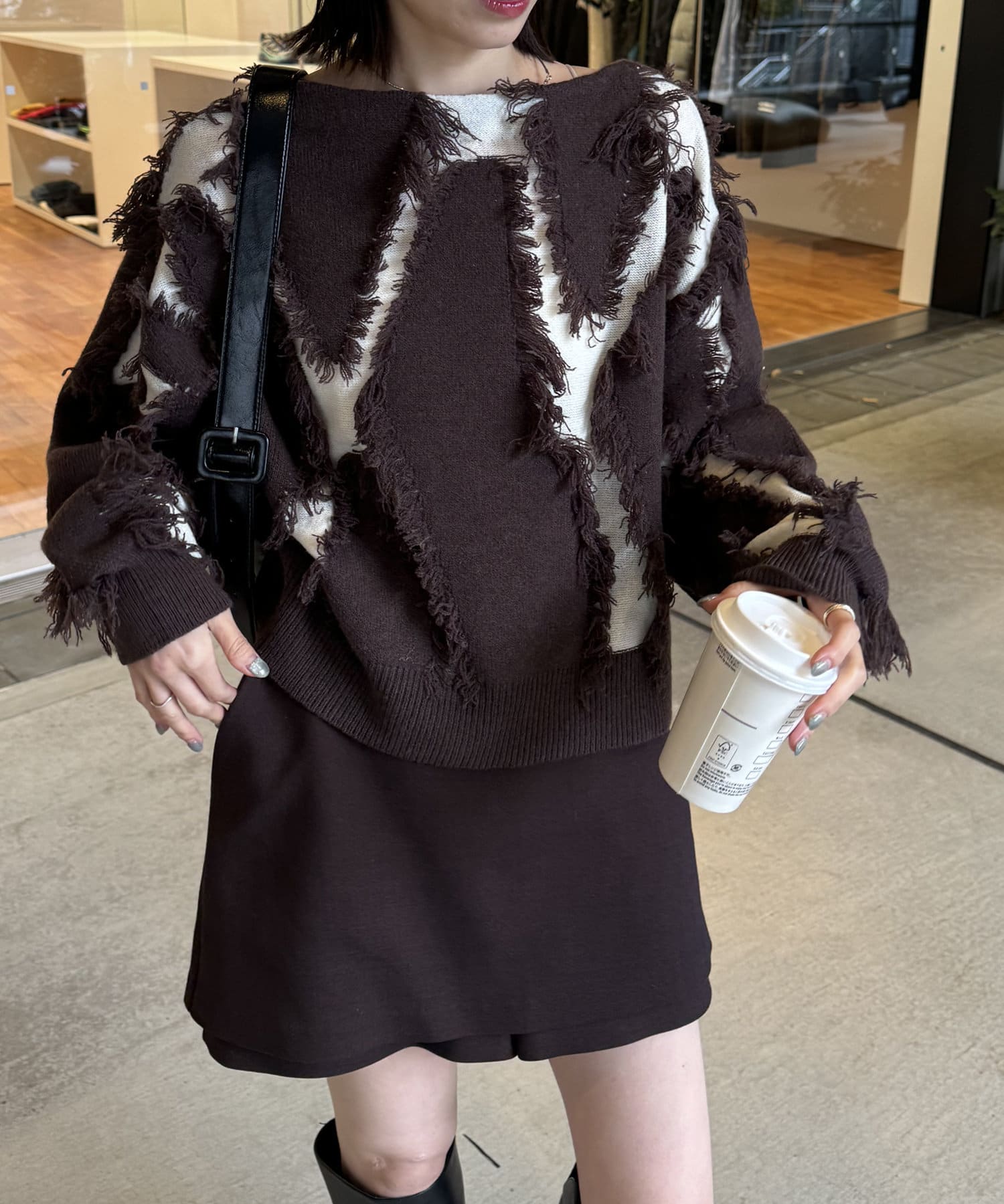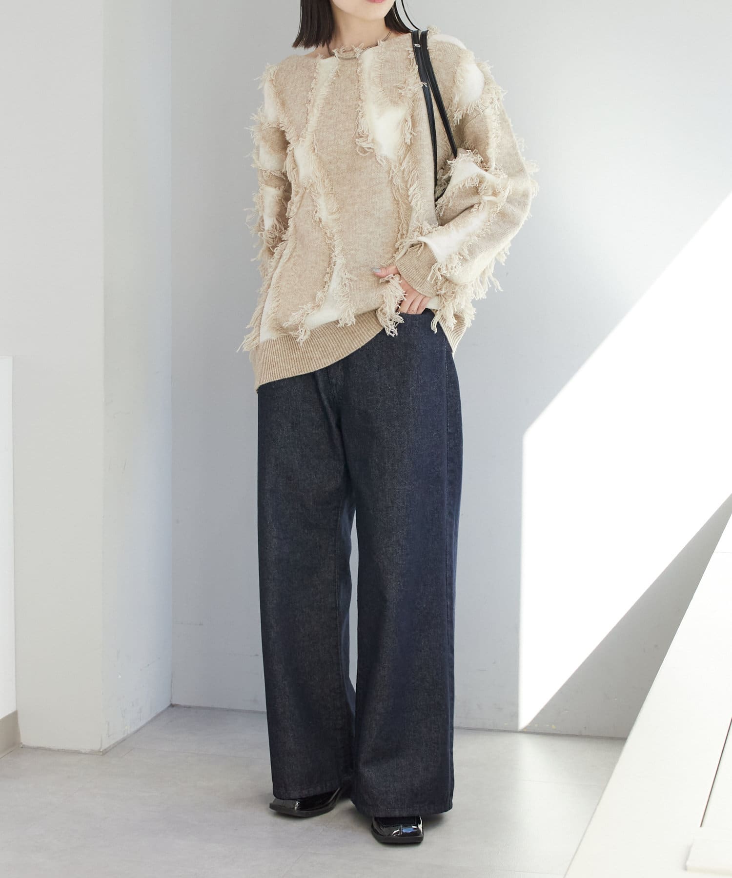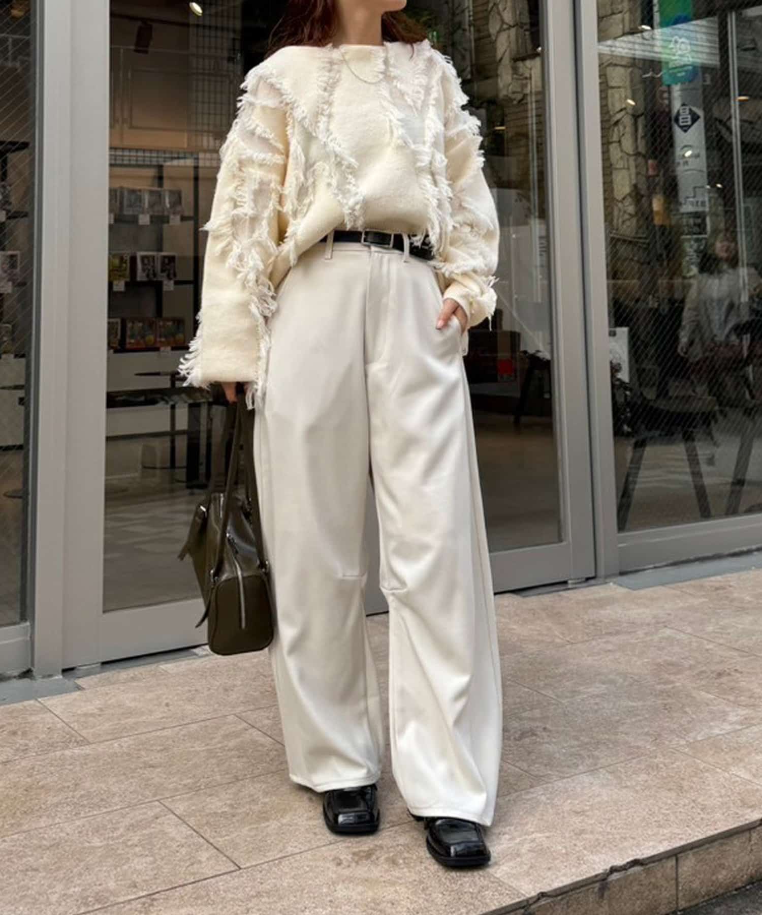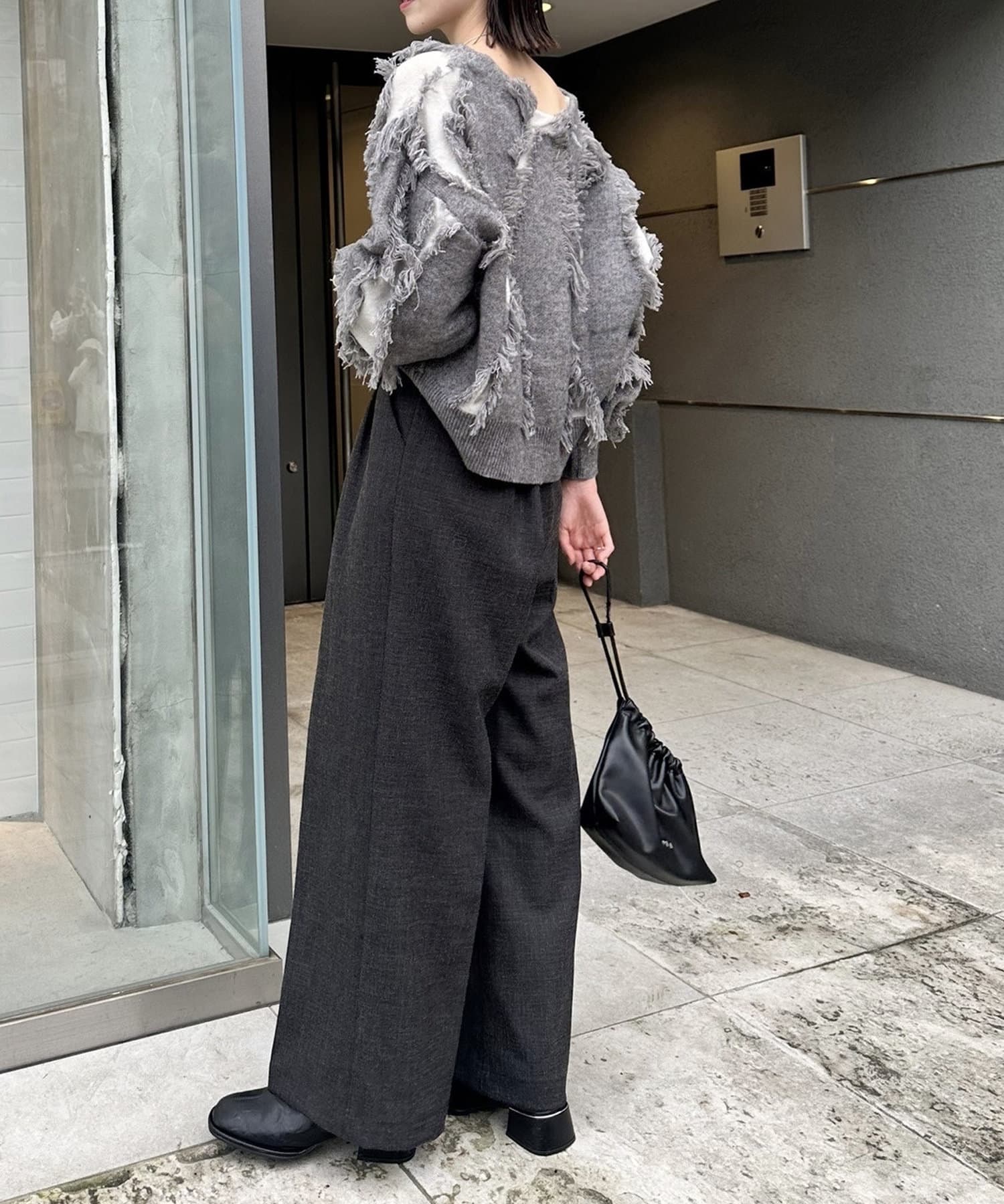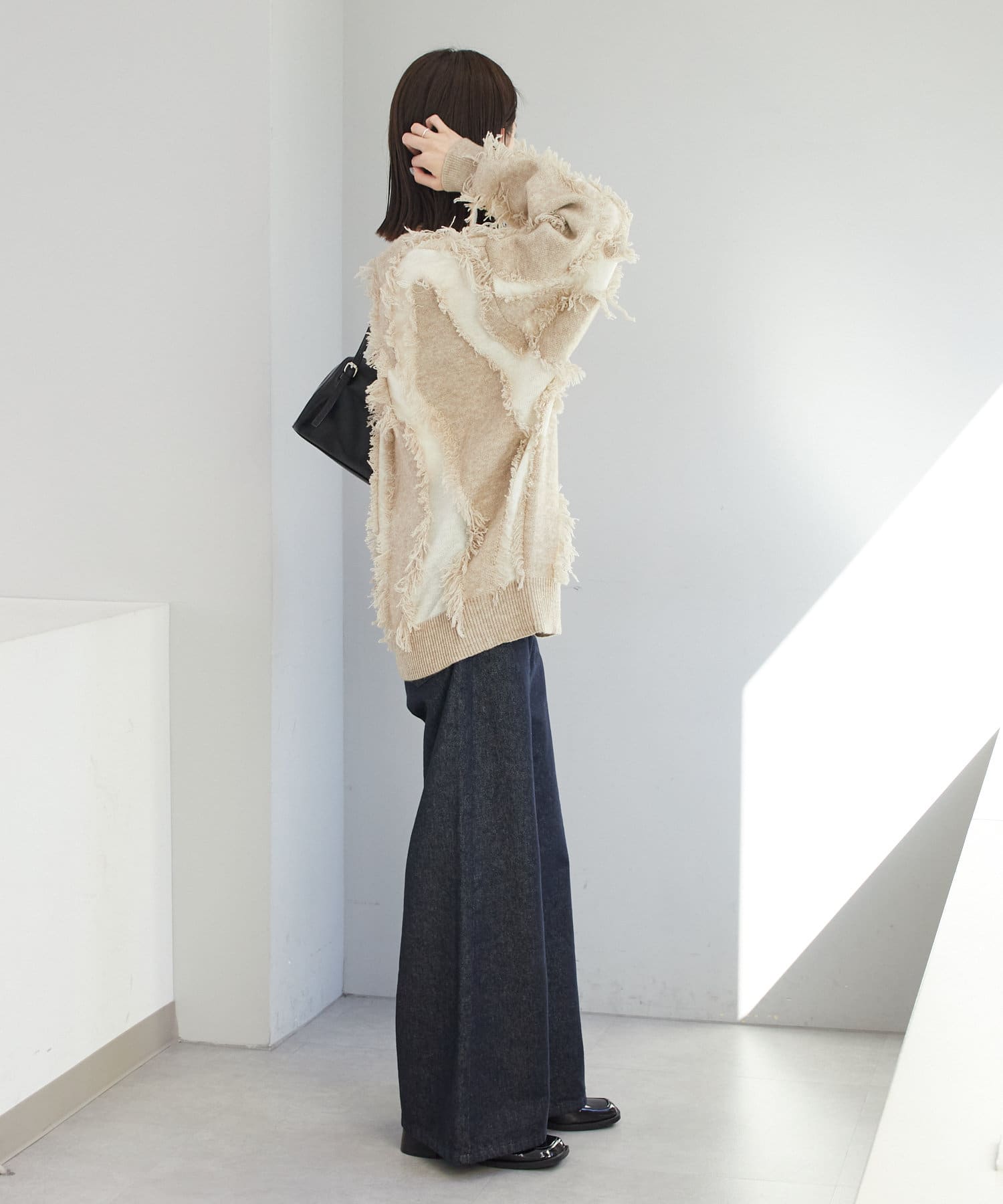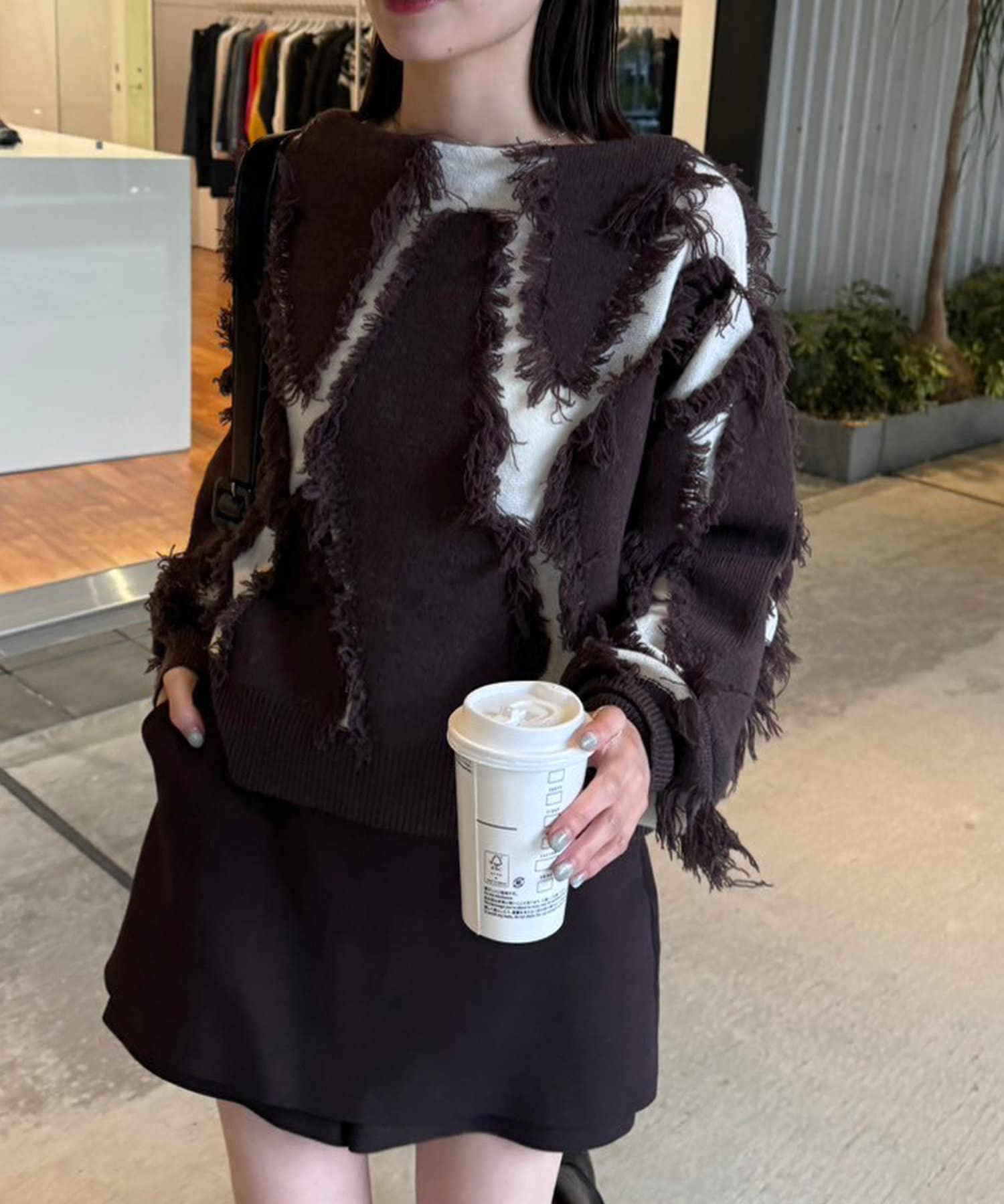 ・フリンジの部分は程よい透け感があり、ニットで重くなりがちですが抜け感あるスタイリングに!