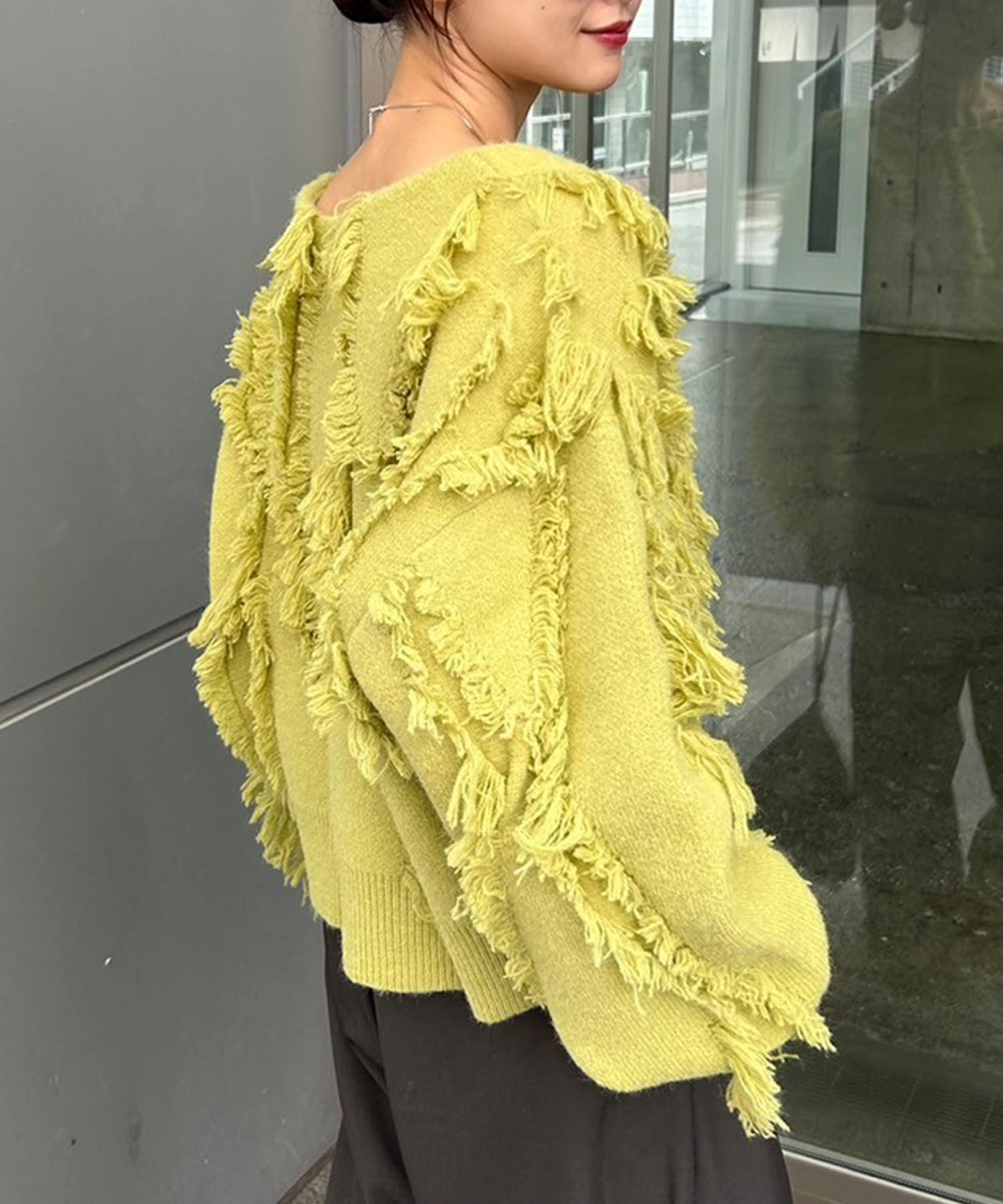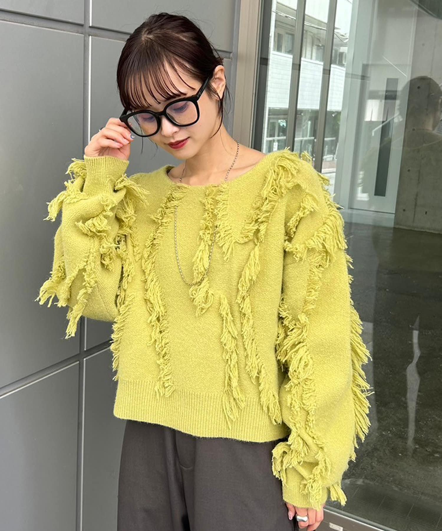 ・フリンジの部分は程よい透け感があり、ニットで重くなりがちですが抜け感あるスタイリングに!