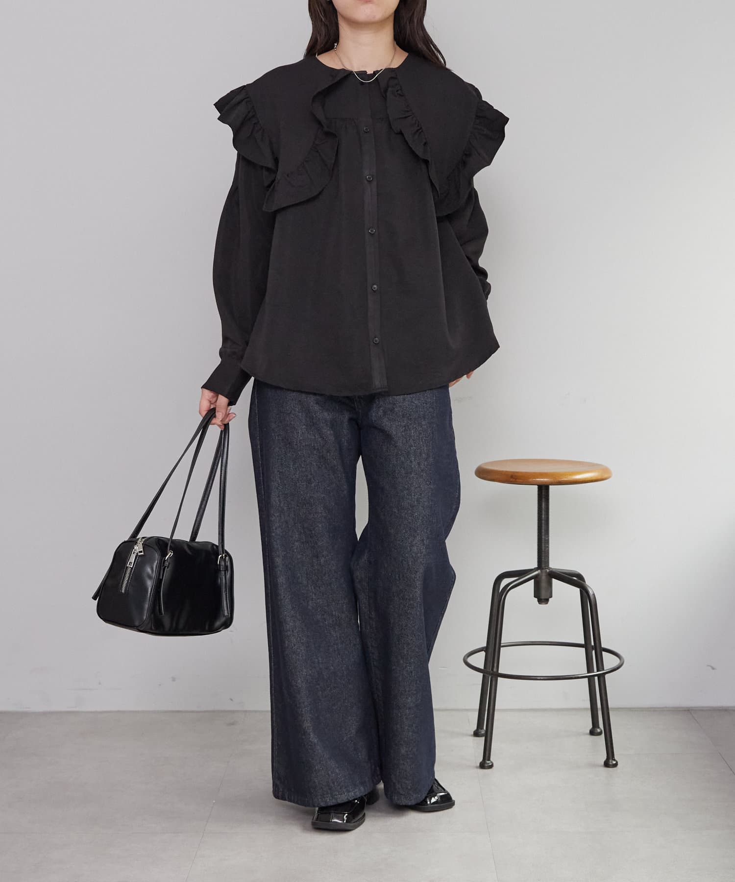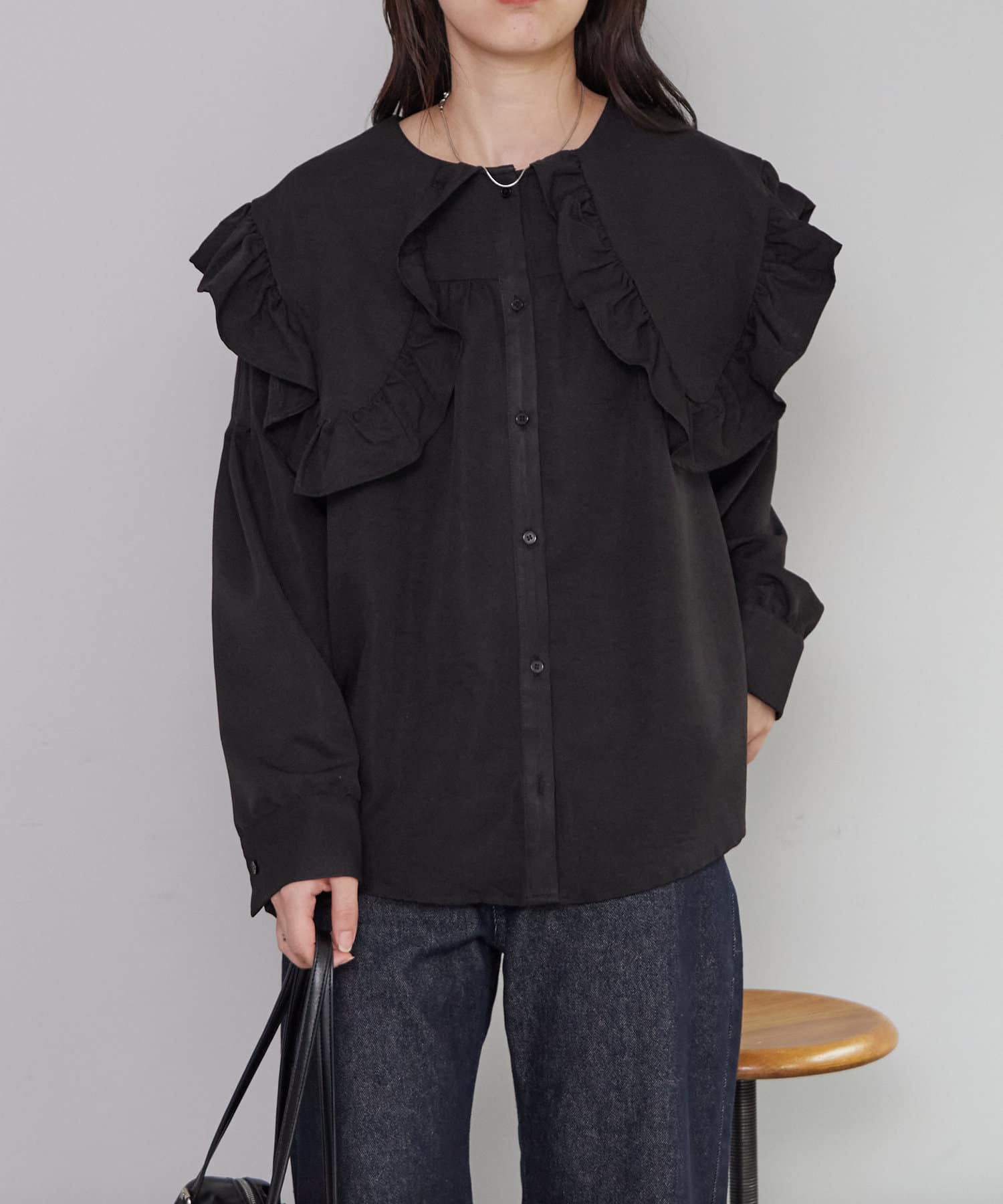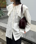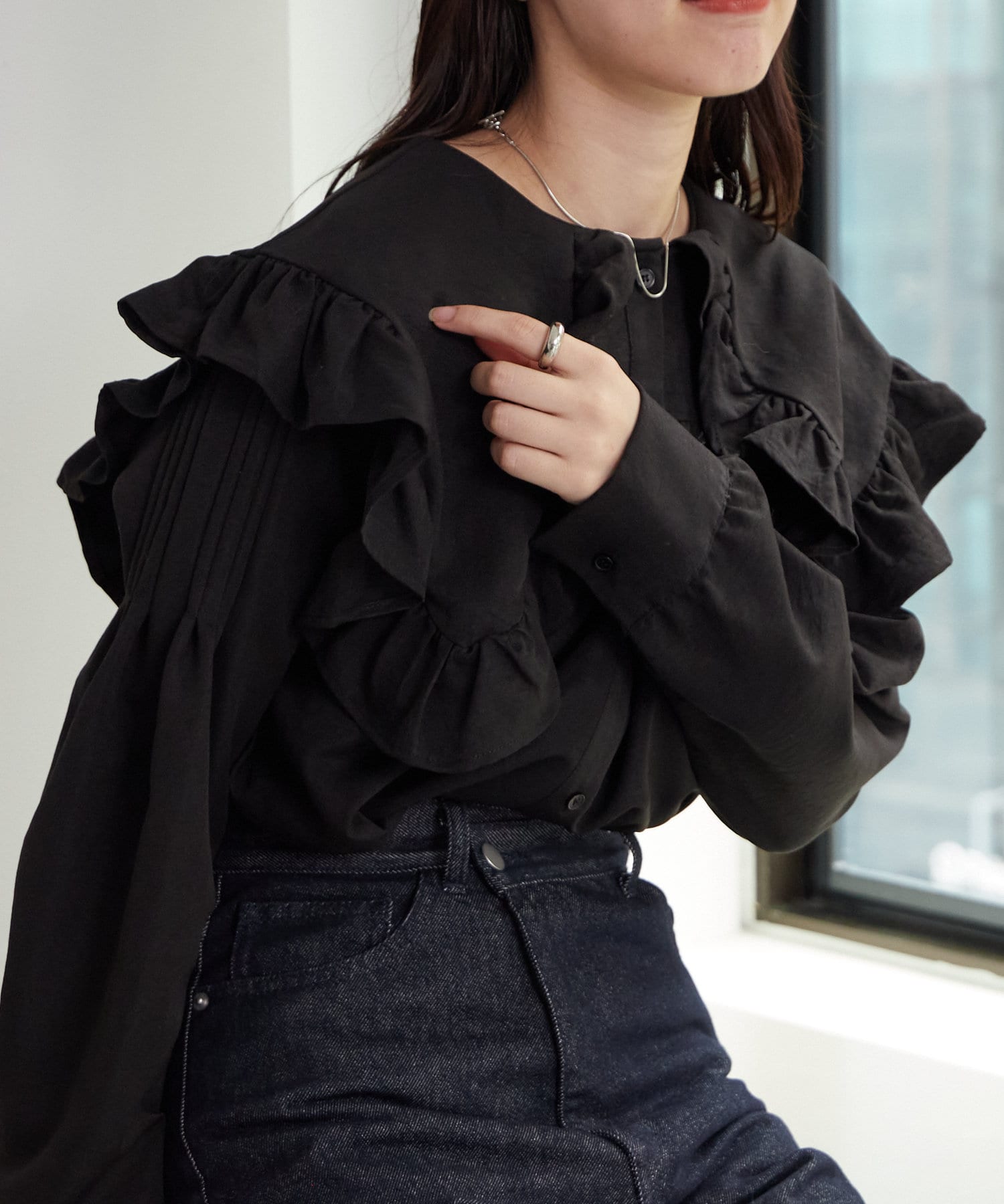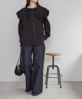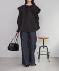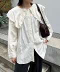 ・トレンド感たっぷりの大きな襟とフリルが目を惹くブラウス。