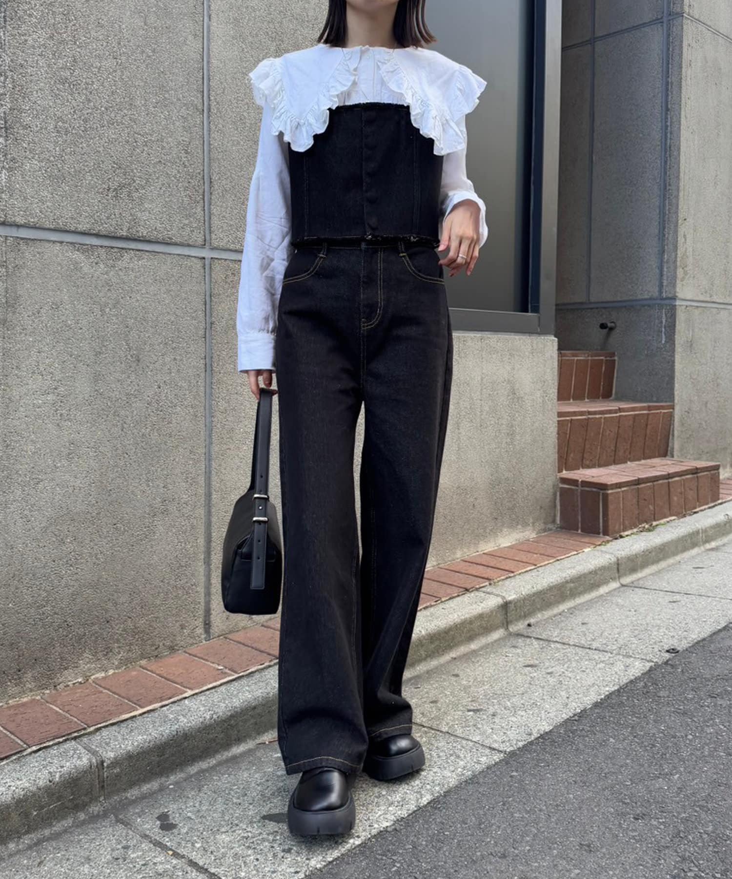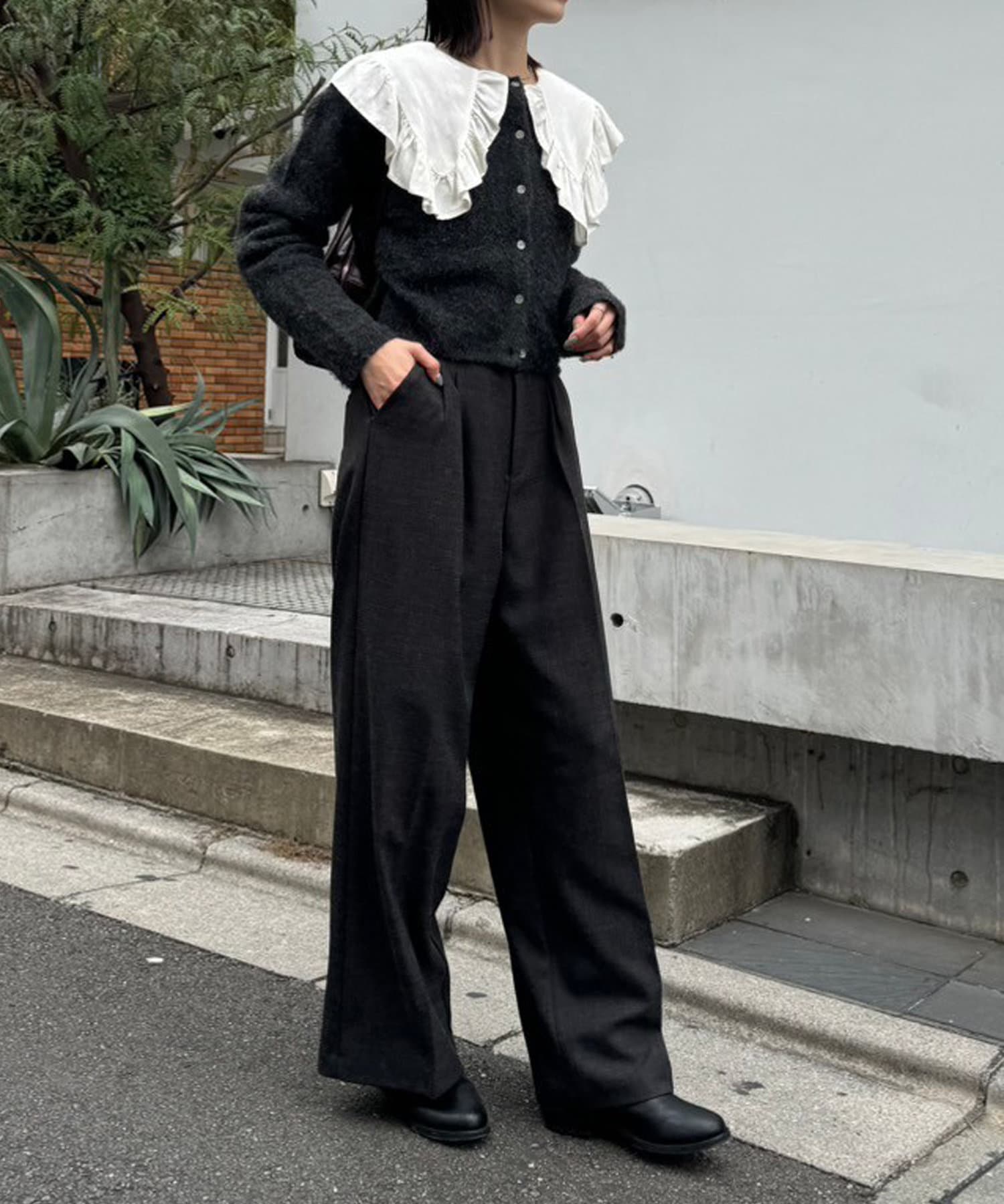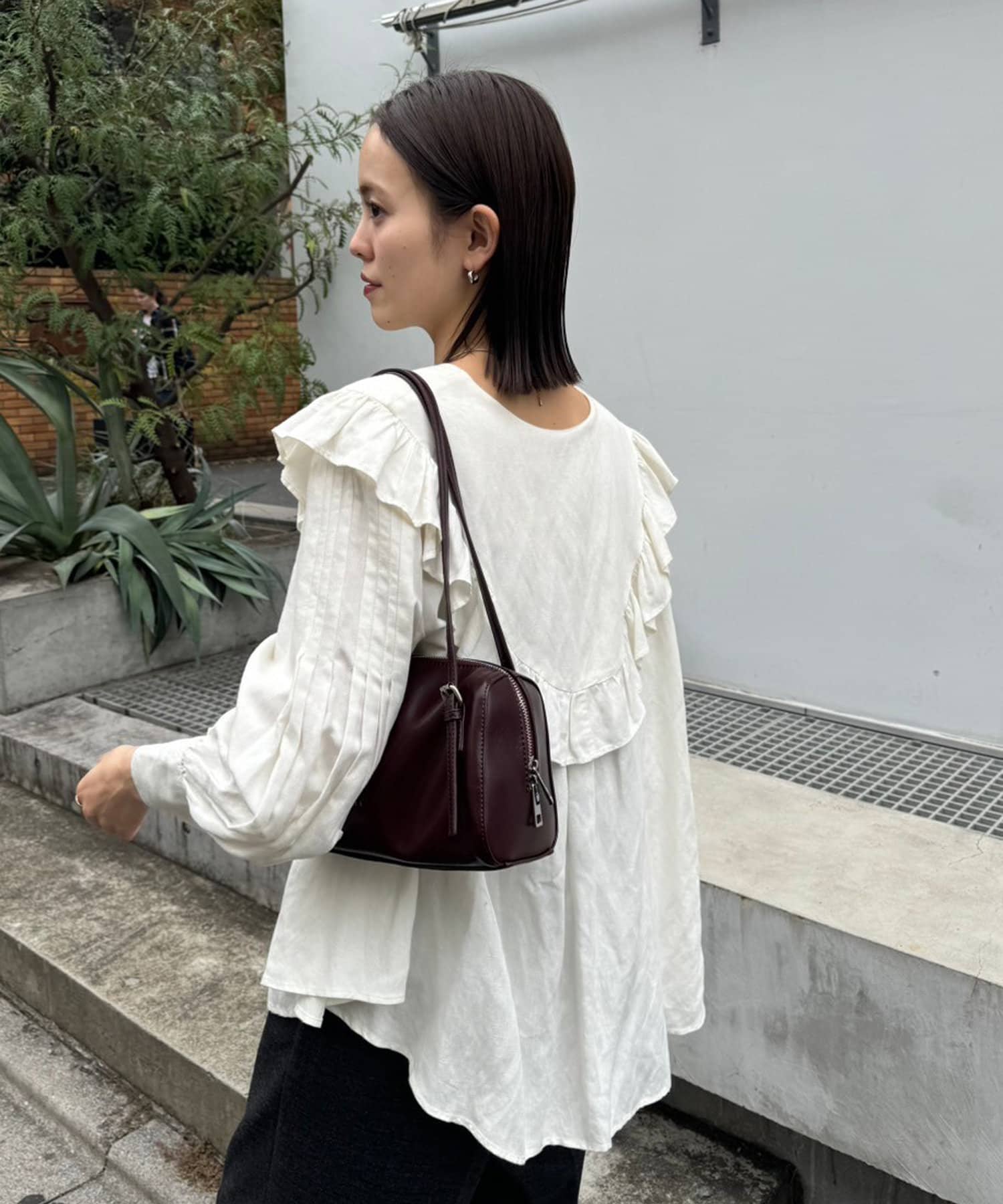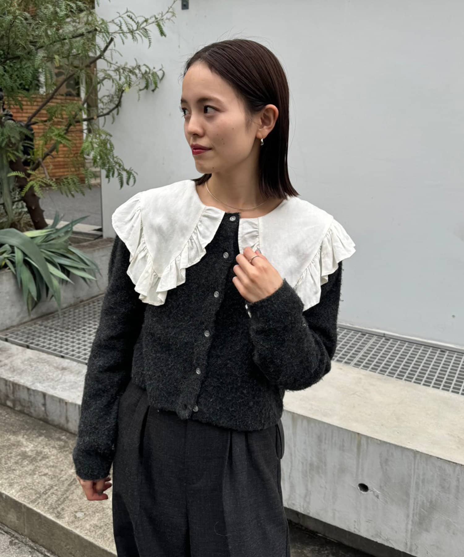 ・トレンド感たっぷりの大きな襟とフリルが目を惹くブラウス。