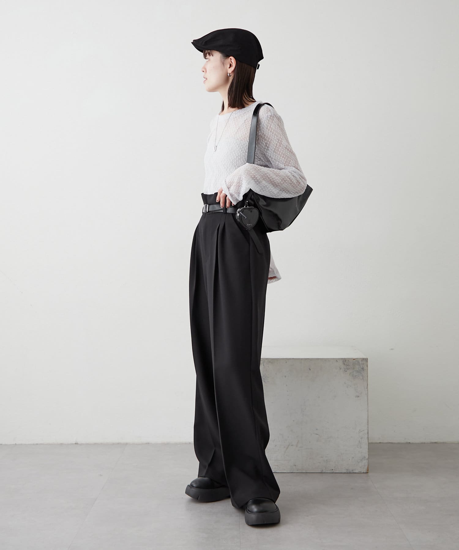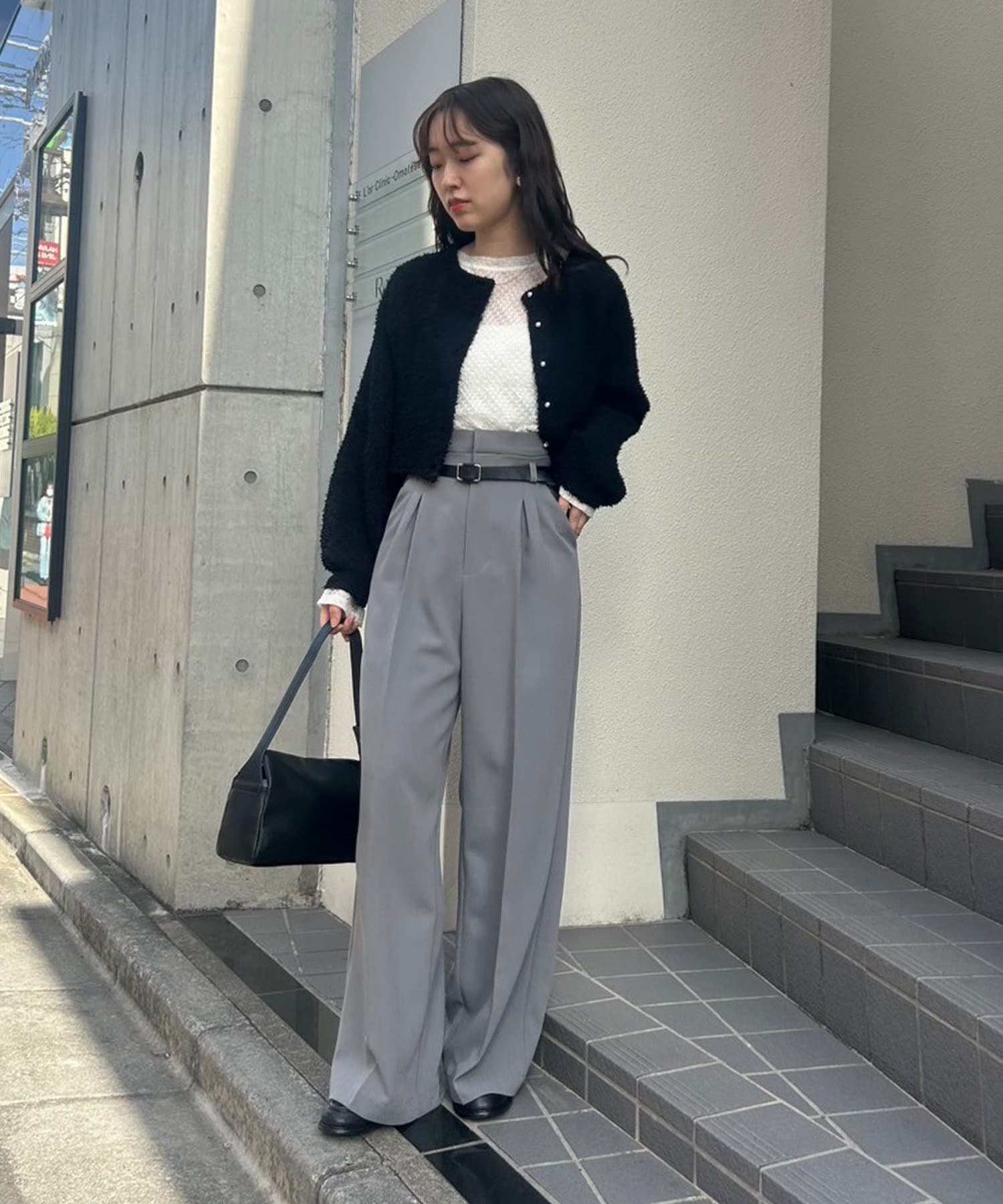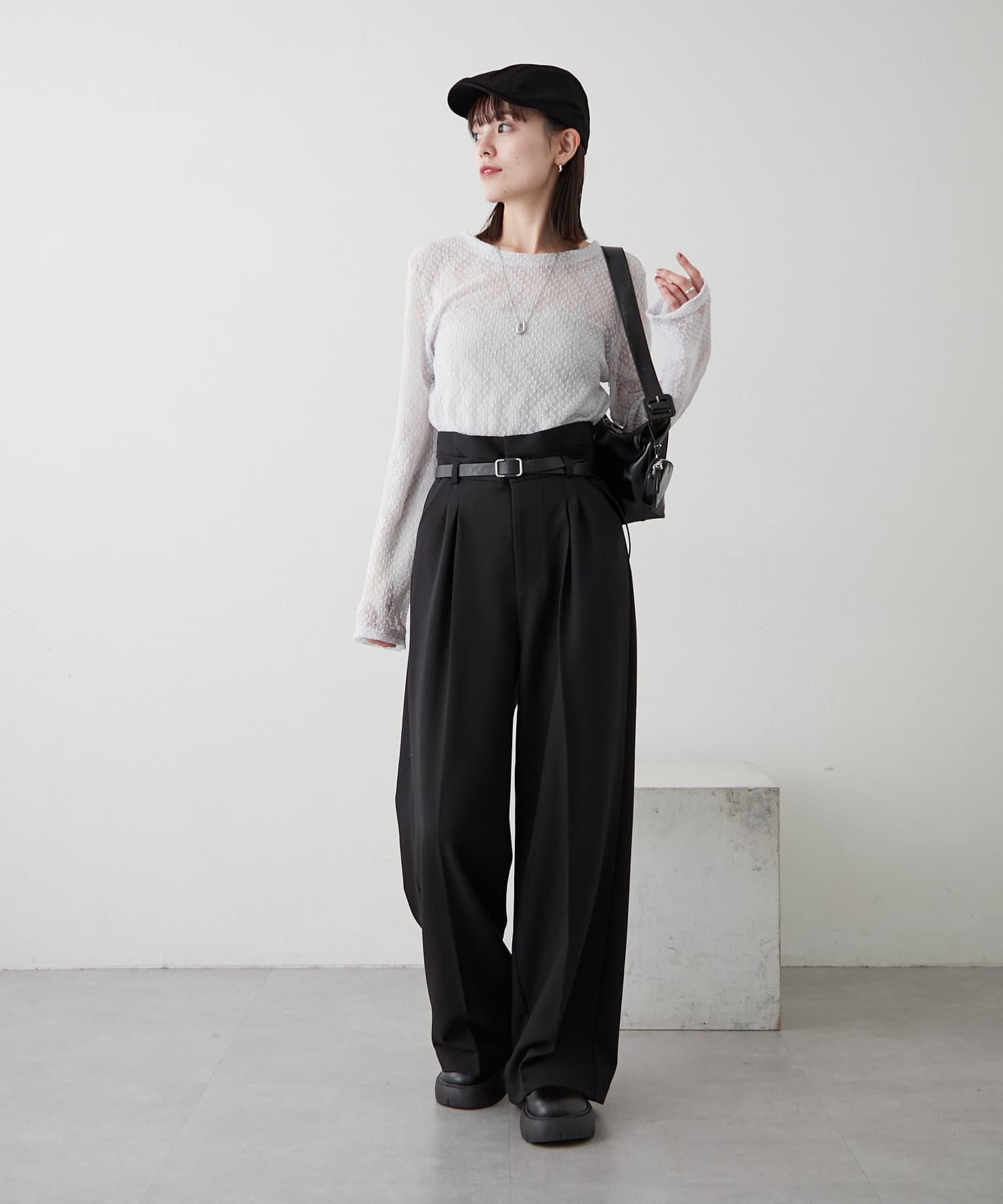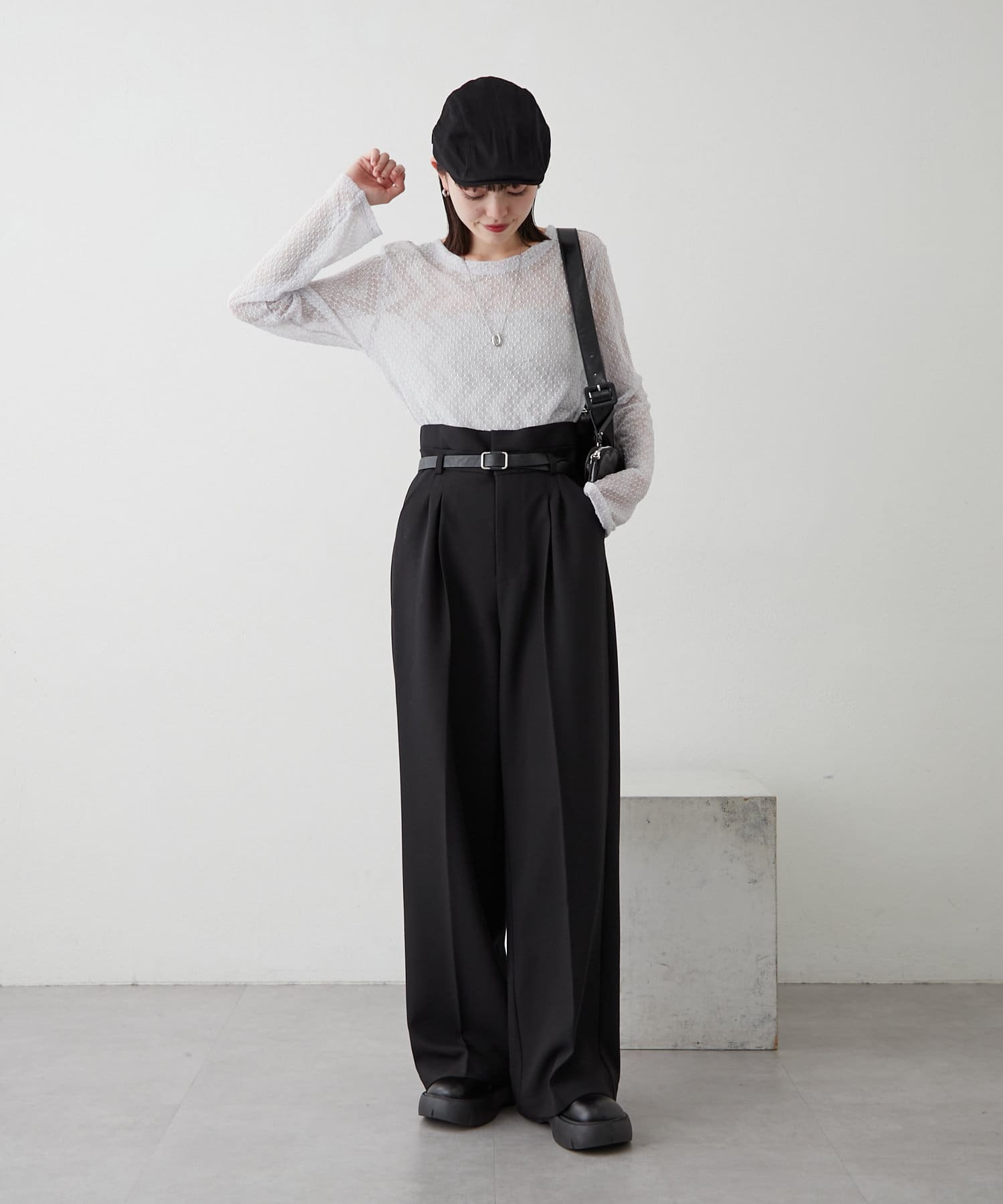 ・タック入りで、ハイウエストのデザインによって美脚見えするスラックス。
