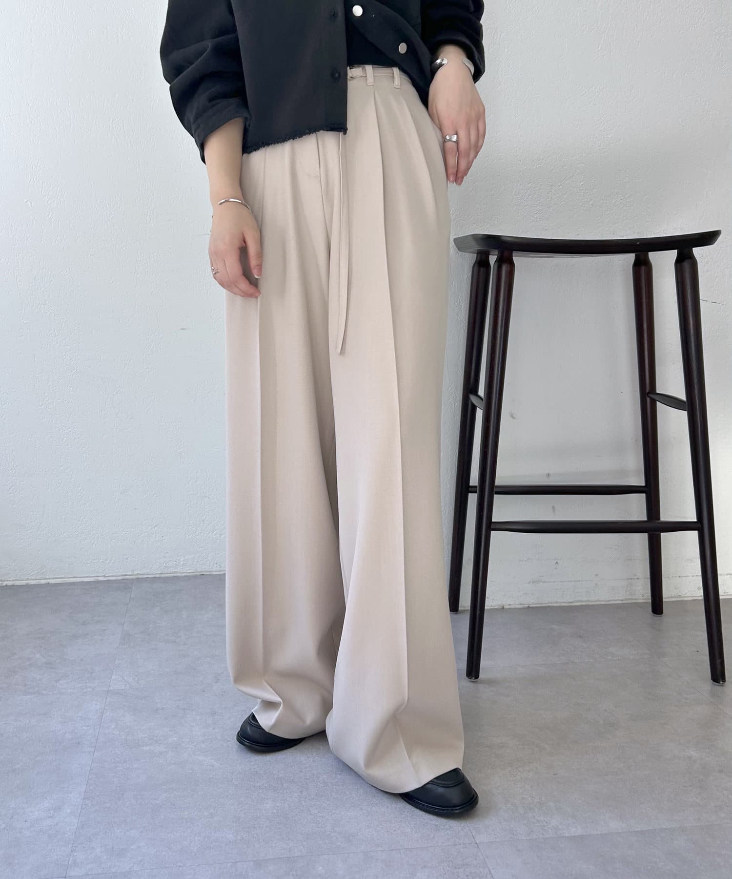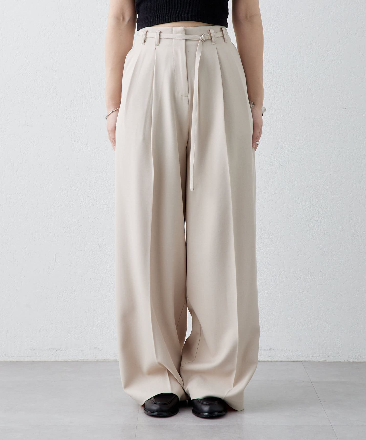 ・やや落ち感あるシルエットで同色のベルトが付いたお洒落なタックパンツ。