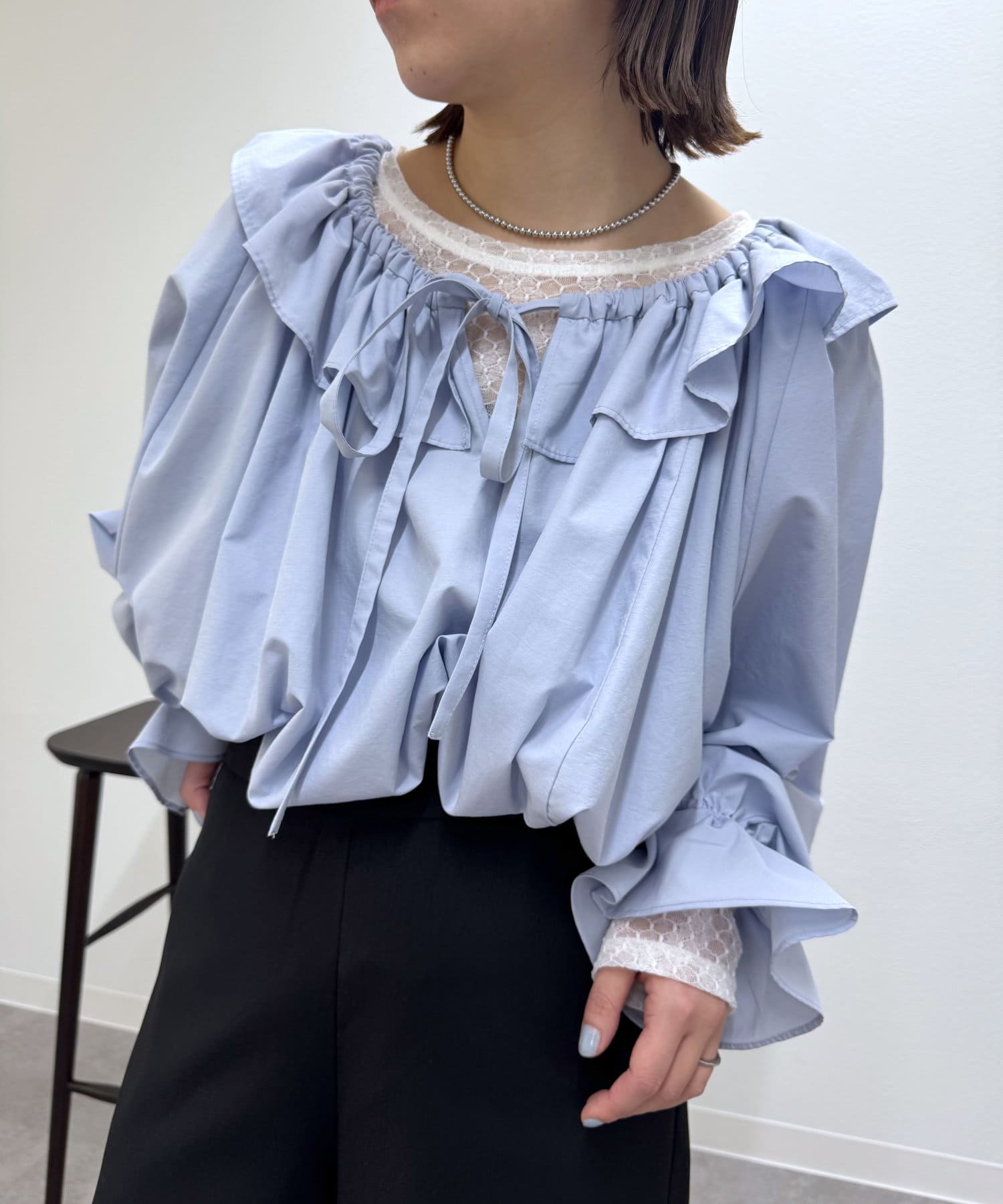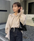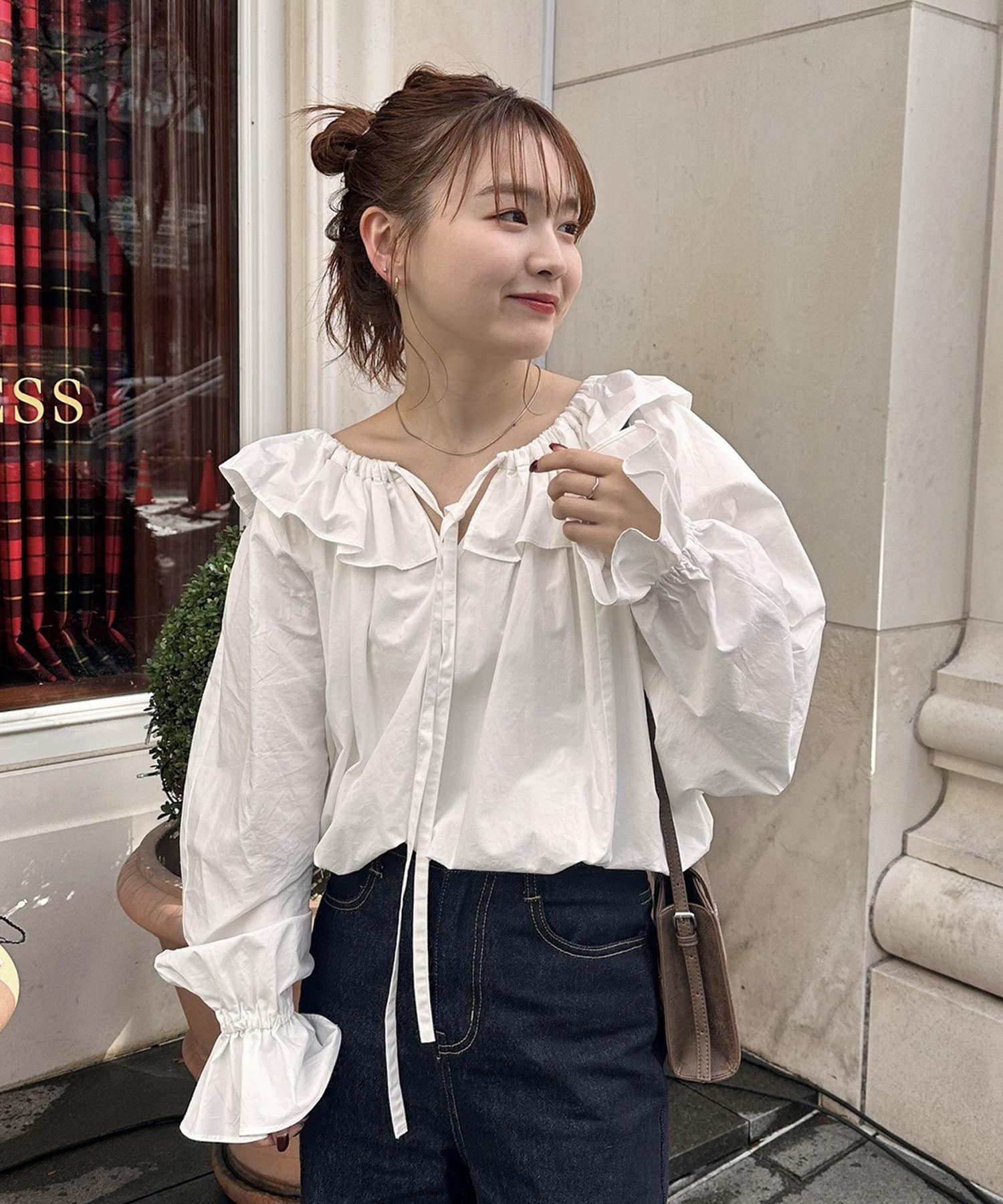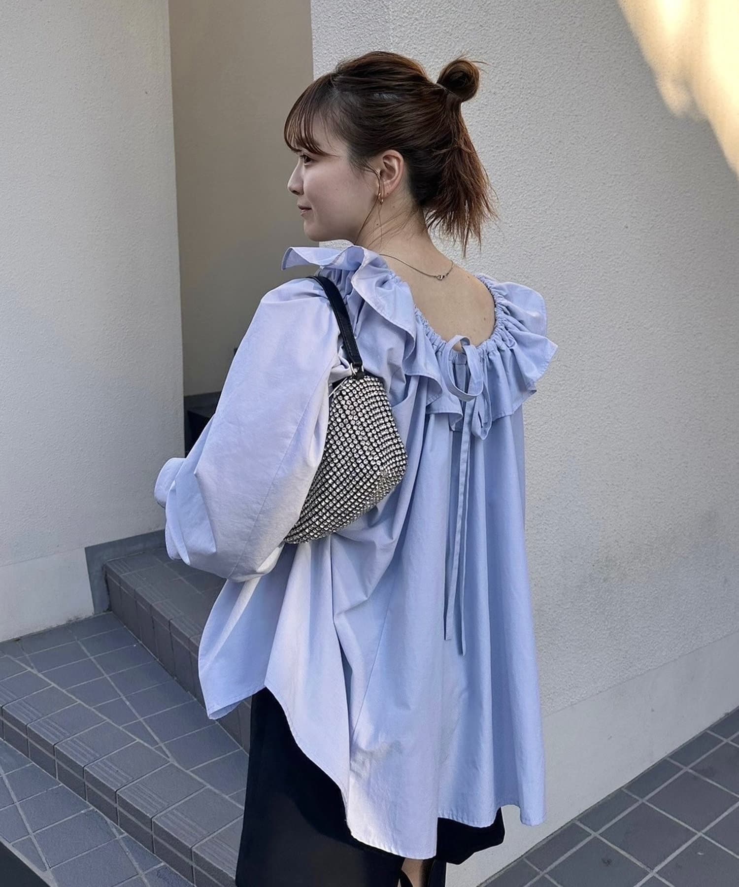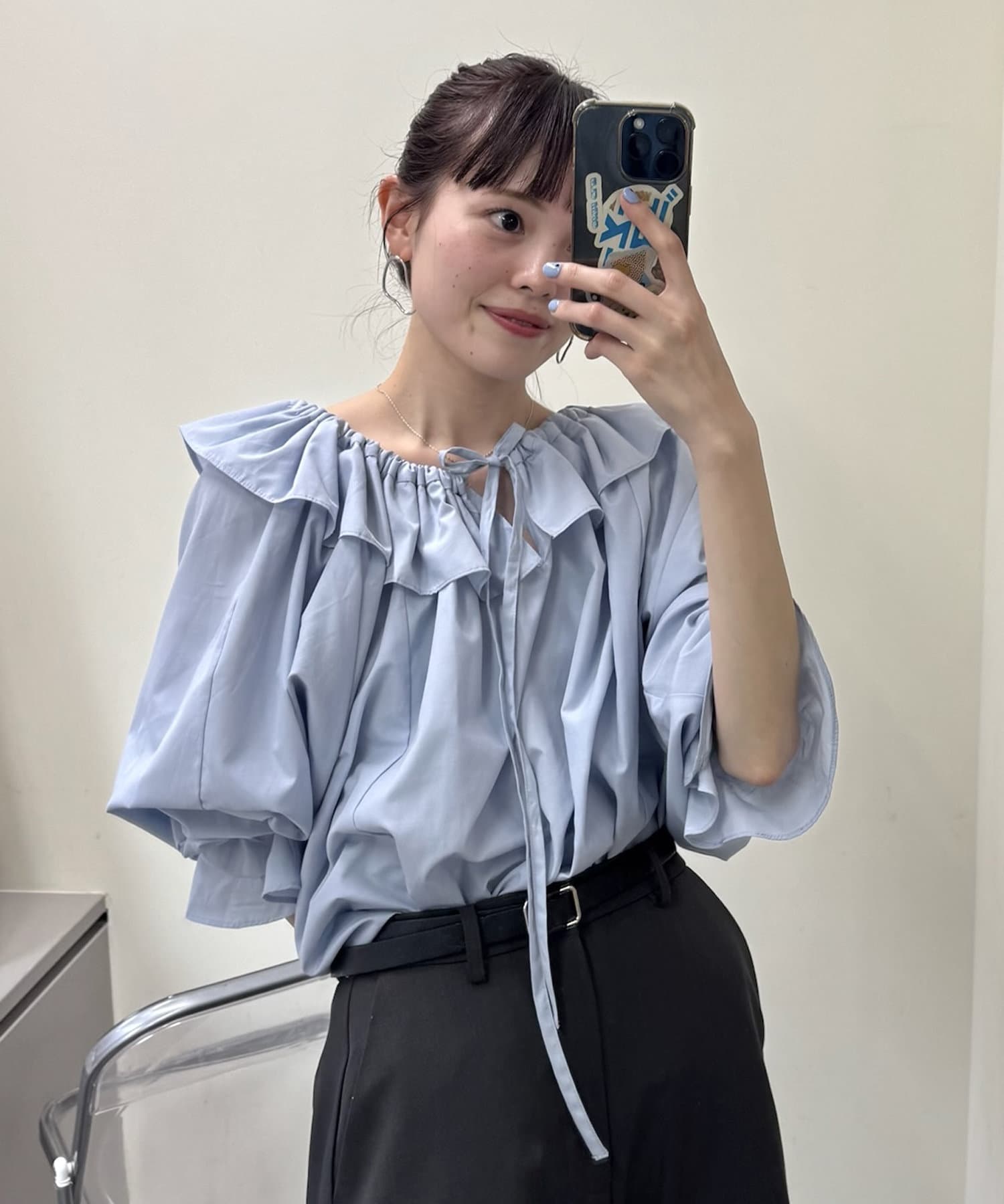 ・胸元のリボンと存在感のあるフリルがポイントで前後両前で着られる主役級ブラウス。