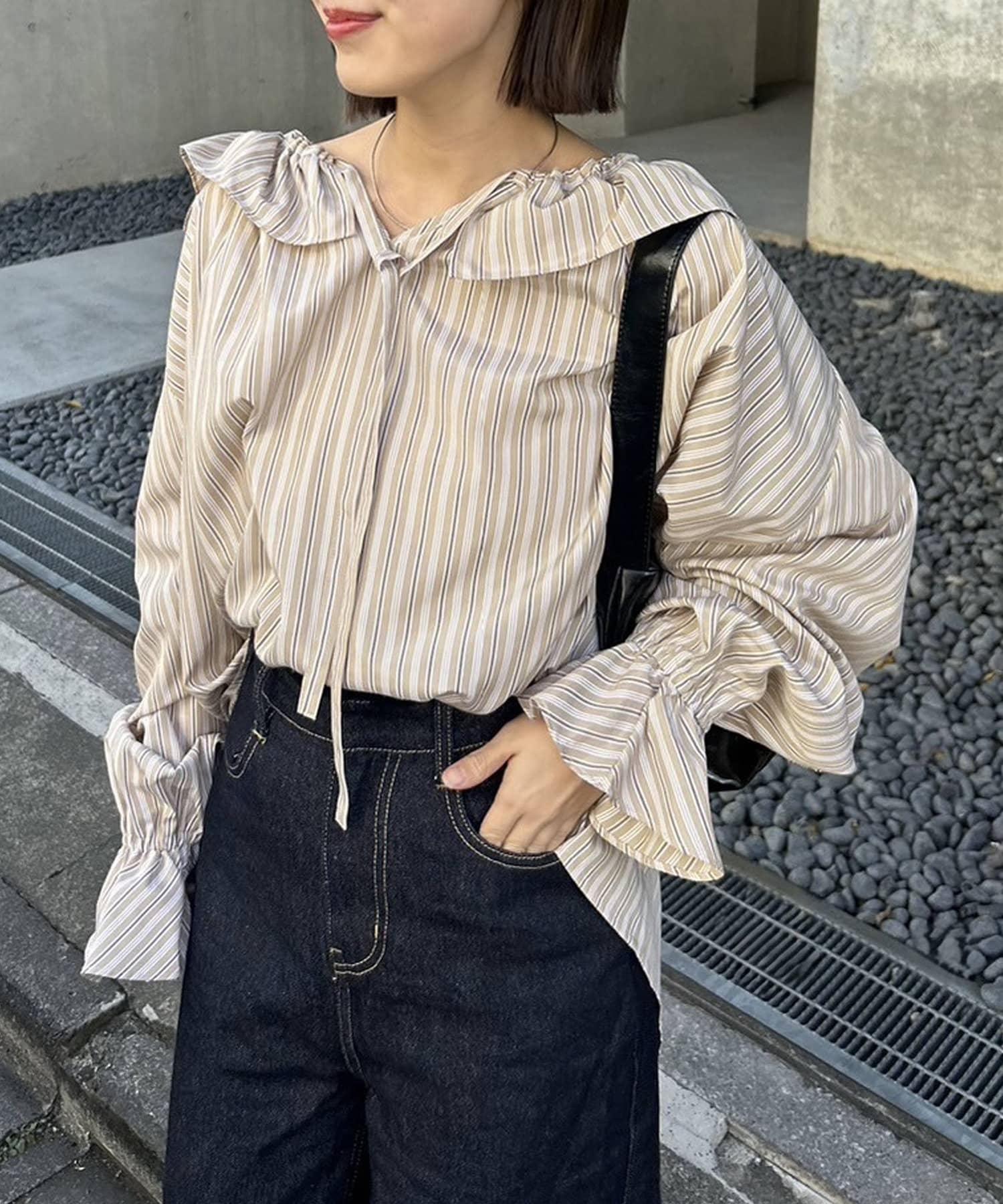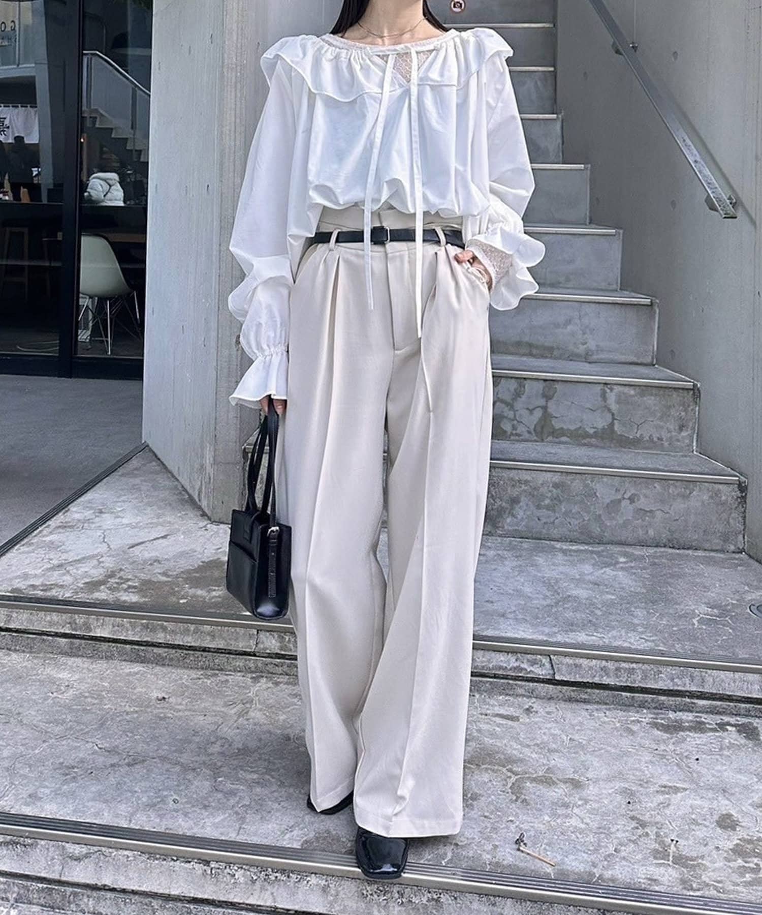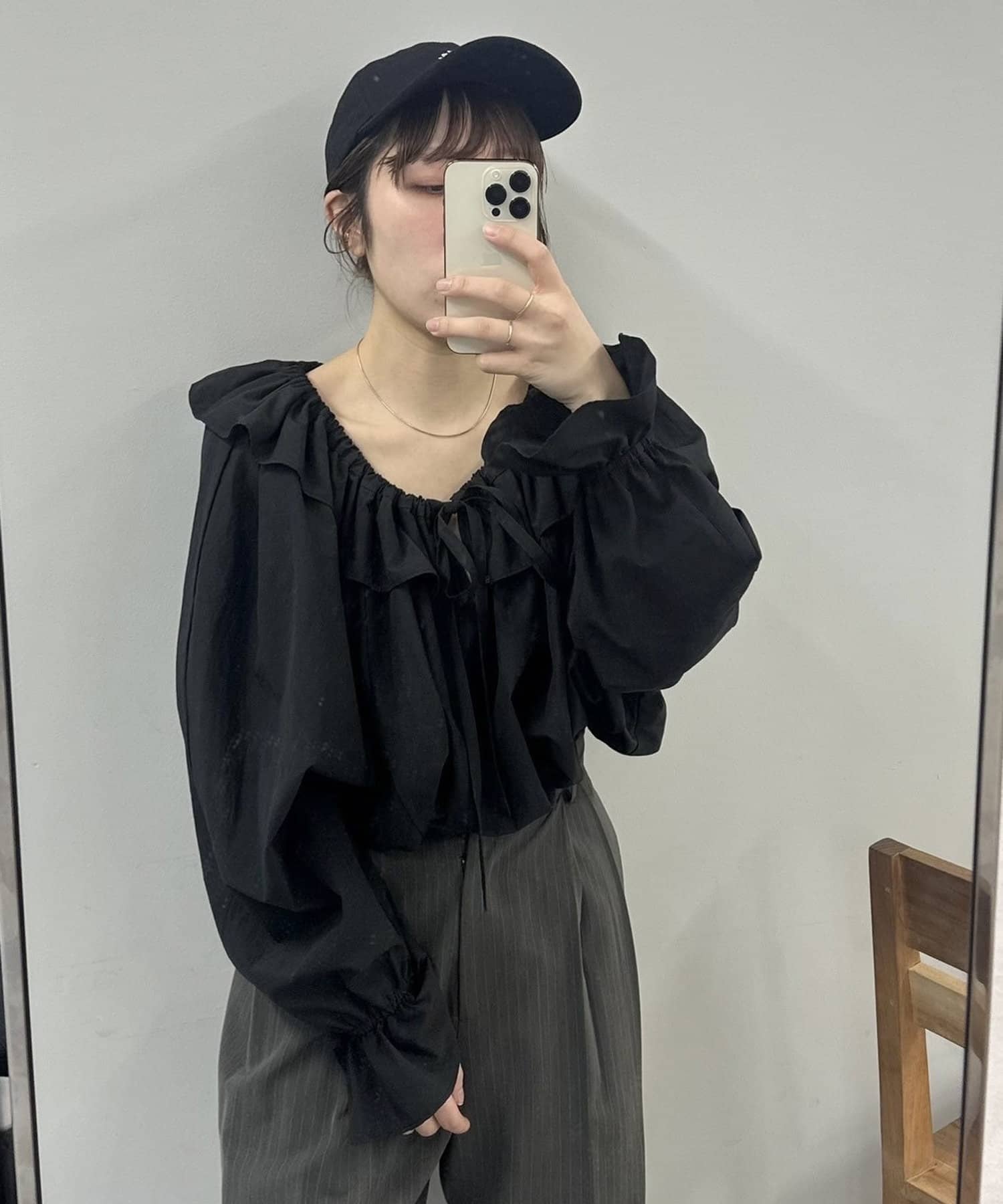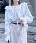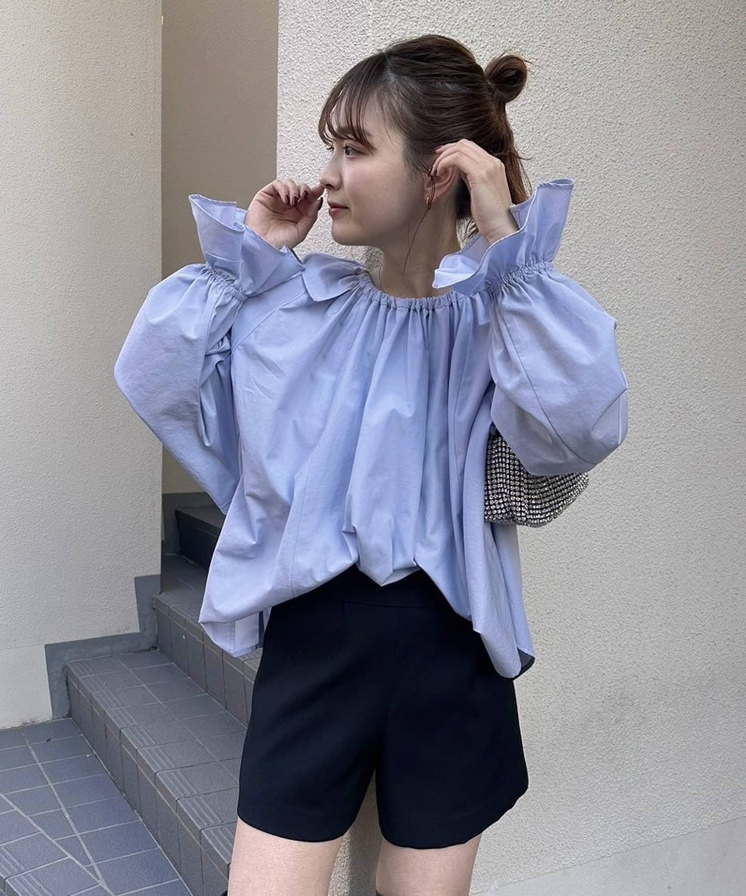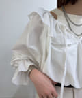 ・胸元のリボンと存在感のあるフリルがポイントで前後両前で着られる主役級ブラウス。