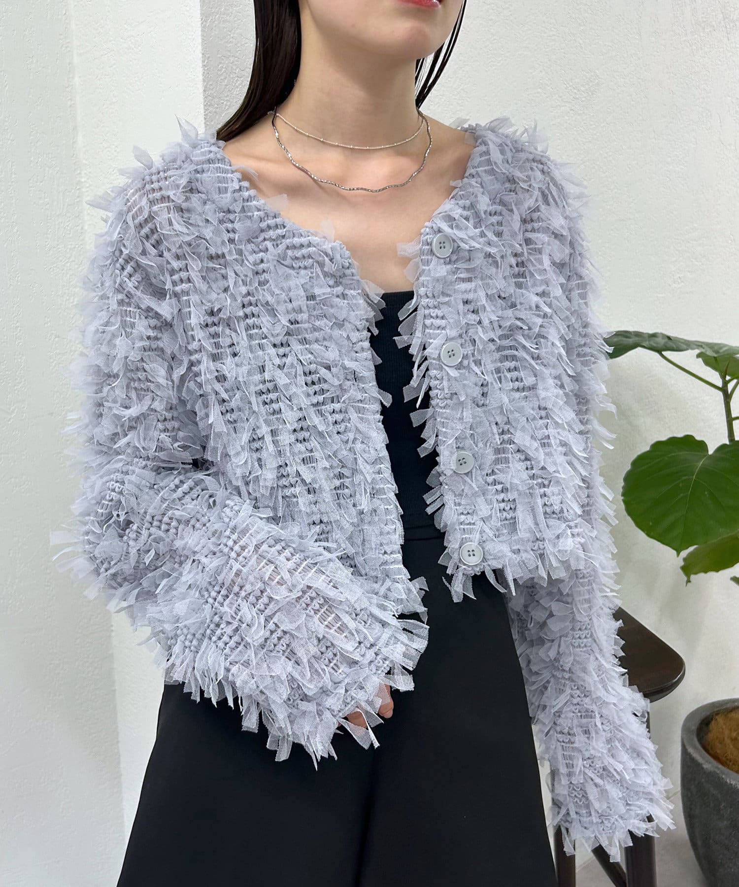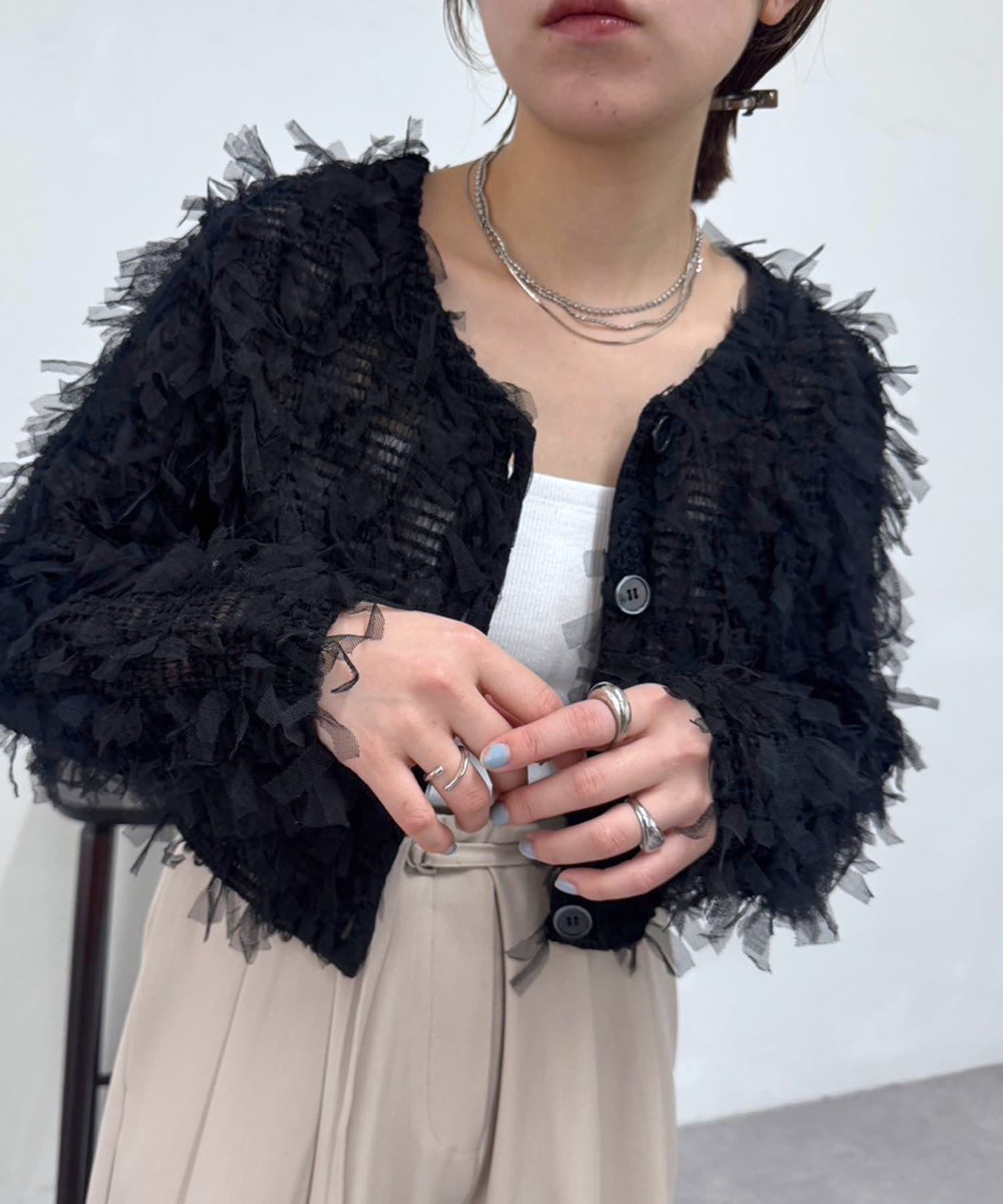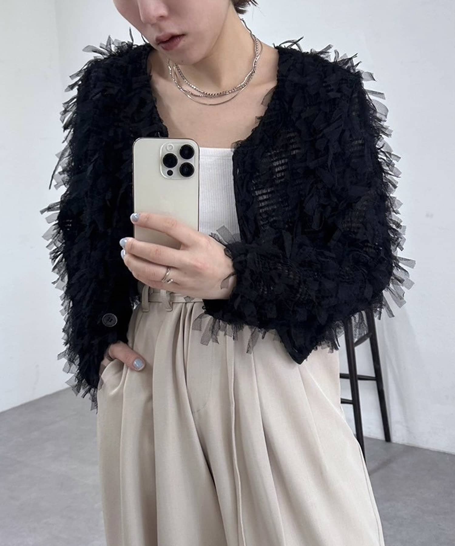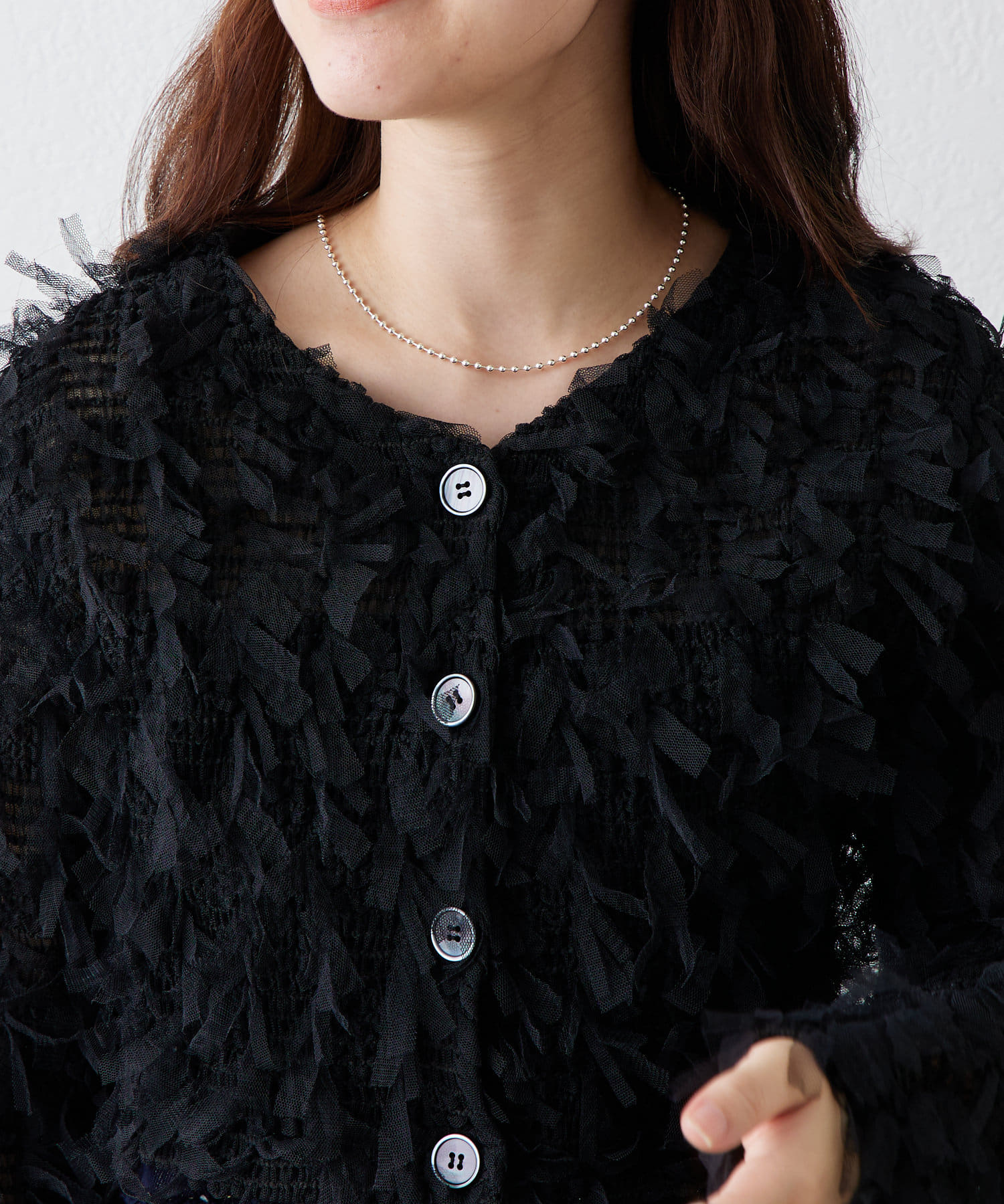 ・表面感のあるチュール素材がポイントになった一枚で着映えするカーディガン。