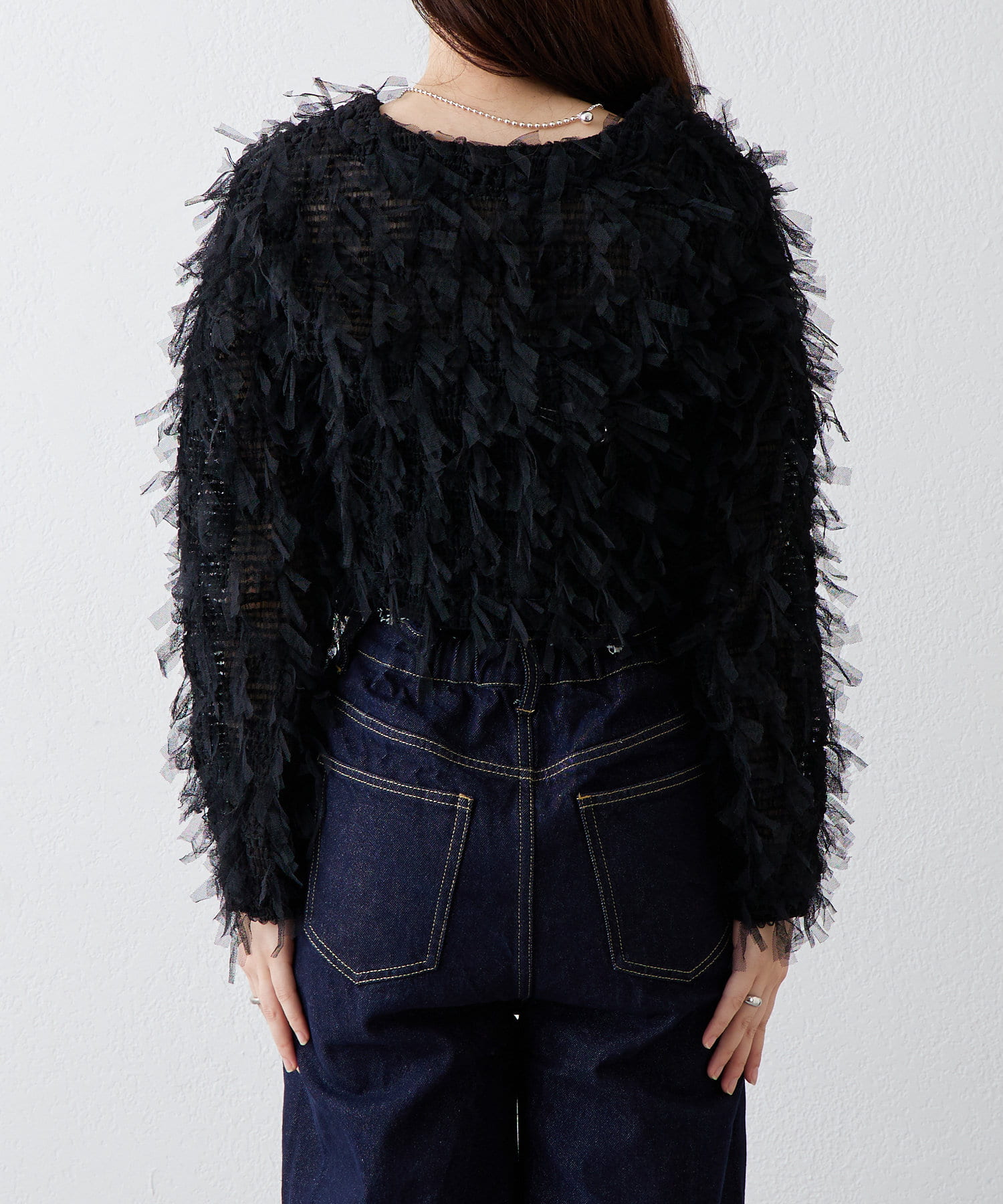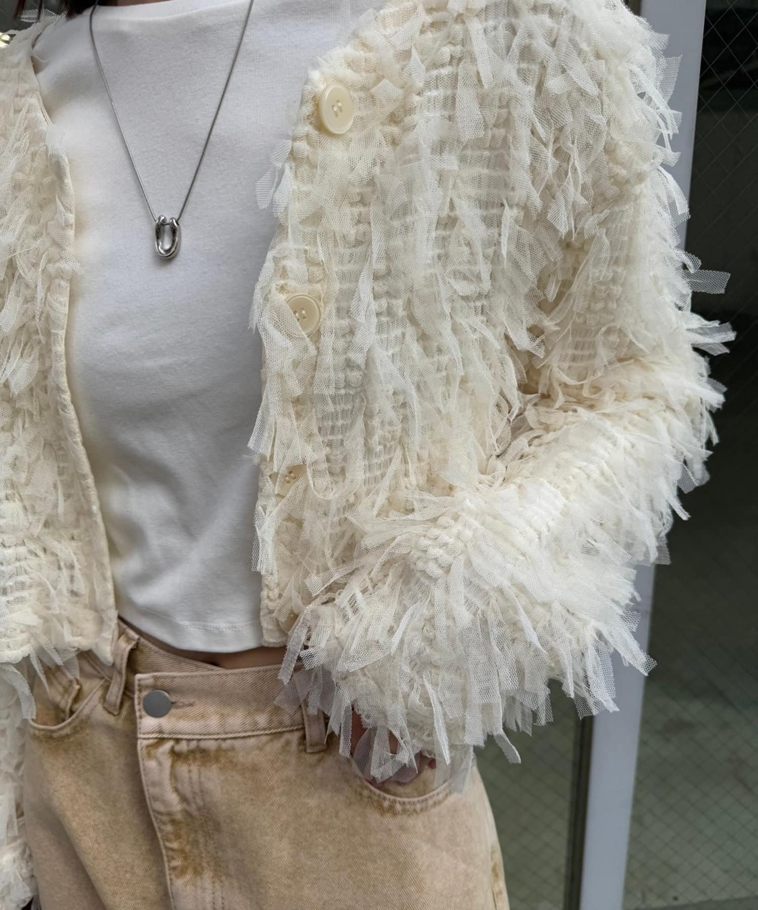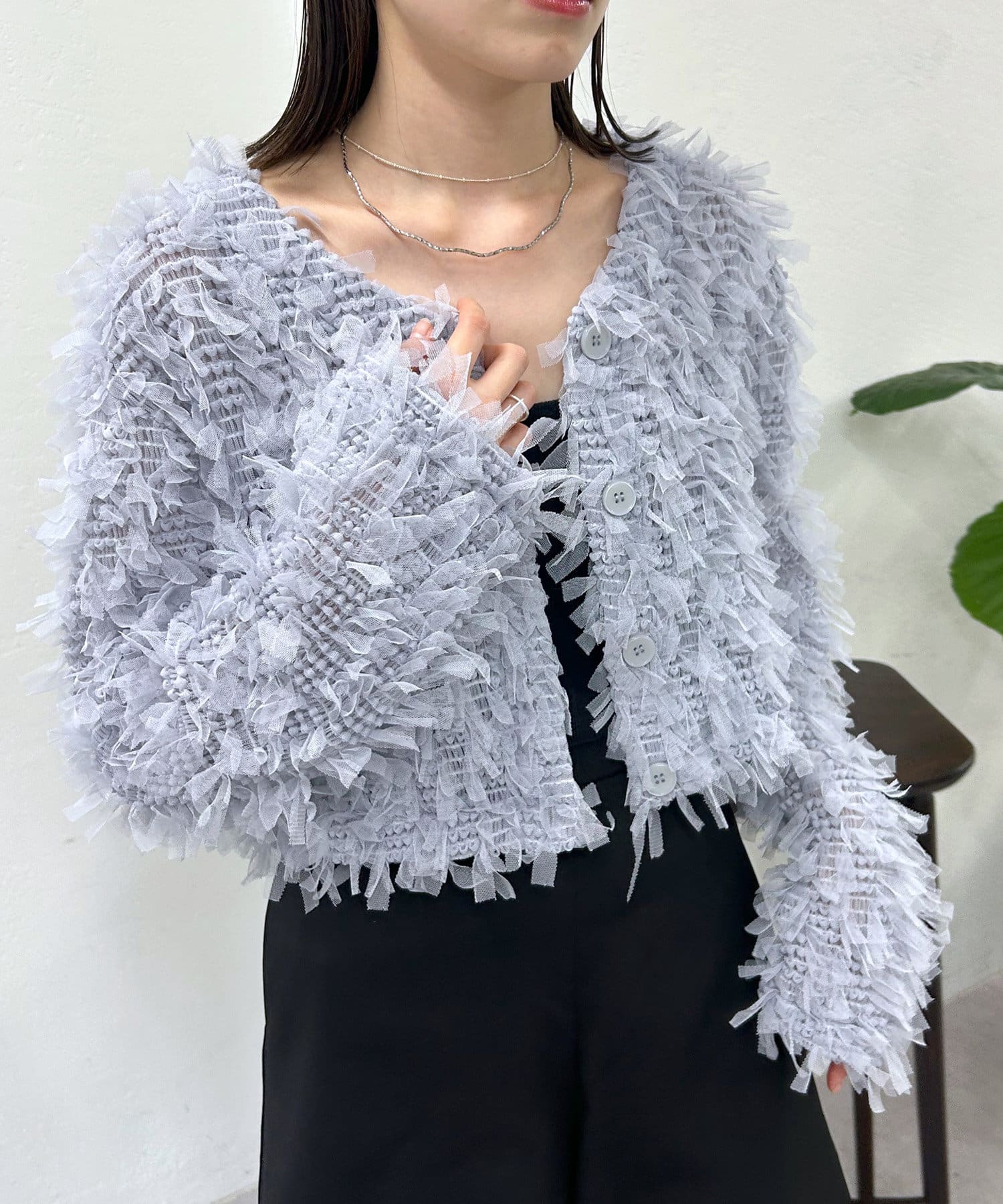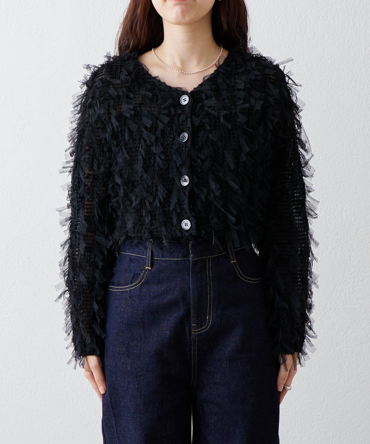 ・表面感のあるチュール素材がポイントになった一枚で着映えするカーディガン。