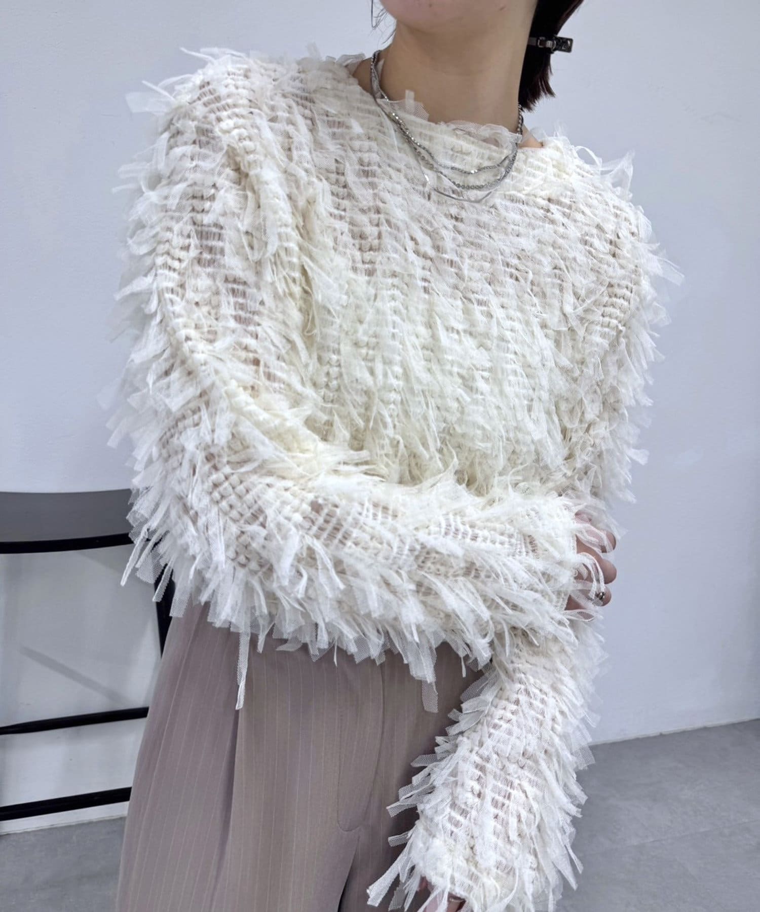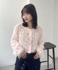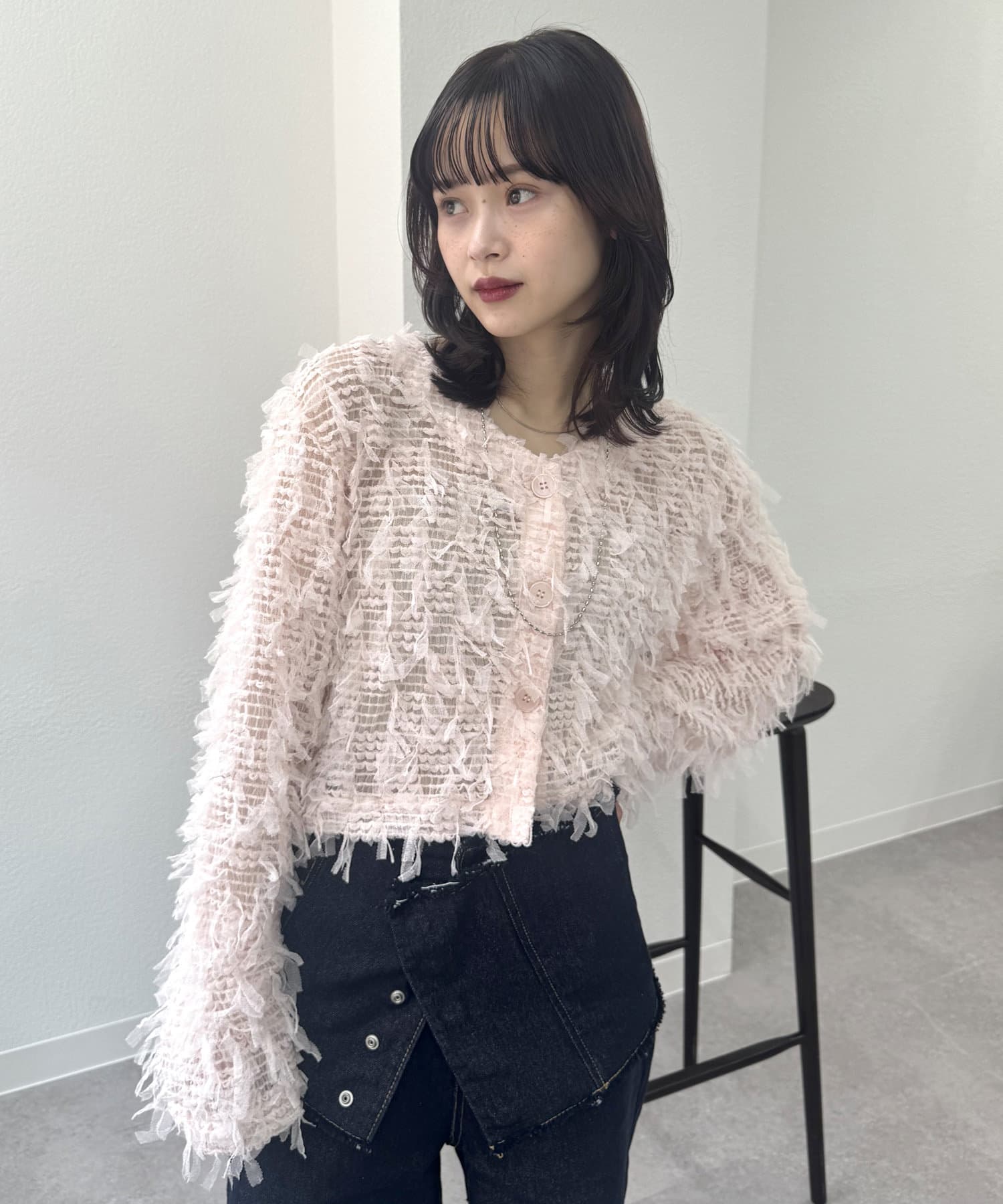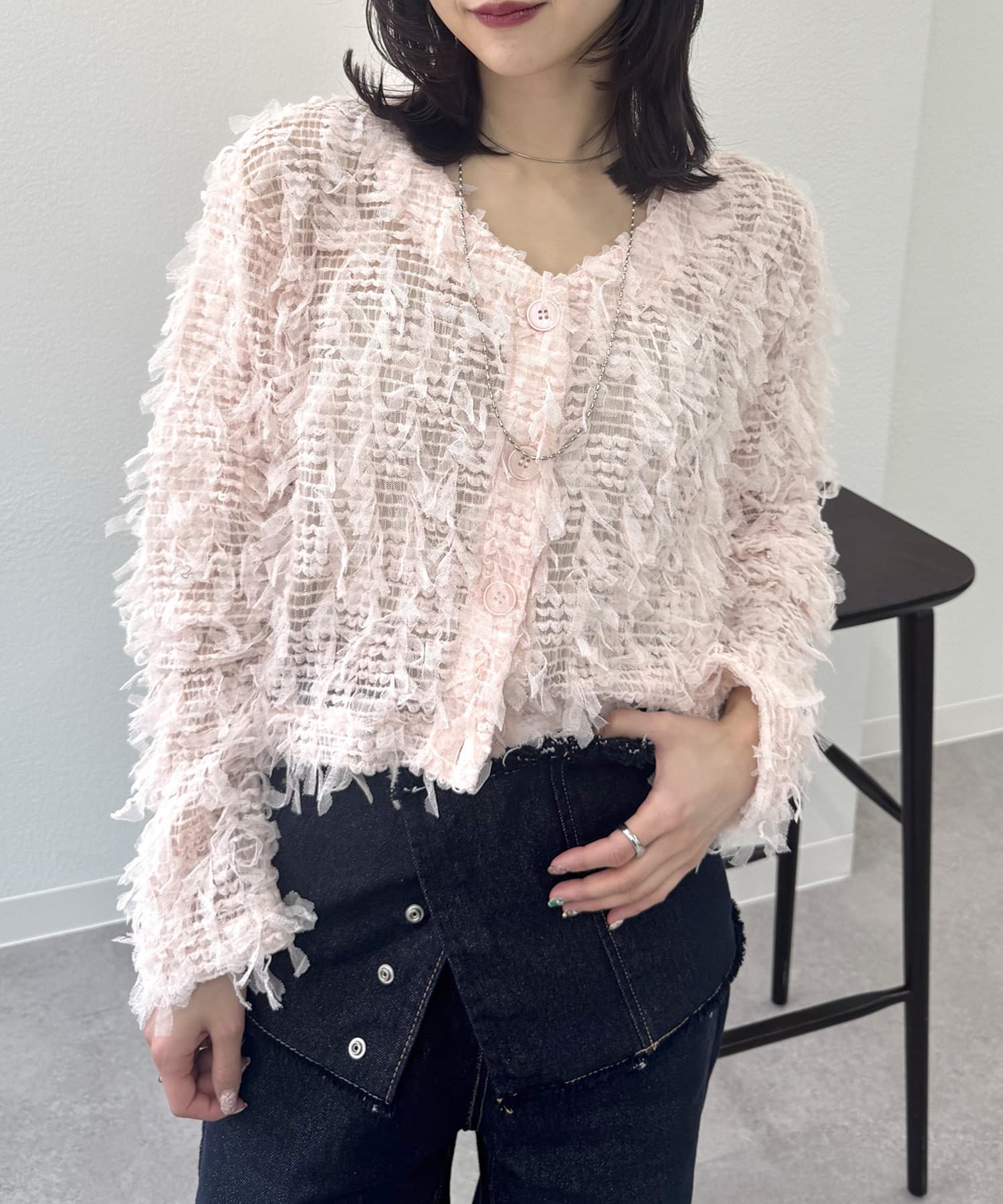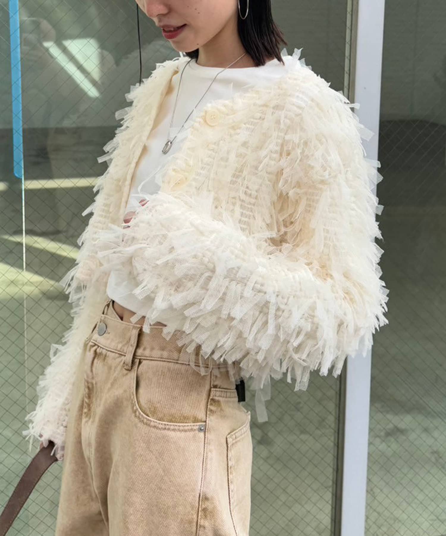 ・表面感のあるチュール素材がポイントになった一枚で着映えするカーディガン。