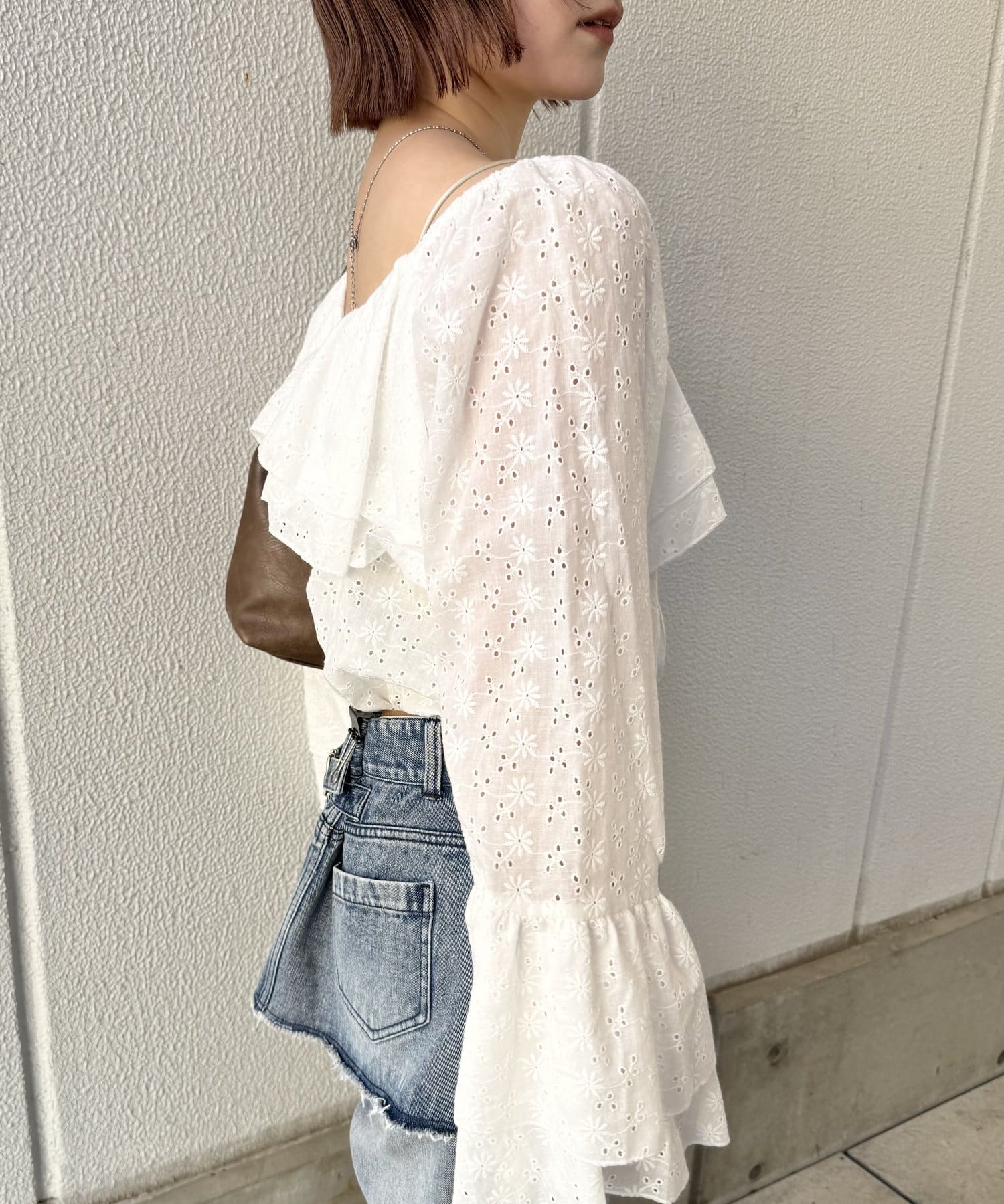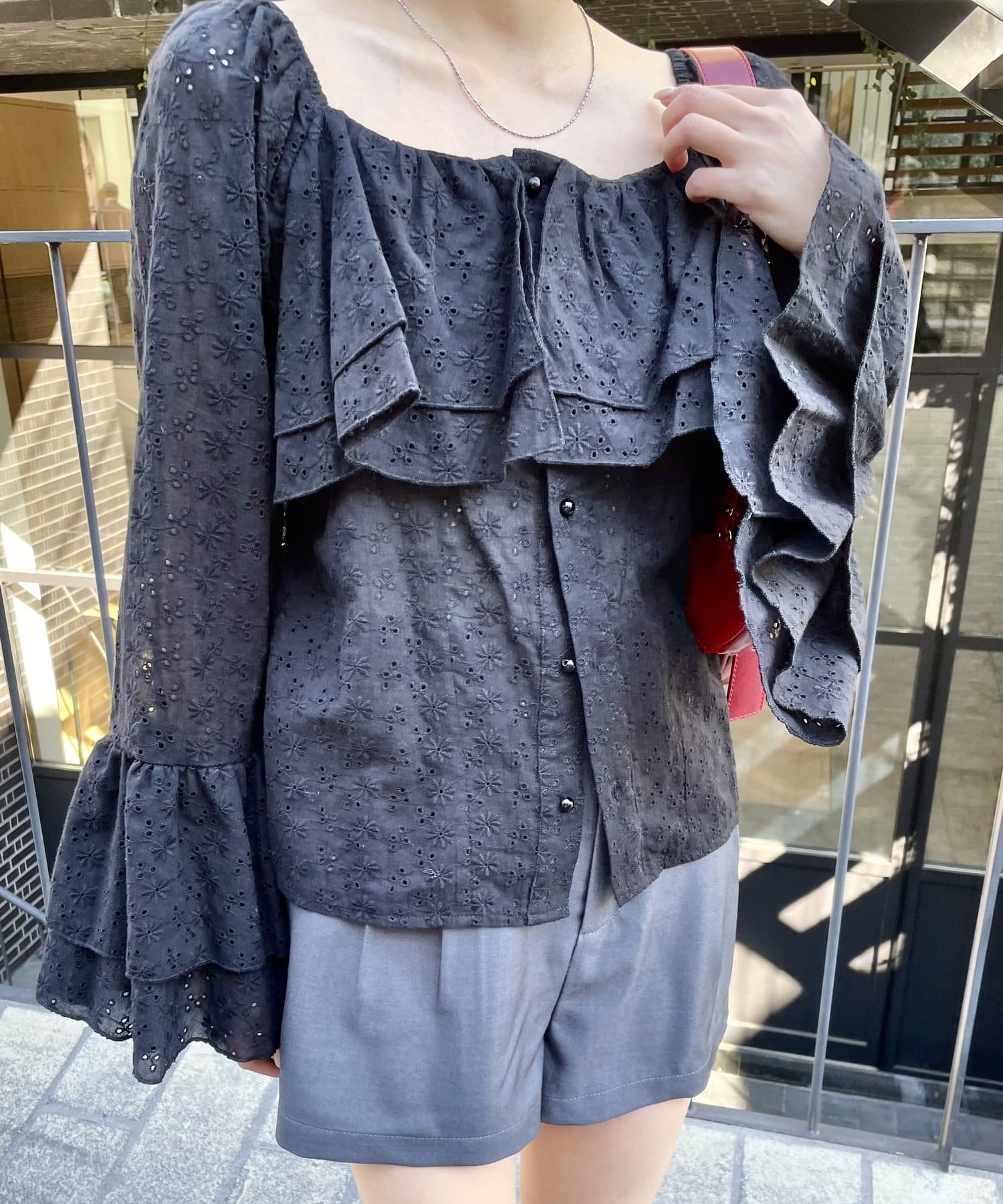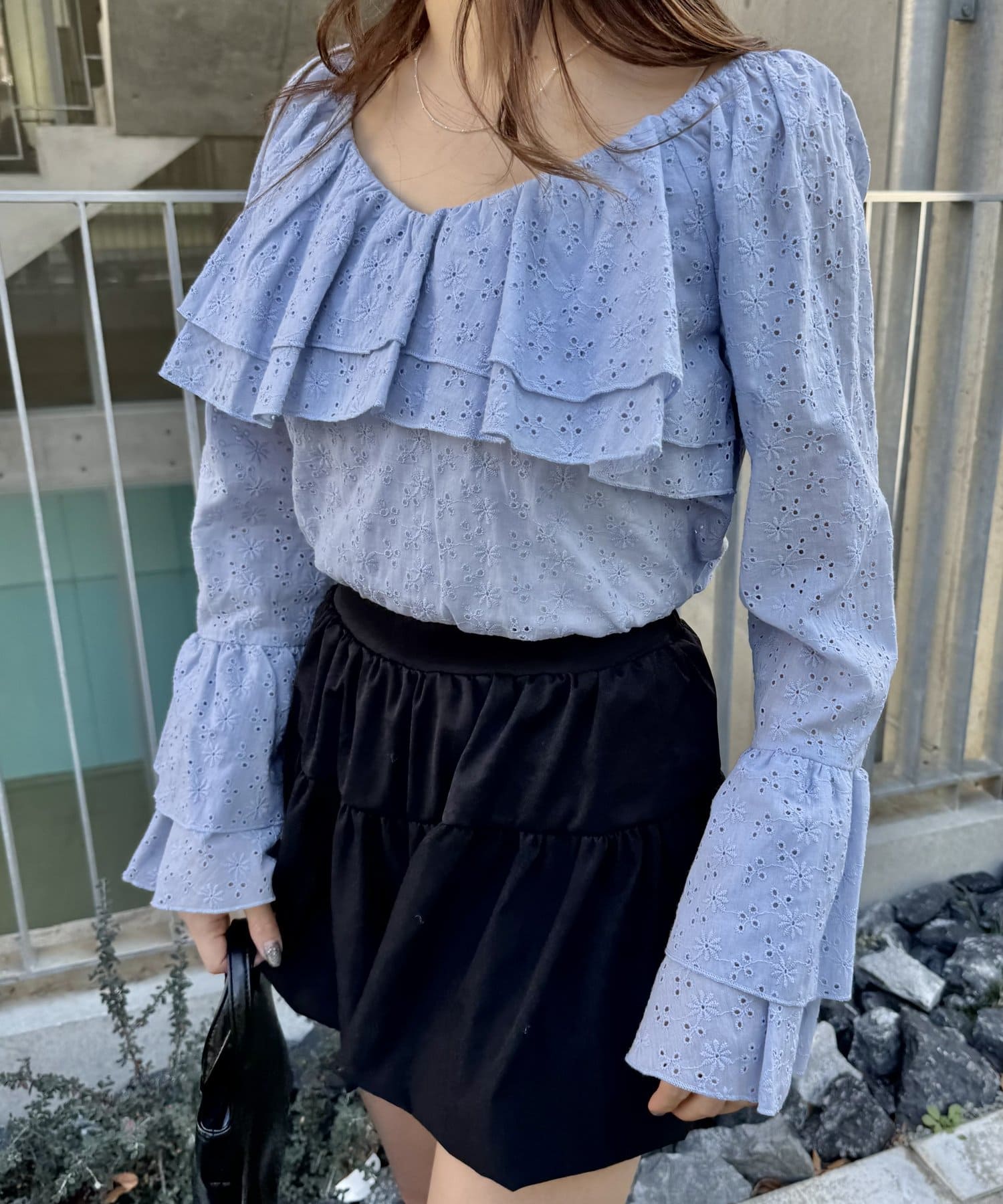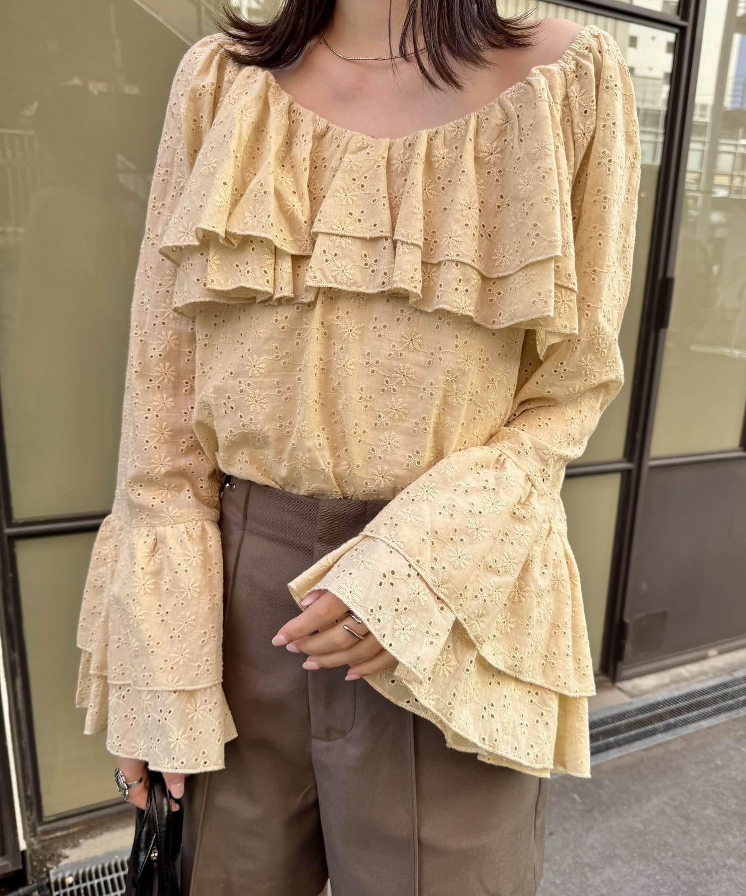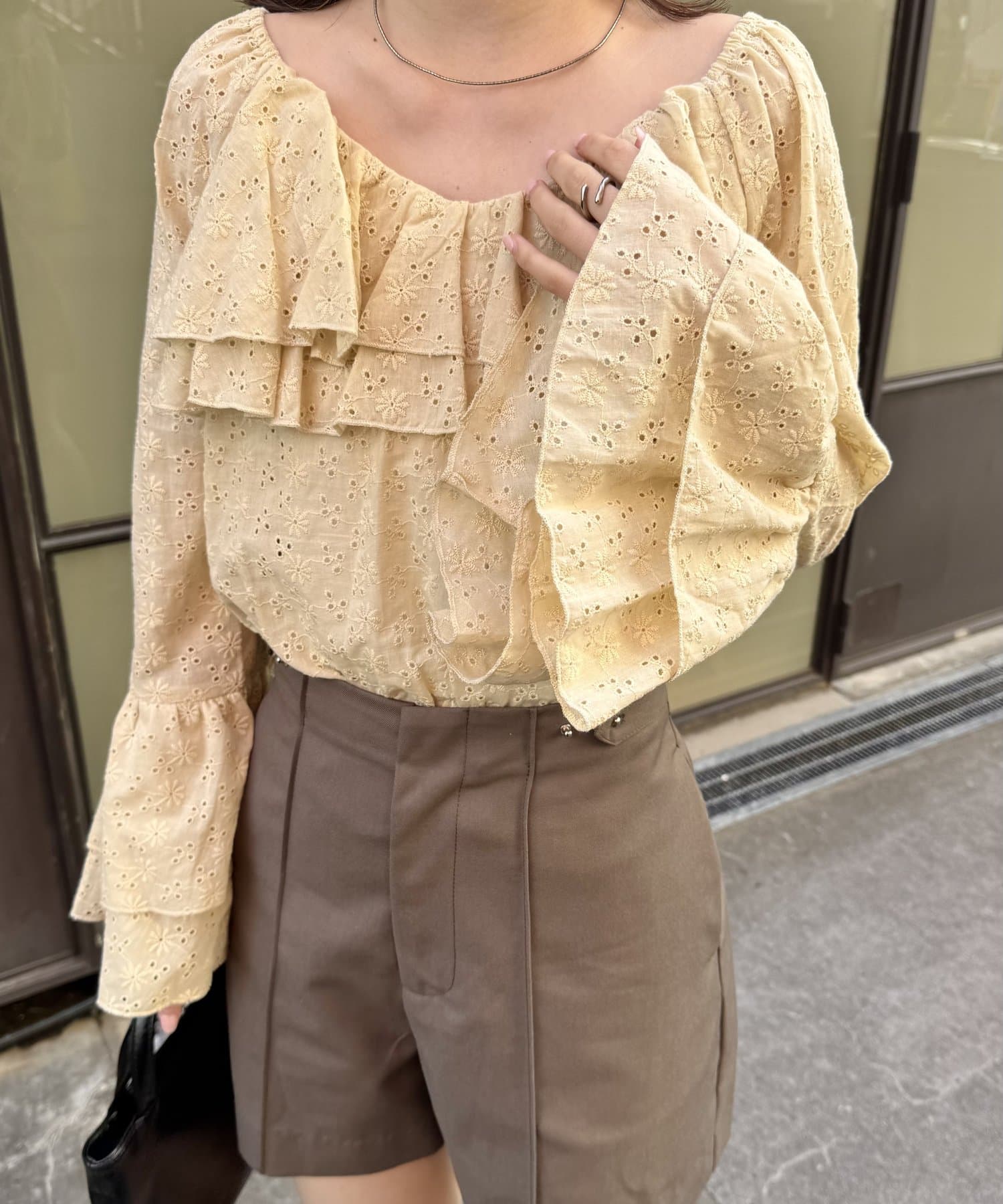 ・大き目の襟フリルと、袖先のフリルがポイントのアイテム。