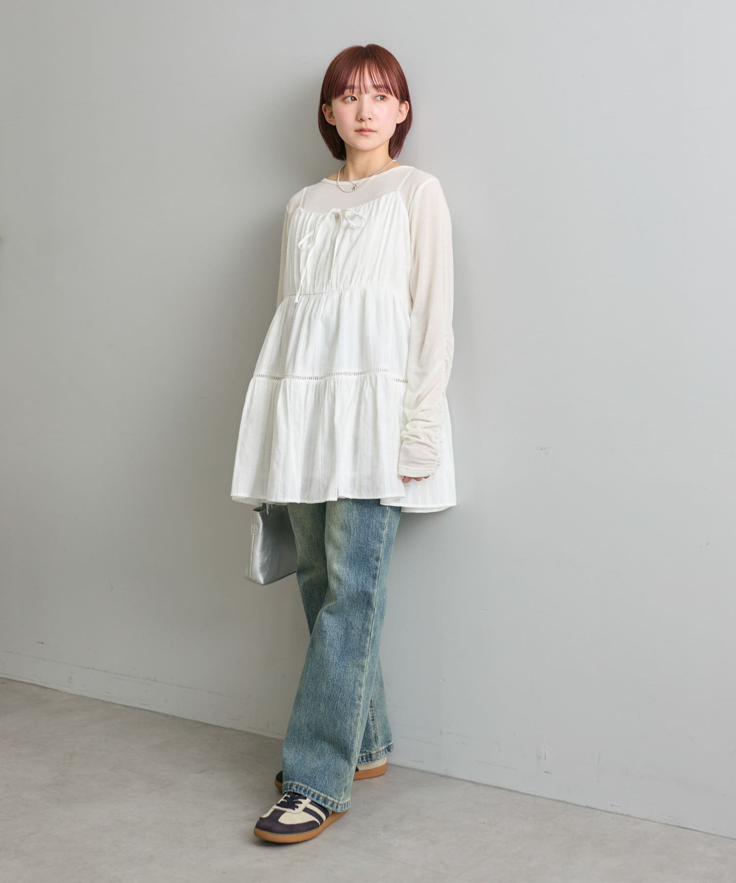 ・インナーにキャミを合わせて女性らしい肌魅せスタイルに!