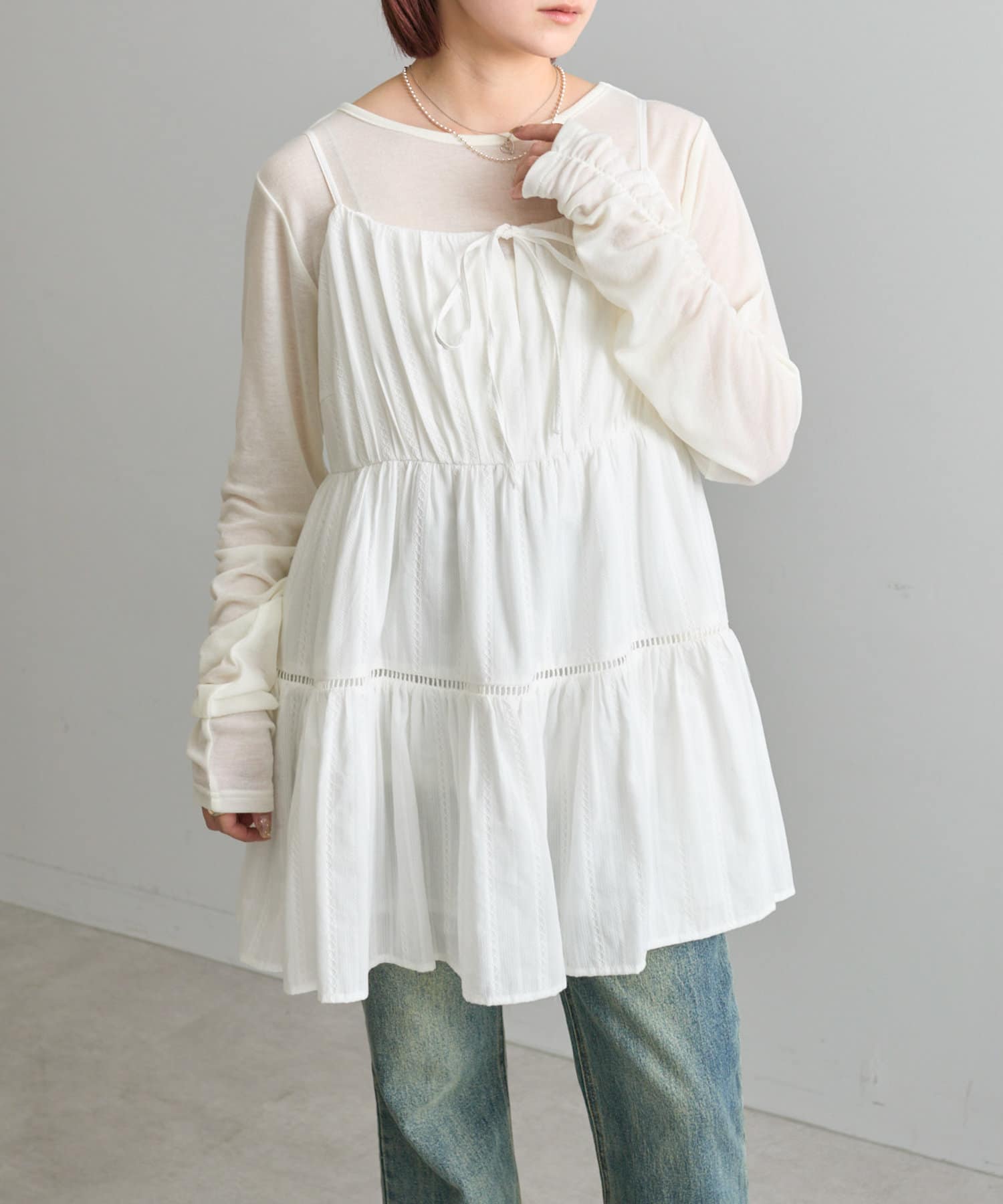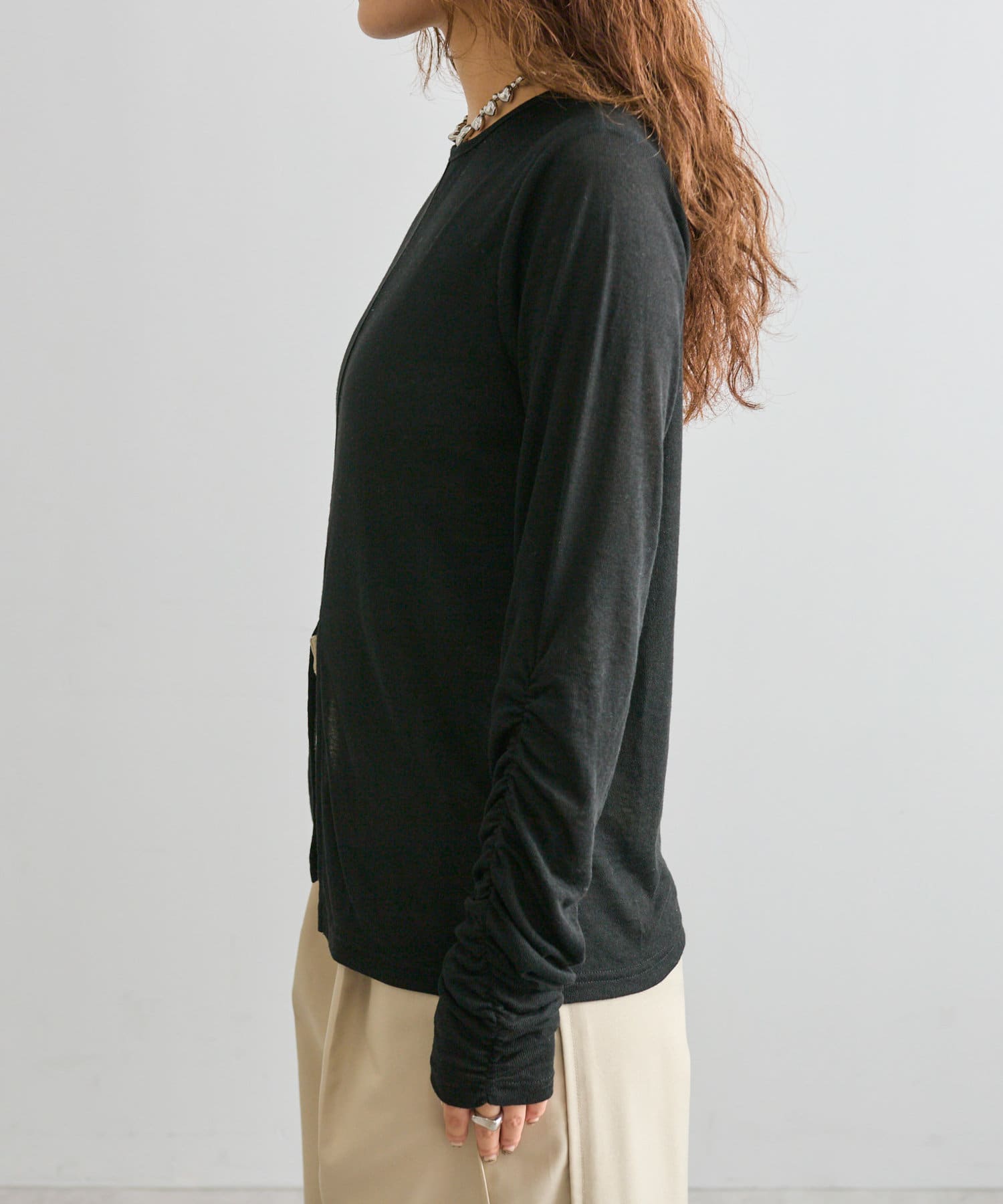袖のギャザーがかわいいので1枚で着たくなるトップスです