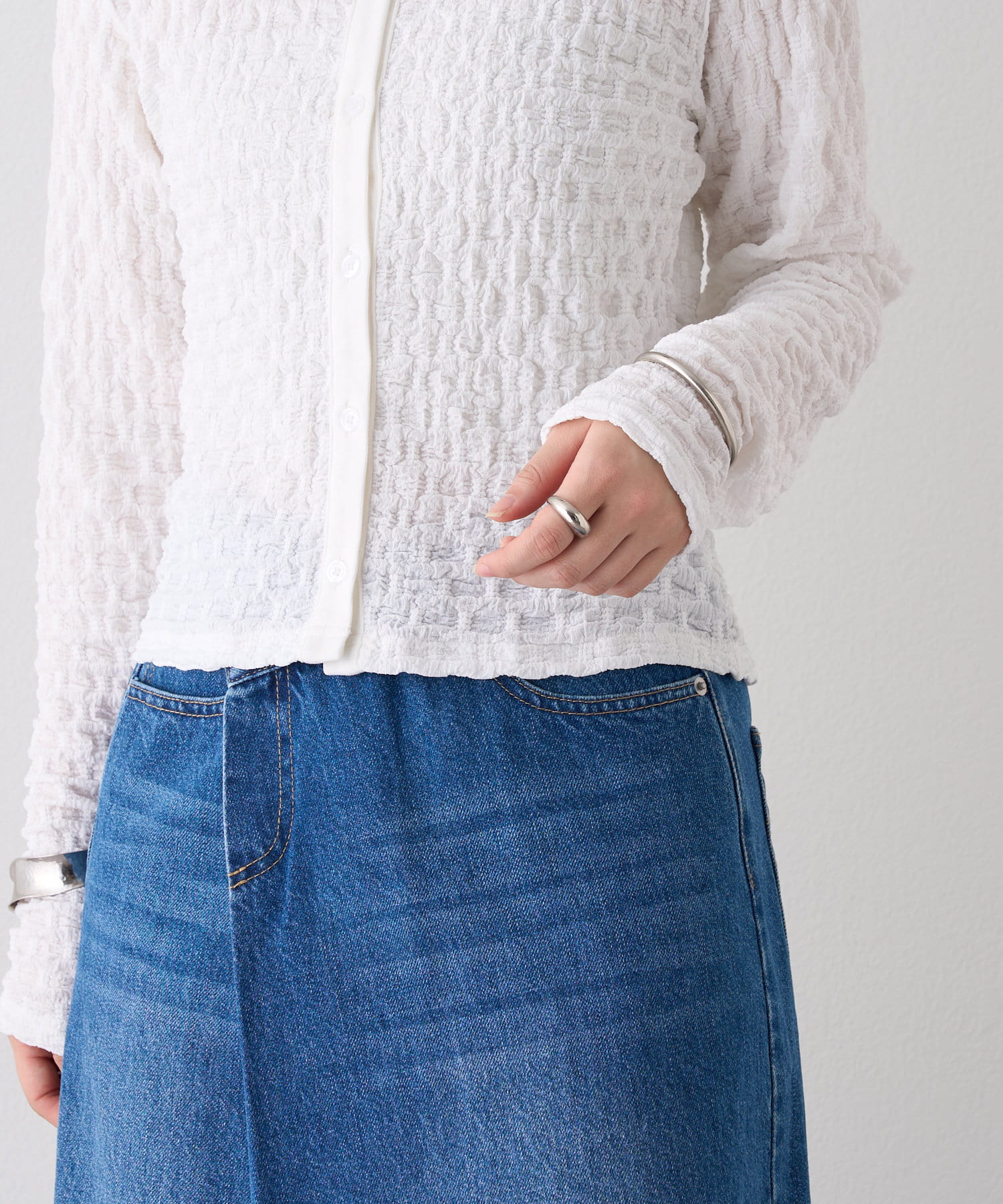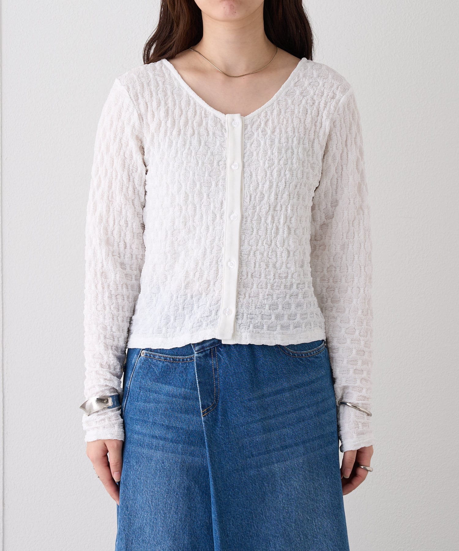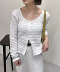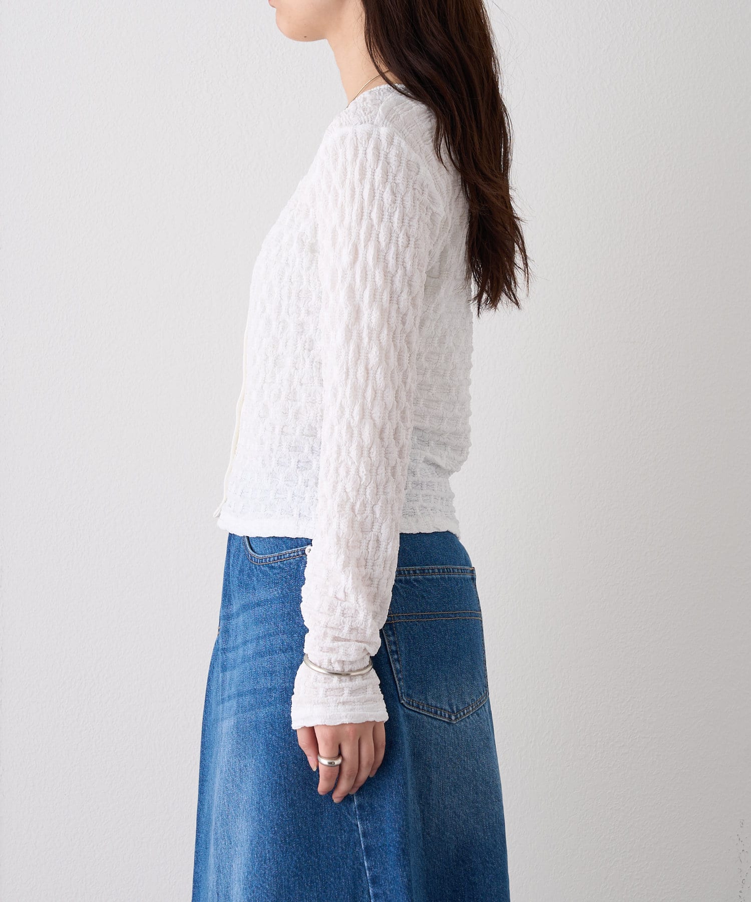 ・エンボス加工されたレース生地で女性らしい印象のカーディガン。