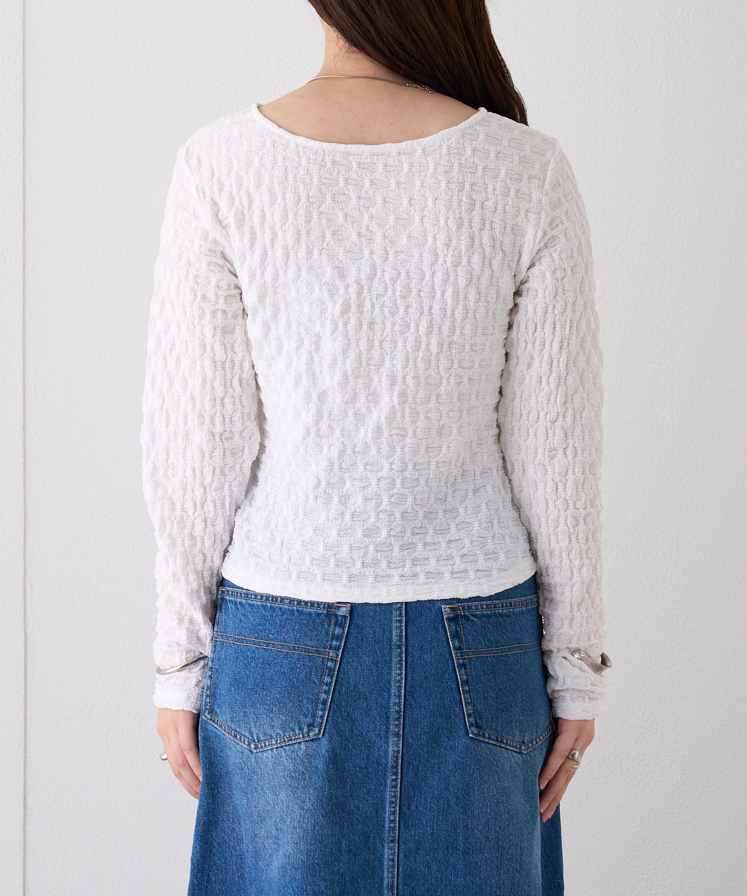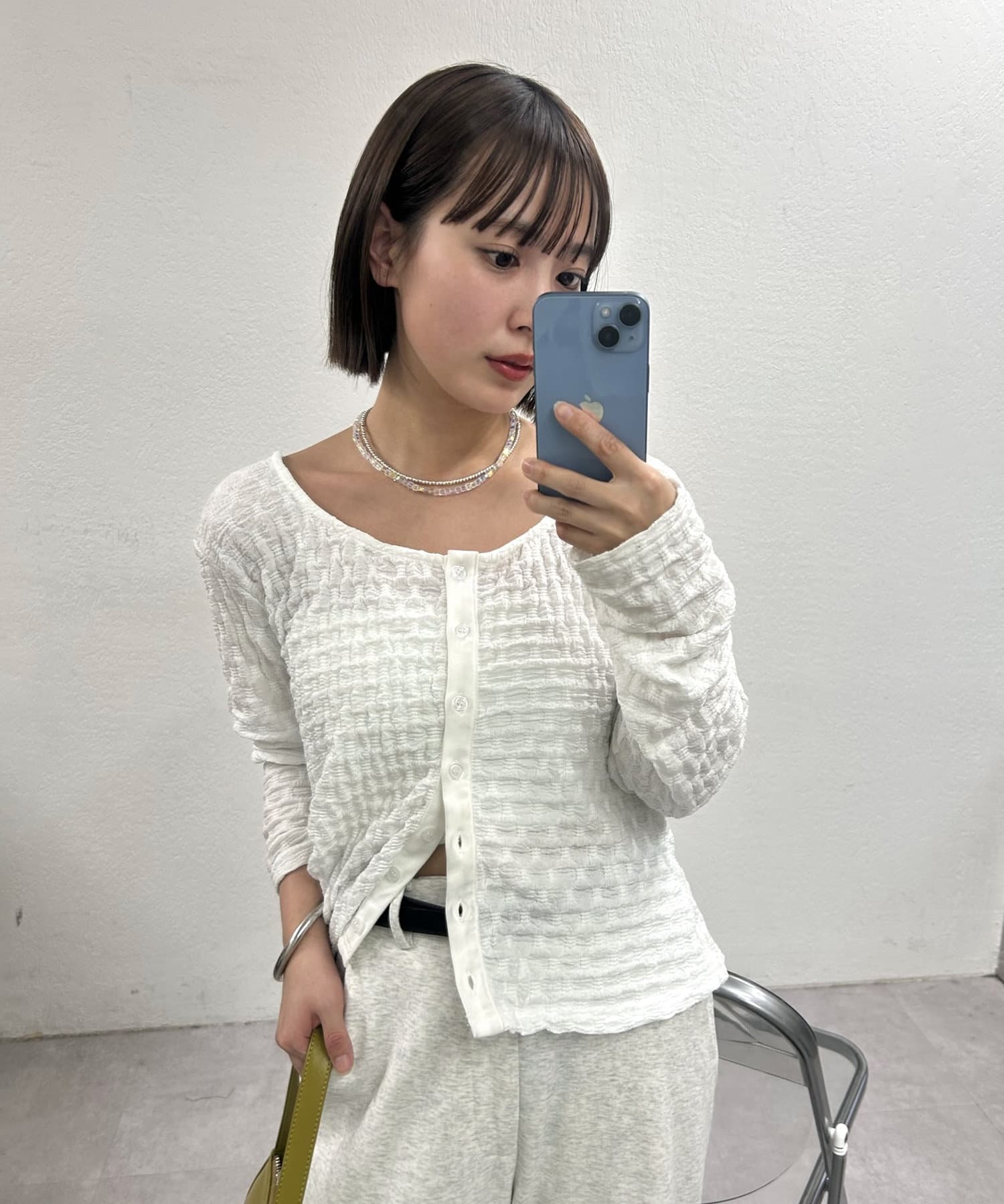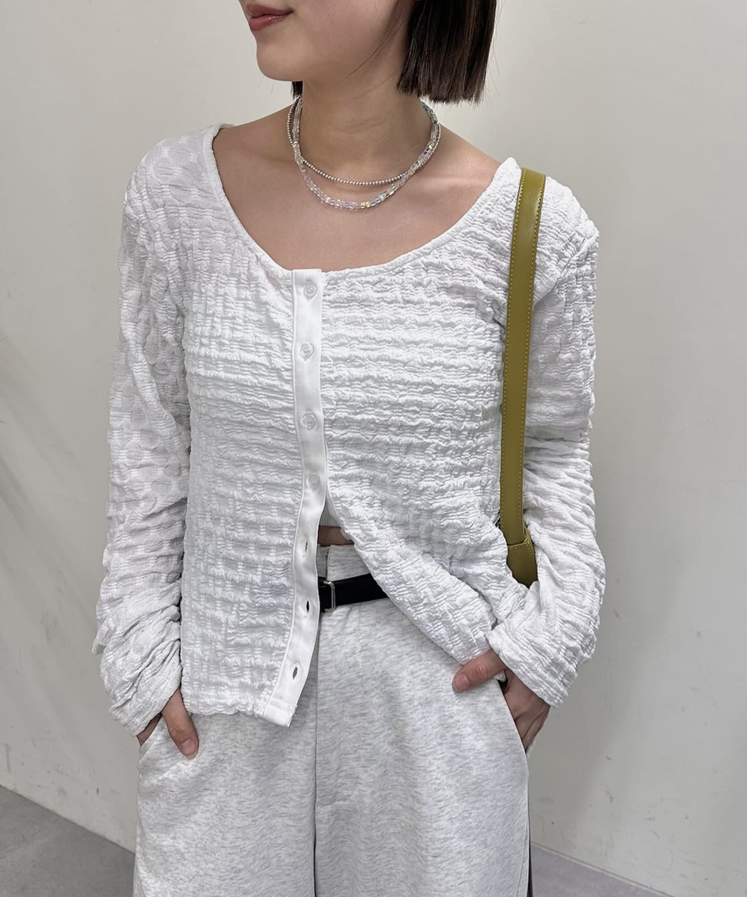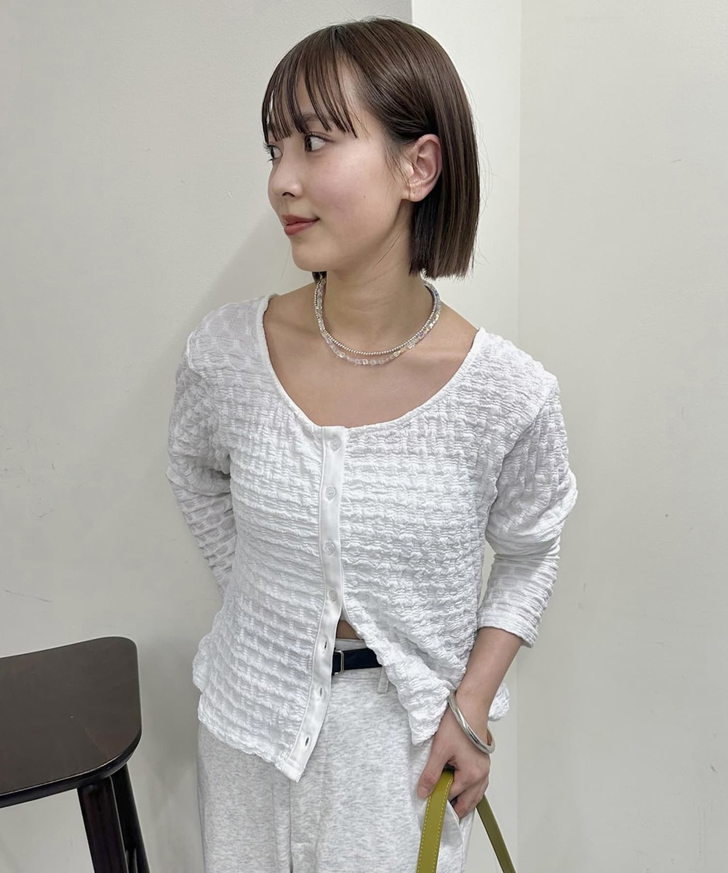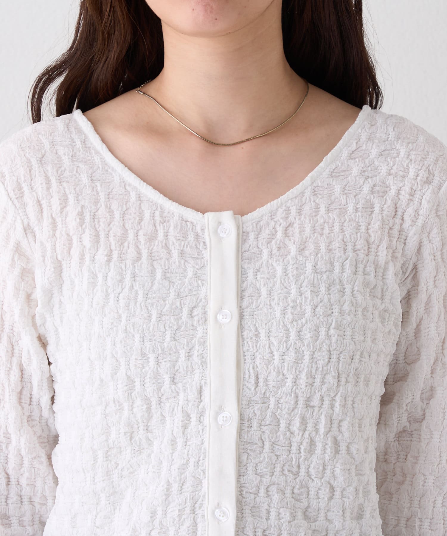 購入場所:パルクローゼットシンプルだけどポコポコ素材がデザイン性あってオシャレみえします!意外とホワイトでも透けにくくてインナーに困らないのが助かります