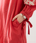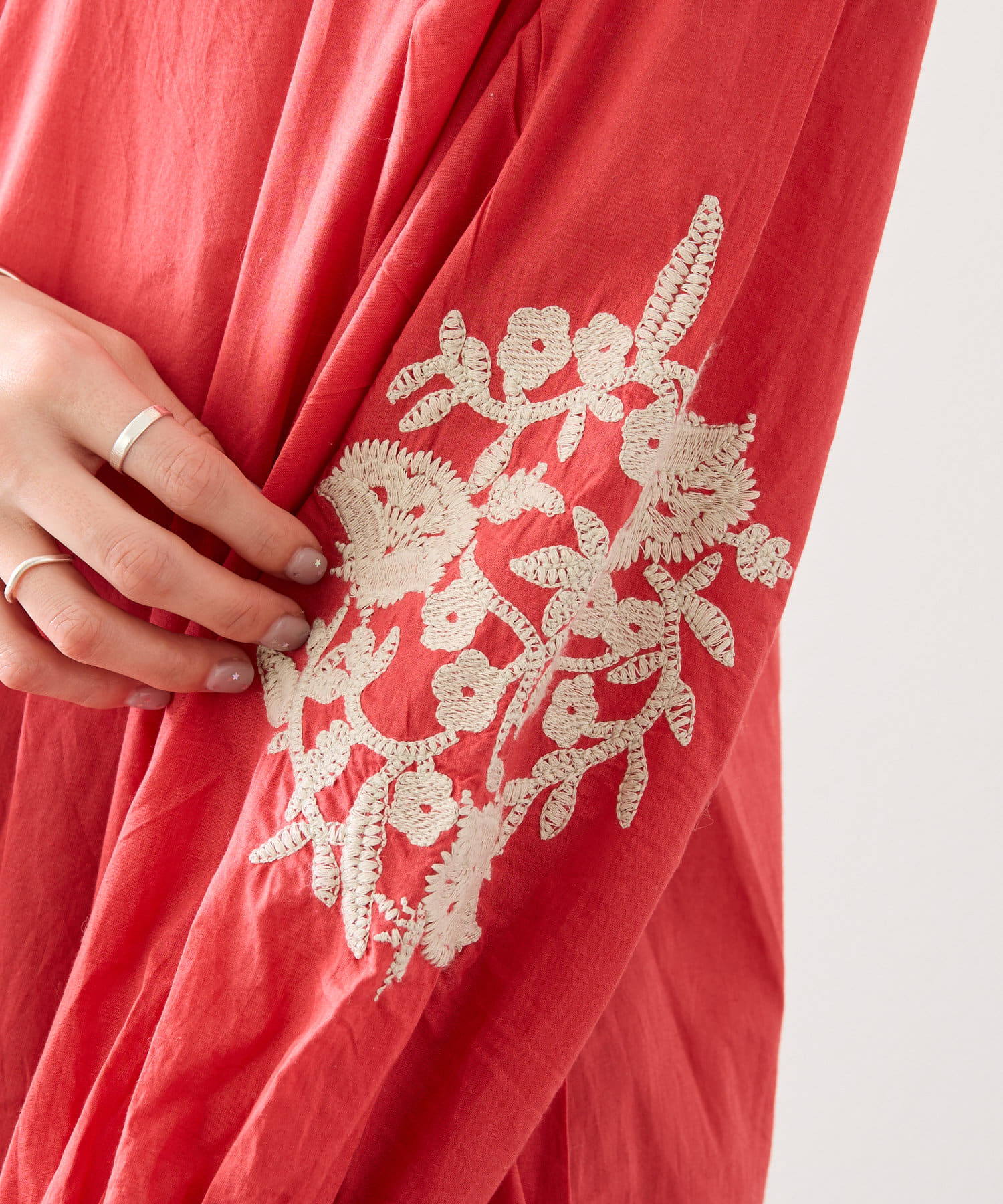 赤は着る機会が少ないのですが、インド綿&刺繍につられて購入しました。写真通りの綺麗な赤です。ファーベストなどと合わせて秋口も着たいと思います。