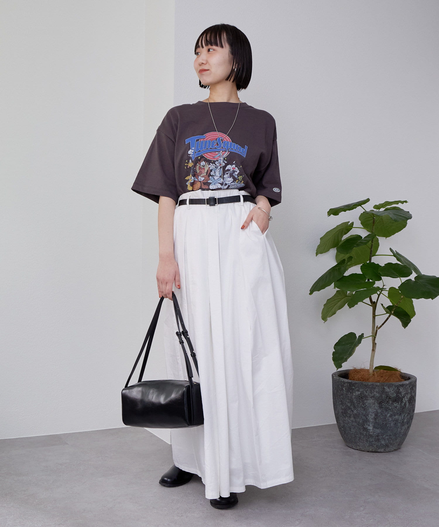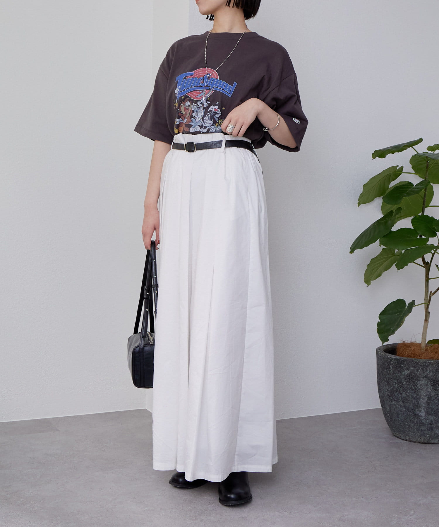 ・ボリューム感のあるボトムスなので、すっきりコンパクトなシルエットのトップス合わせでバランス良く決まります◎