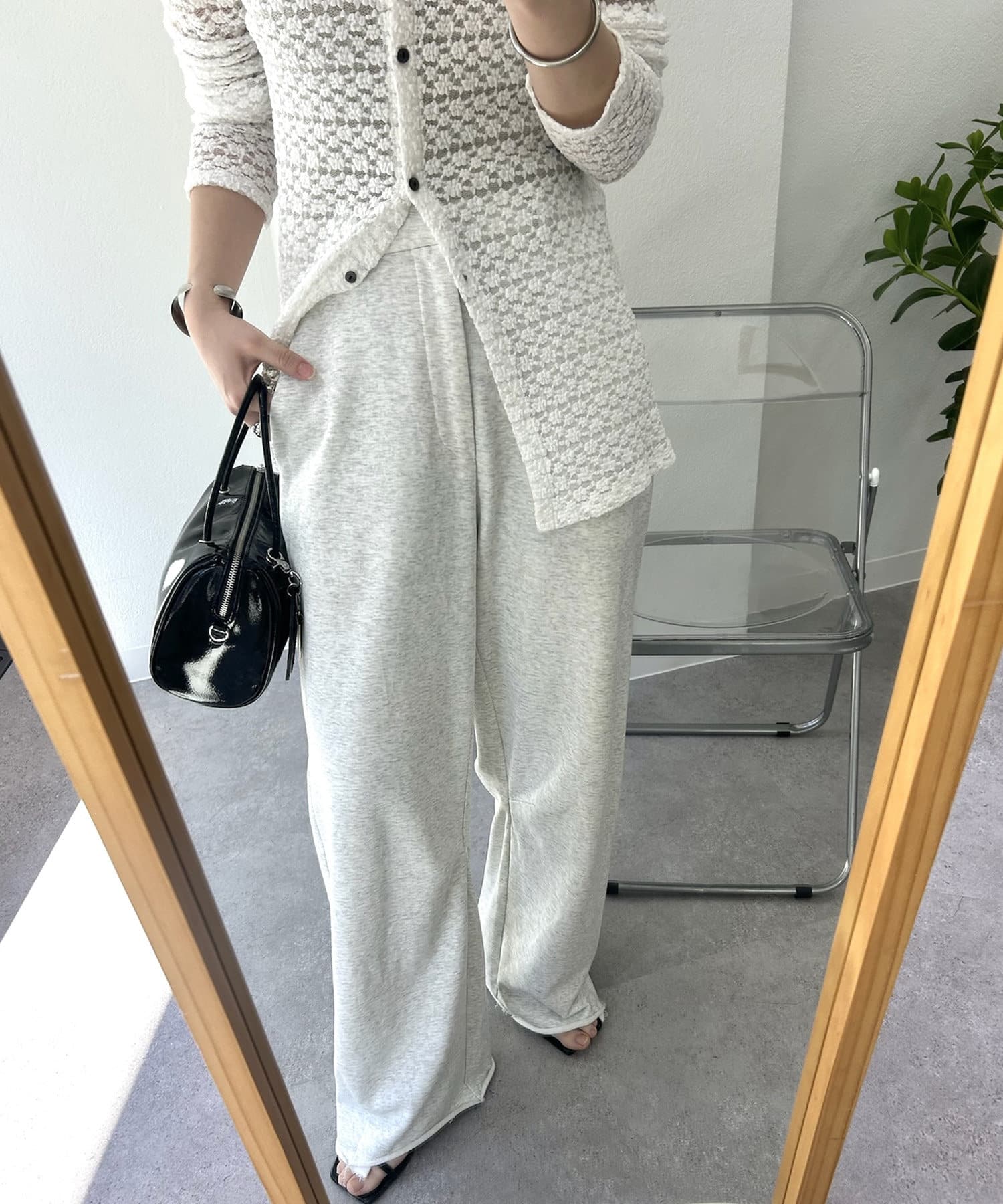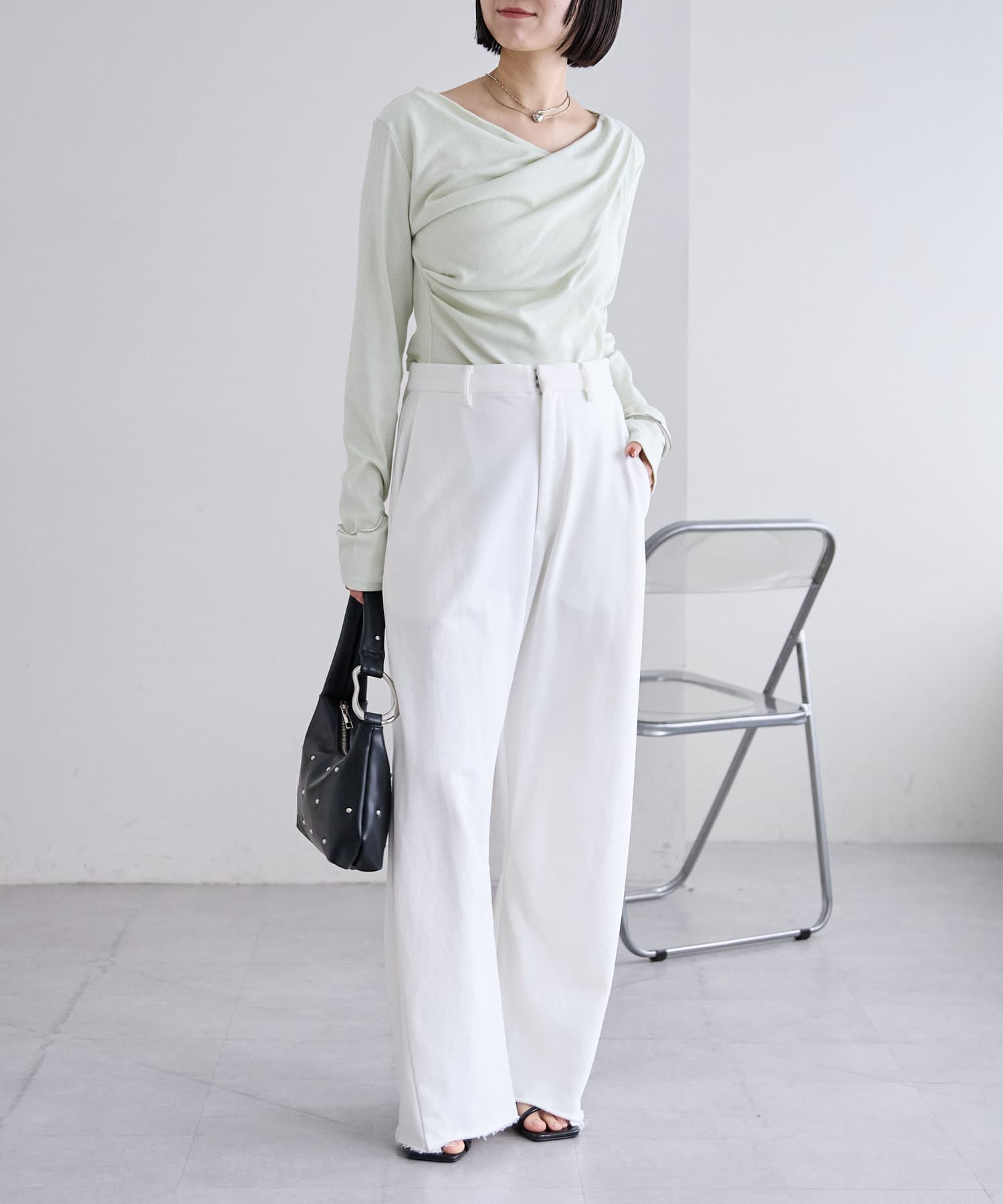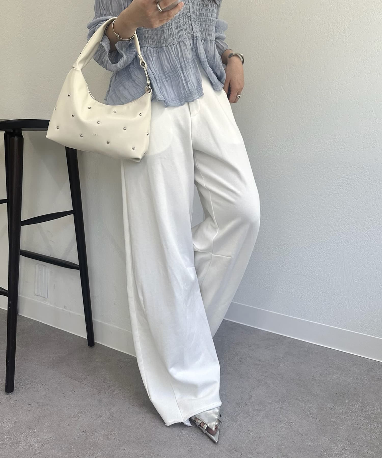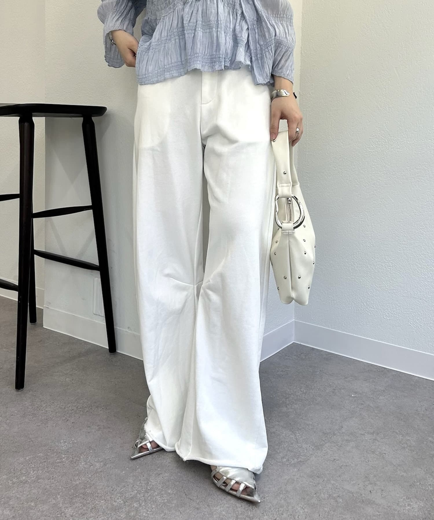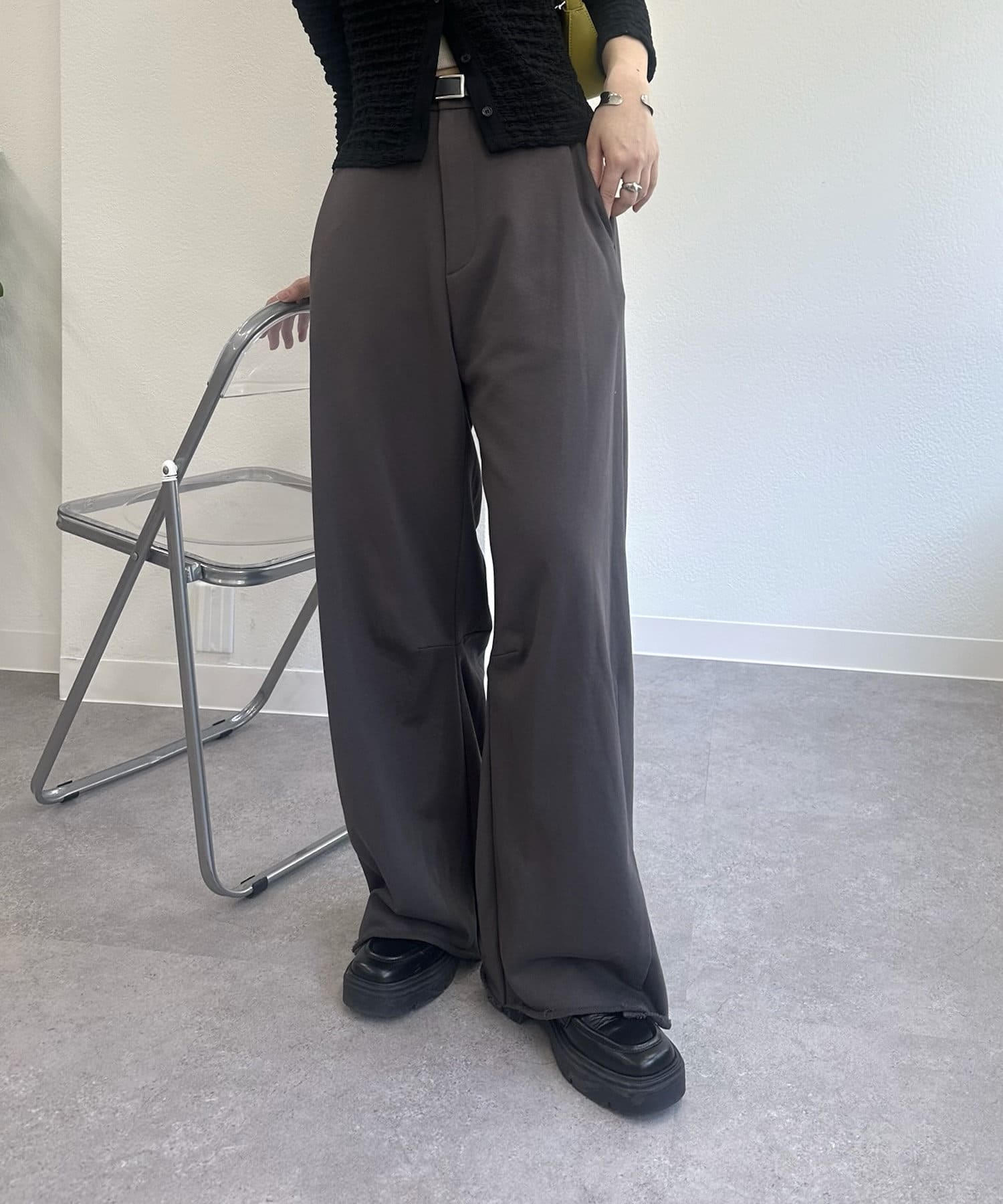 切りっぱなしデザインでカジュアルダウンしてくれるので、ヒールやパンプスと合わせるとバランスが取れるのでおすすめです♩