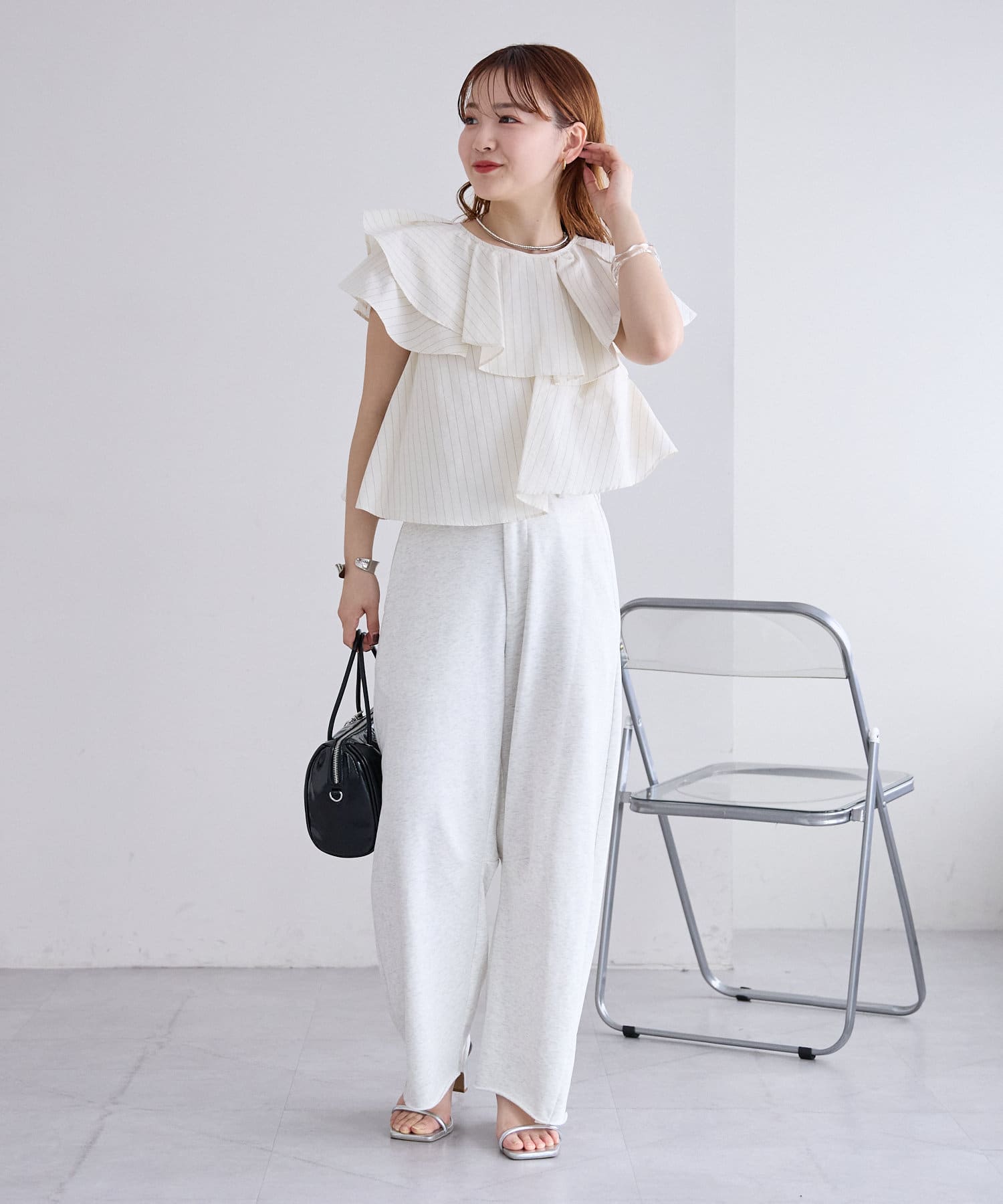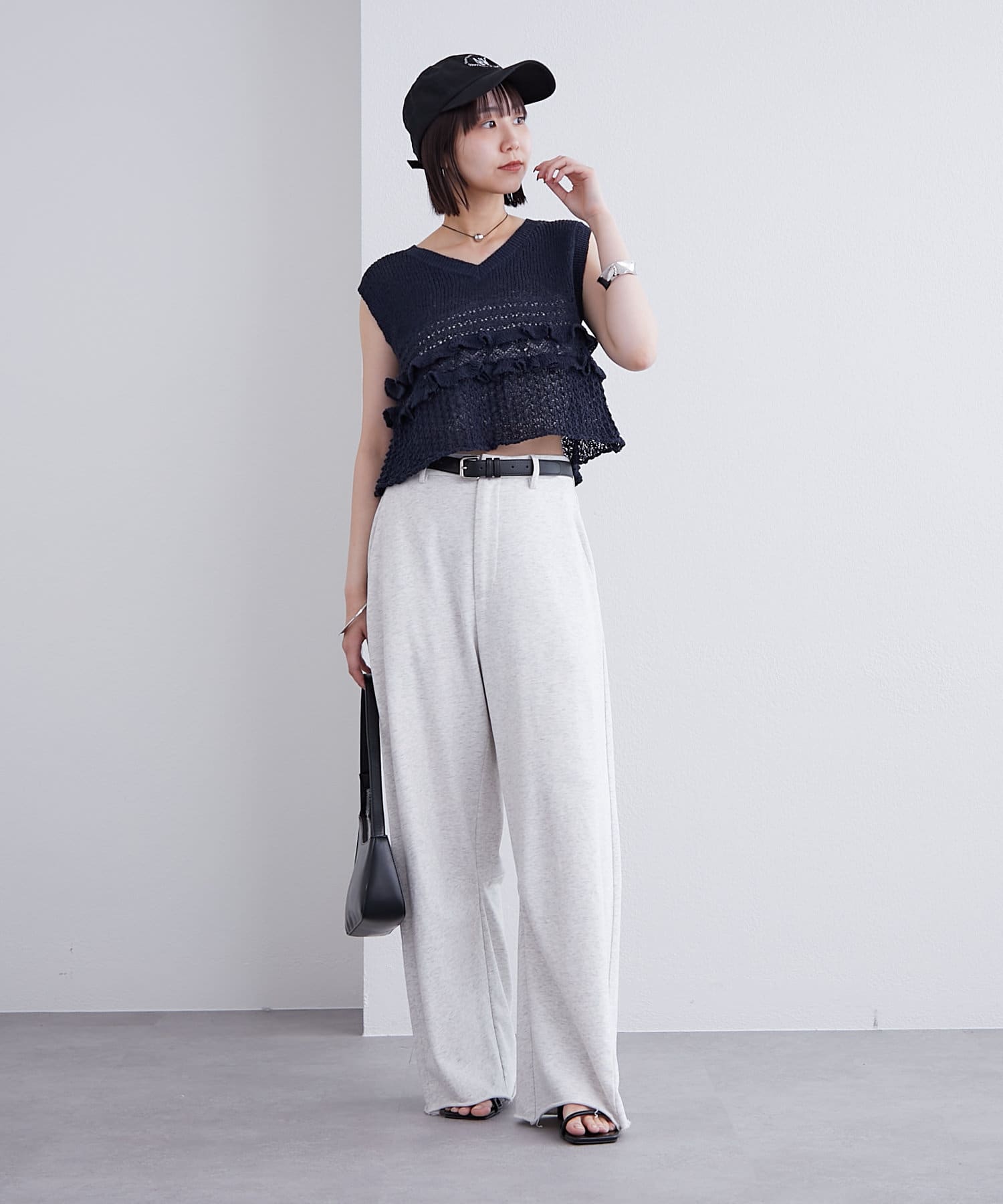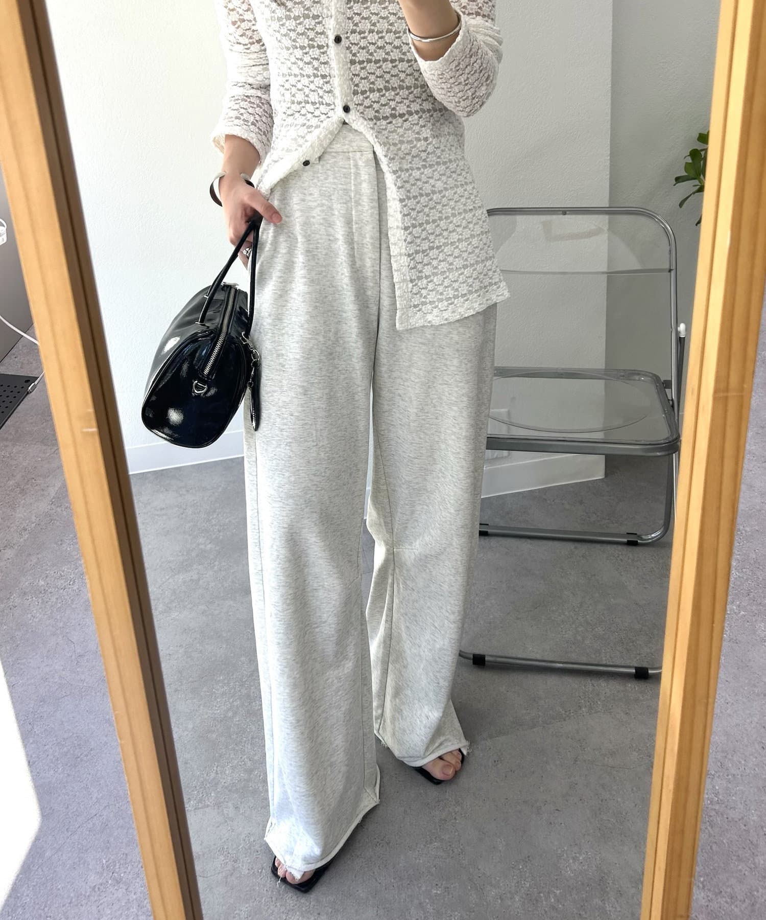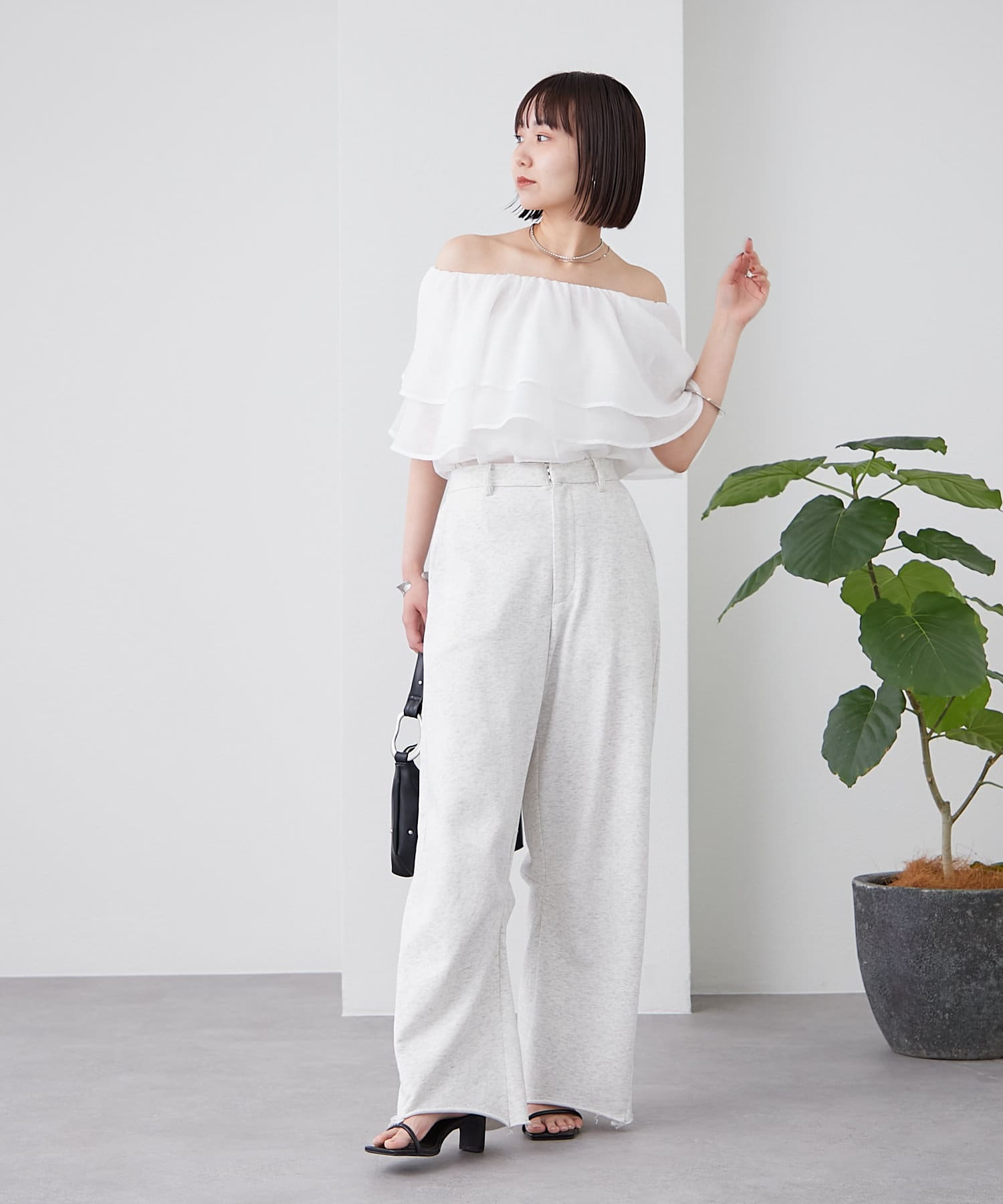 切りっぱなしデザインでカジュアルダウンしてくれるので、ヒールやパンプスと合わせるとバランスが取れるのでおすすめです♩