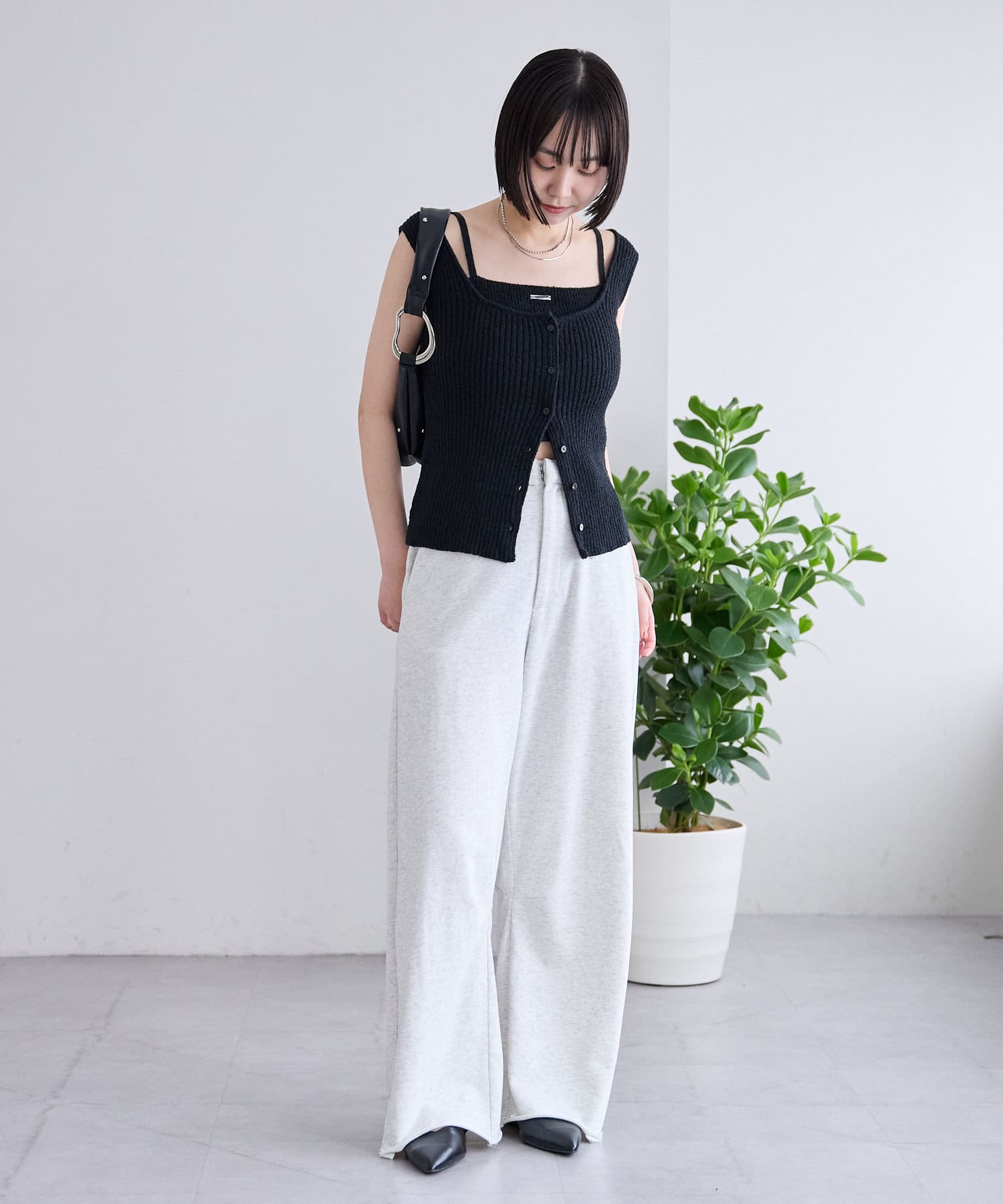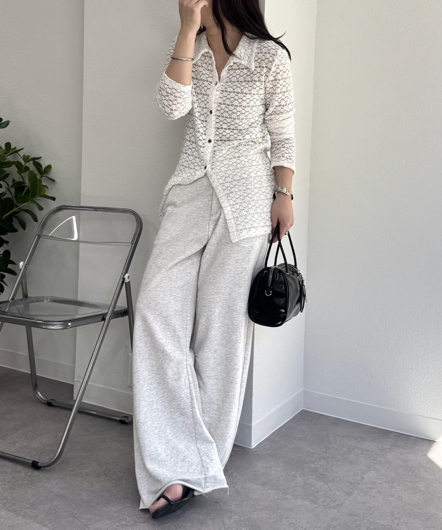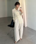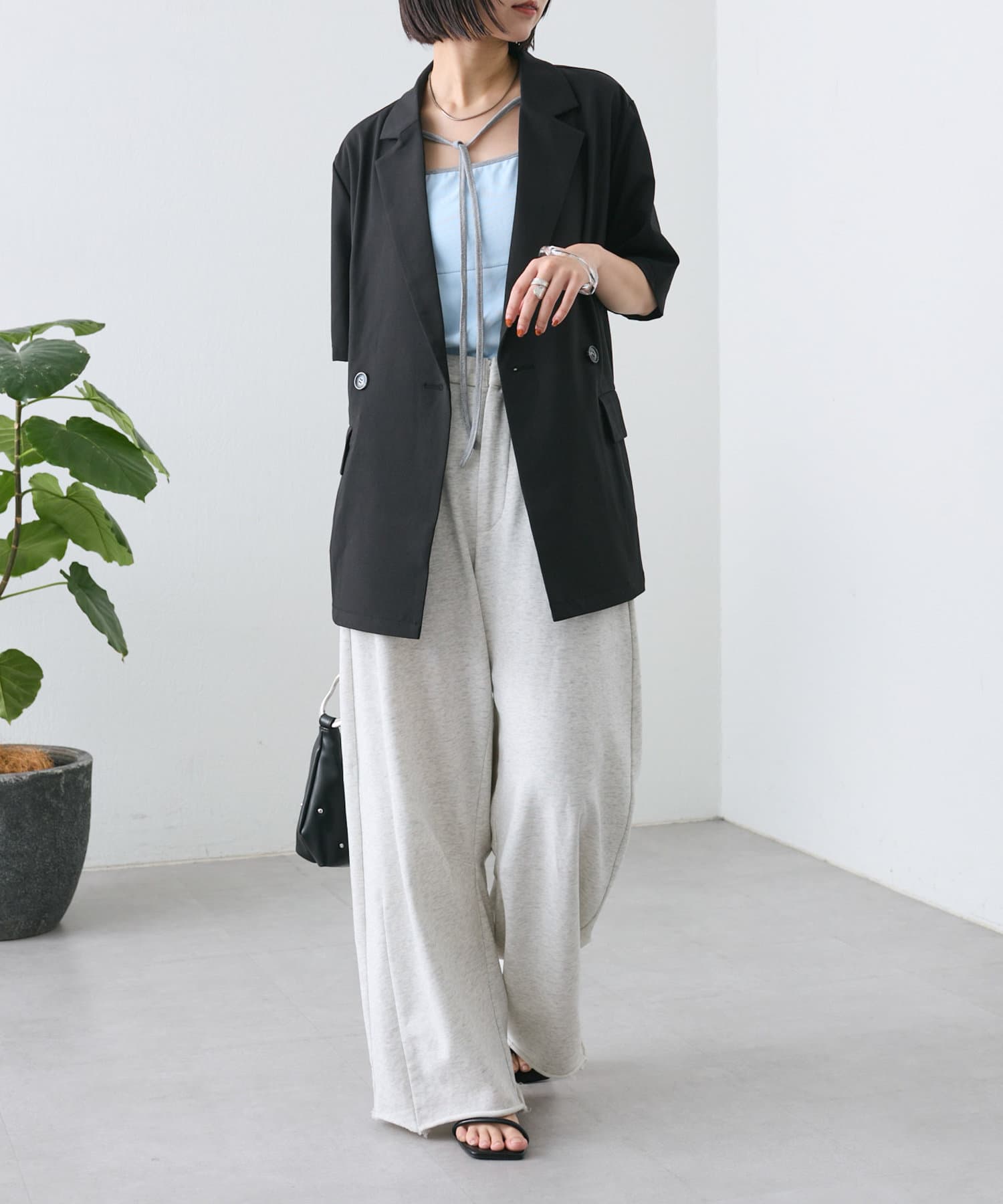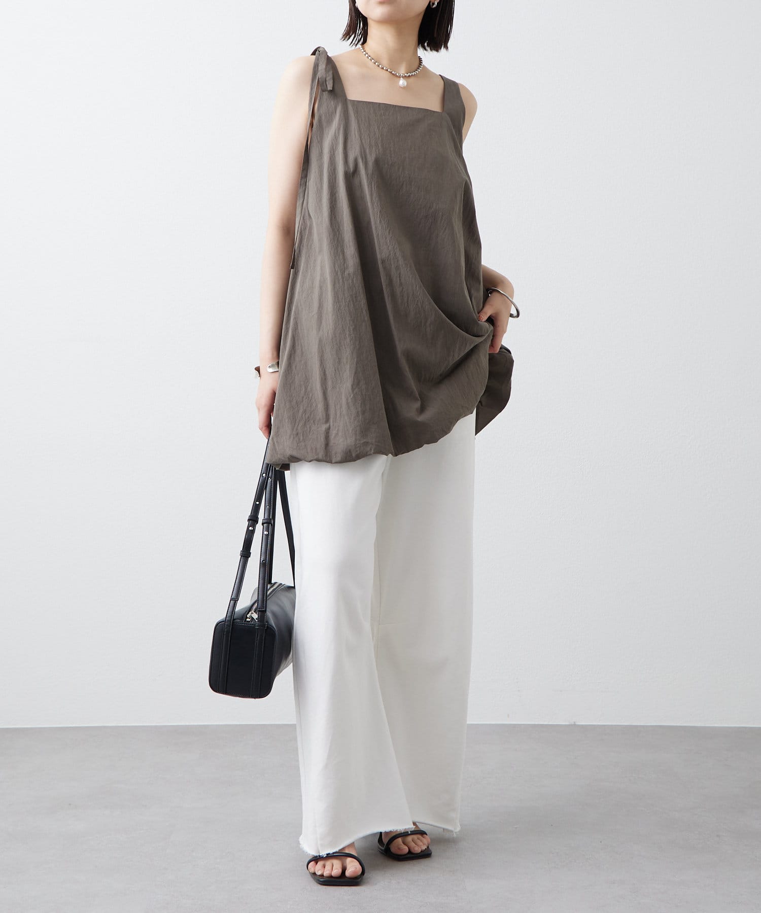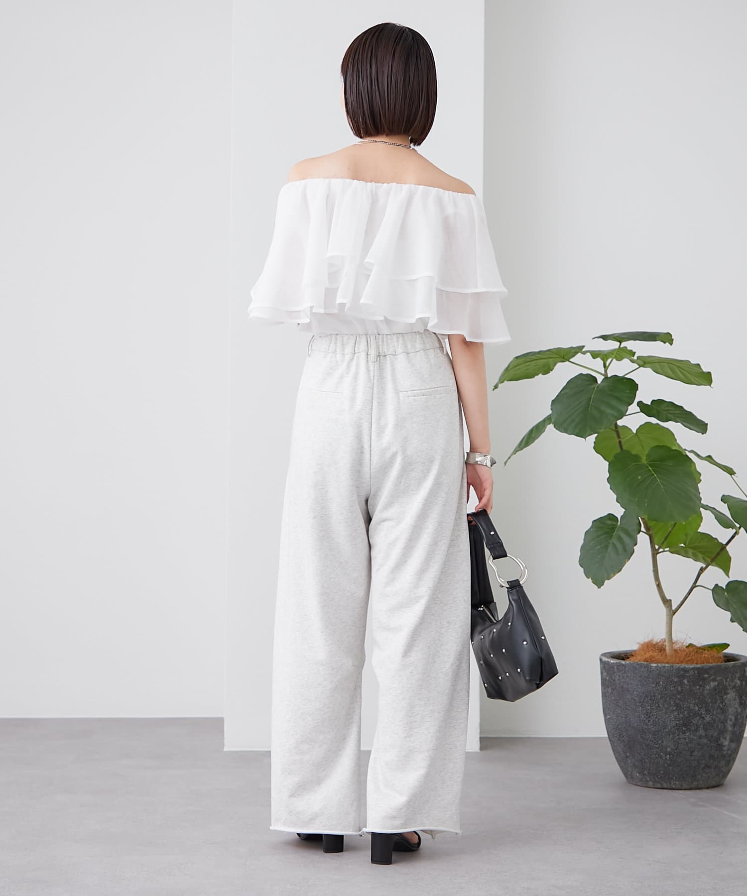 切りっぱなしデザインでカジュアルダウンしてくれるので、ヒールやパンプスと合わせるとバランスが取れるのでおすすめです♩