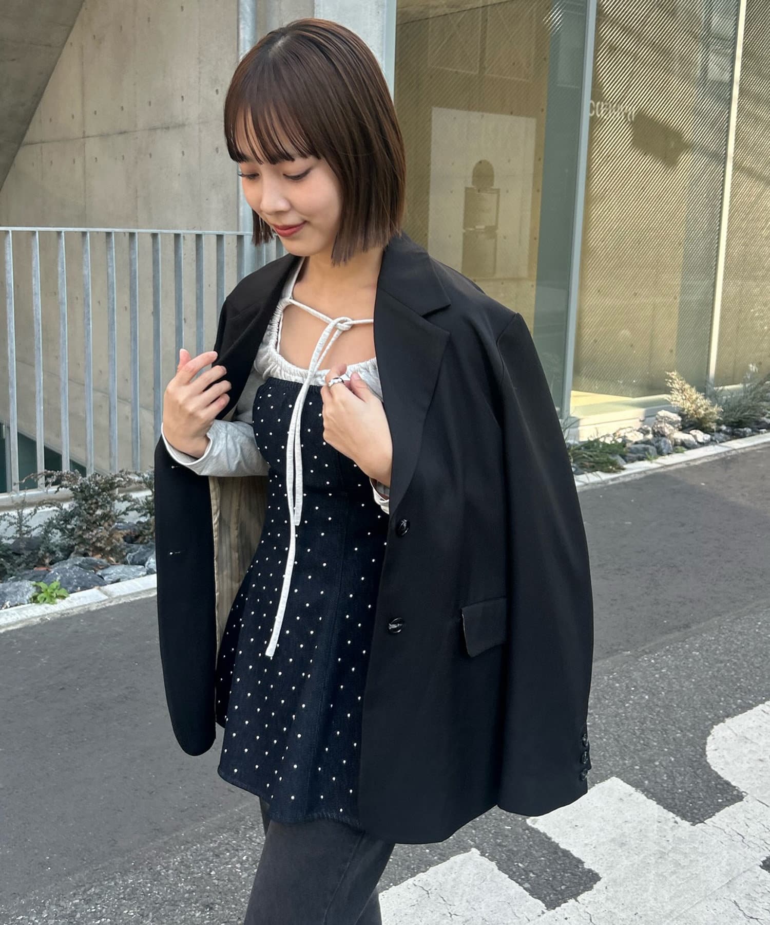 ・ビスチェ1枚で着て、上からジャケットを合わせるだけで綺麗めなコーデが完成します!