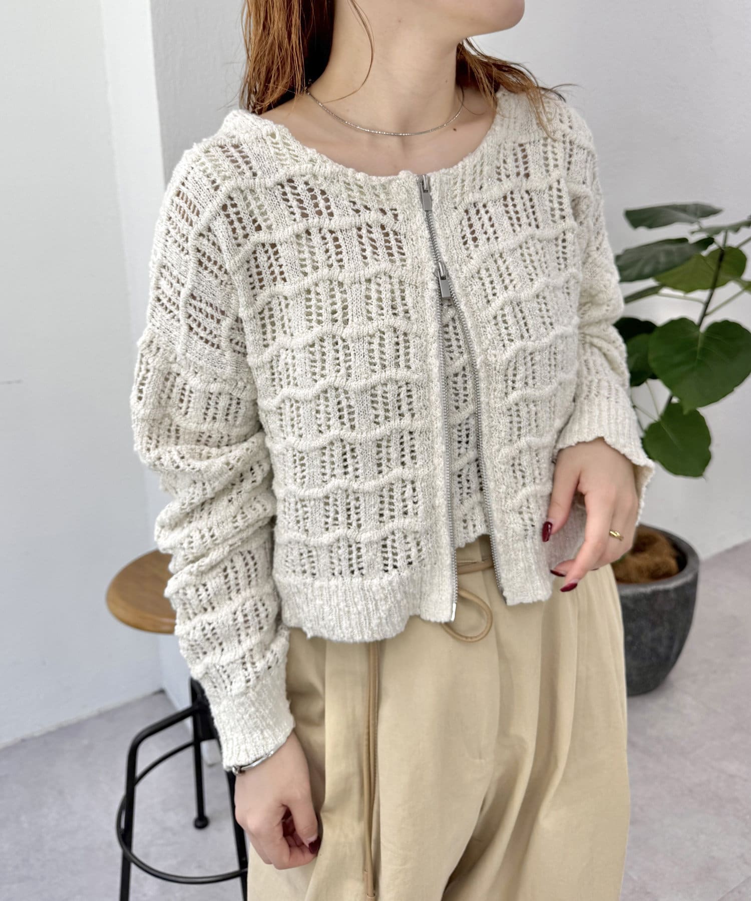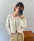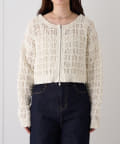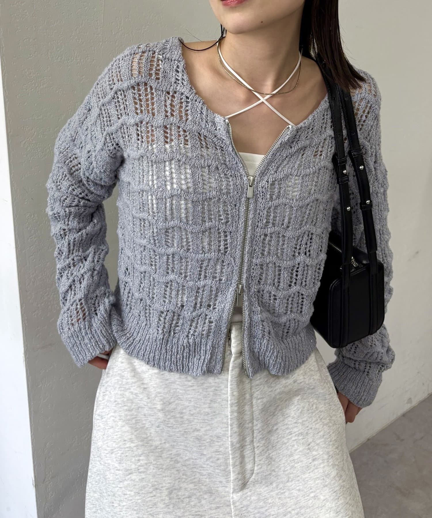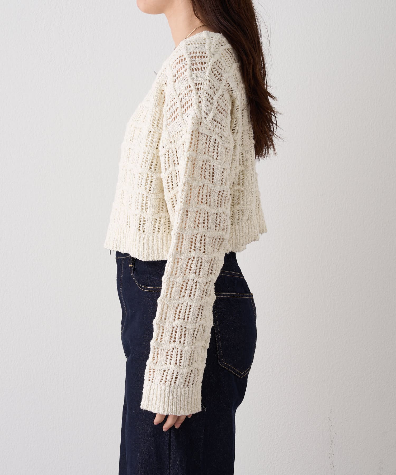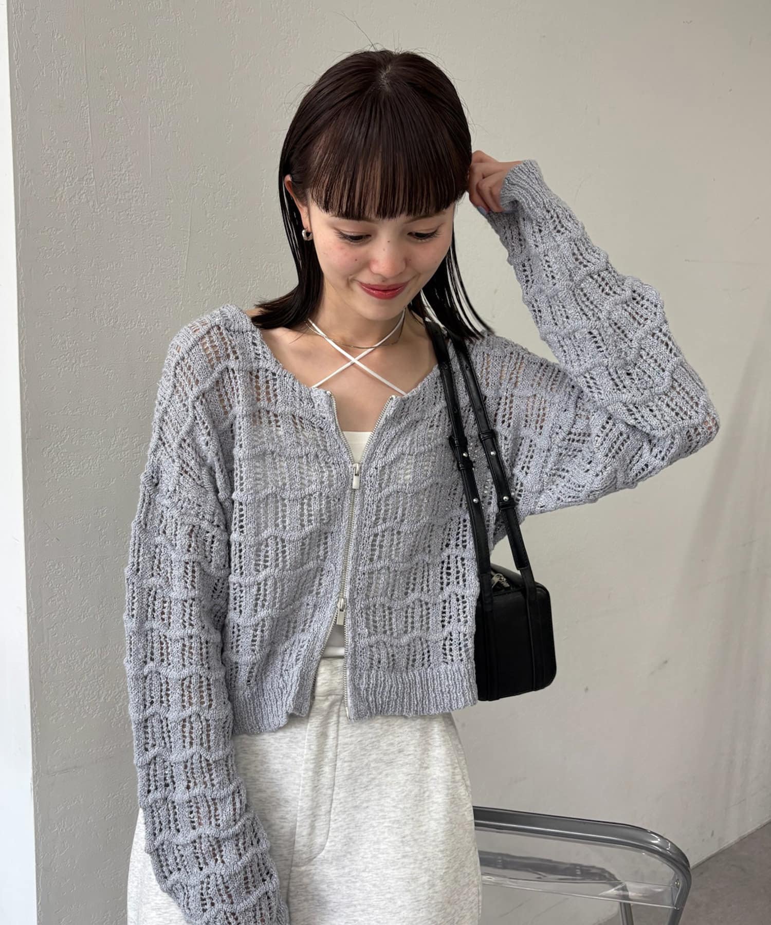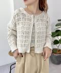 ・繊細な透かし編みが施された、軽やかな印象のニットカーディガン。