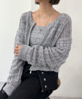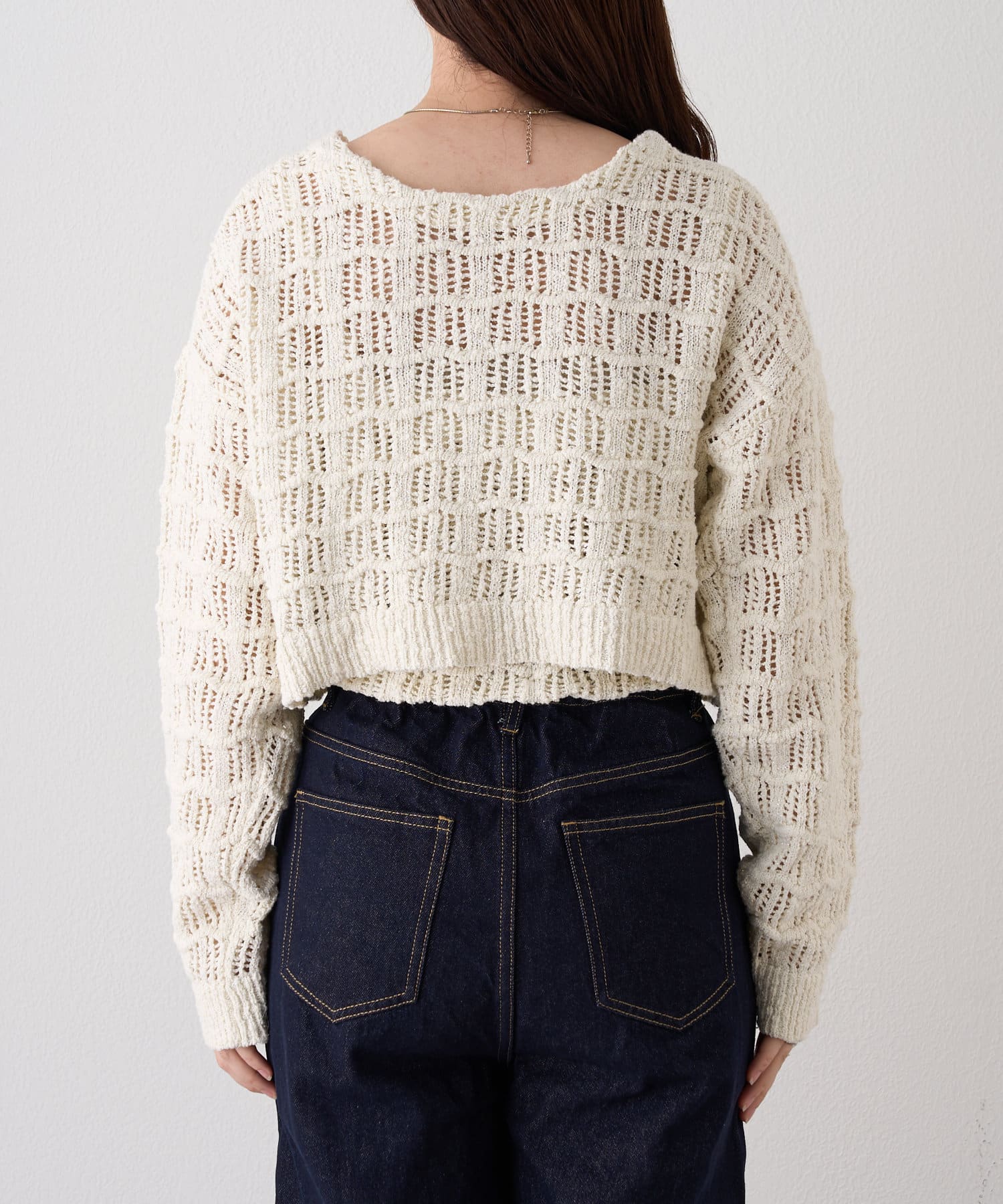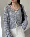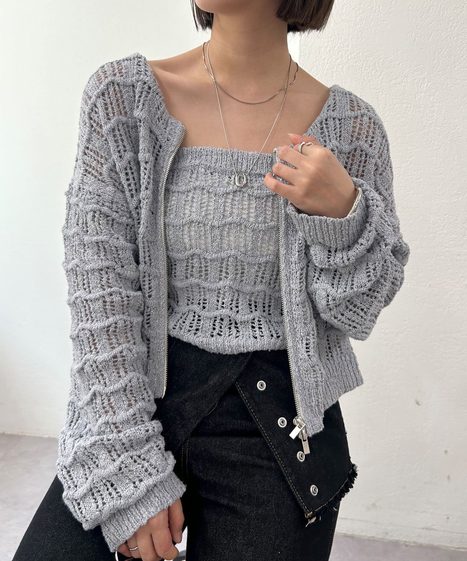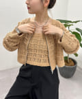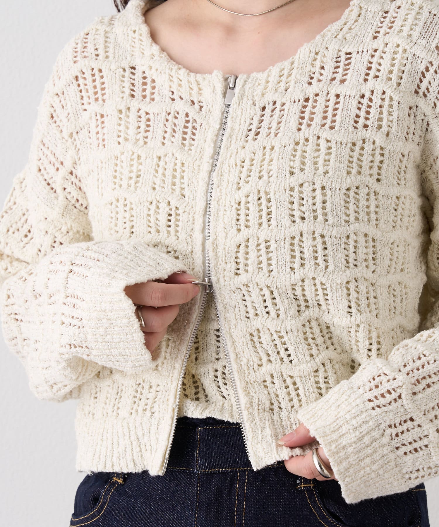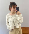 ・繊細な透かし編みが施された、軽やかな印象のニットカーディガン。