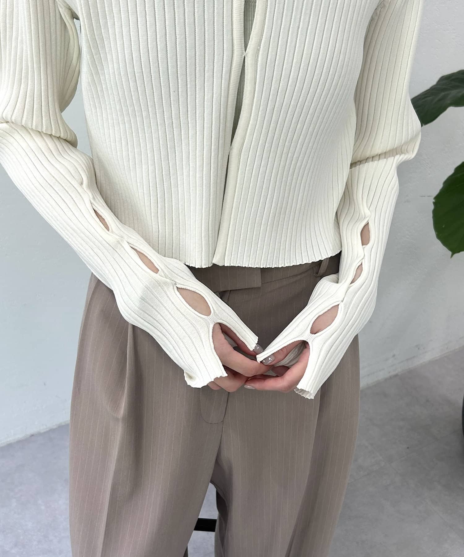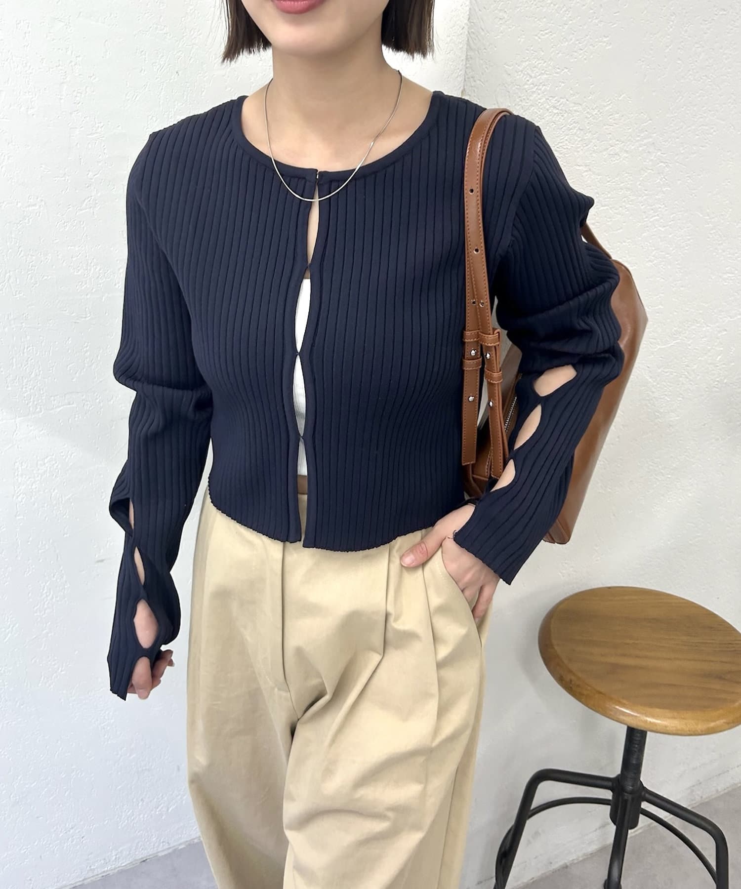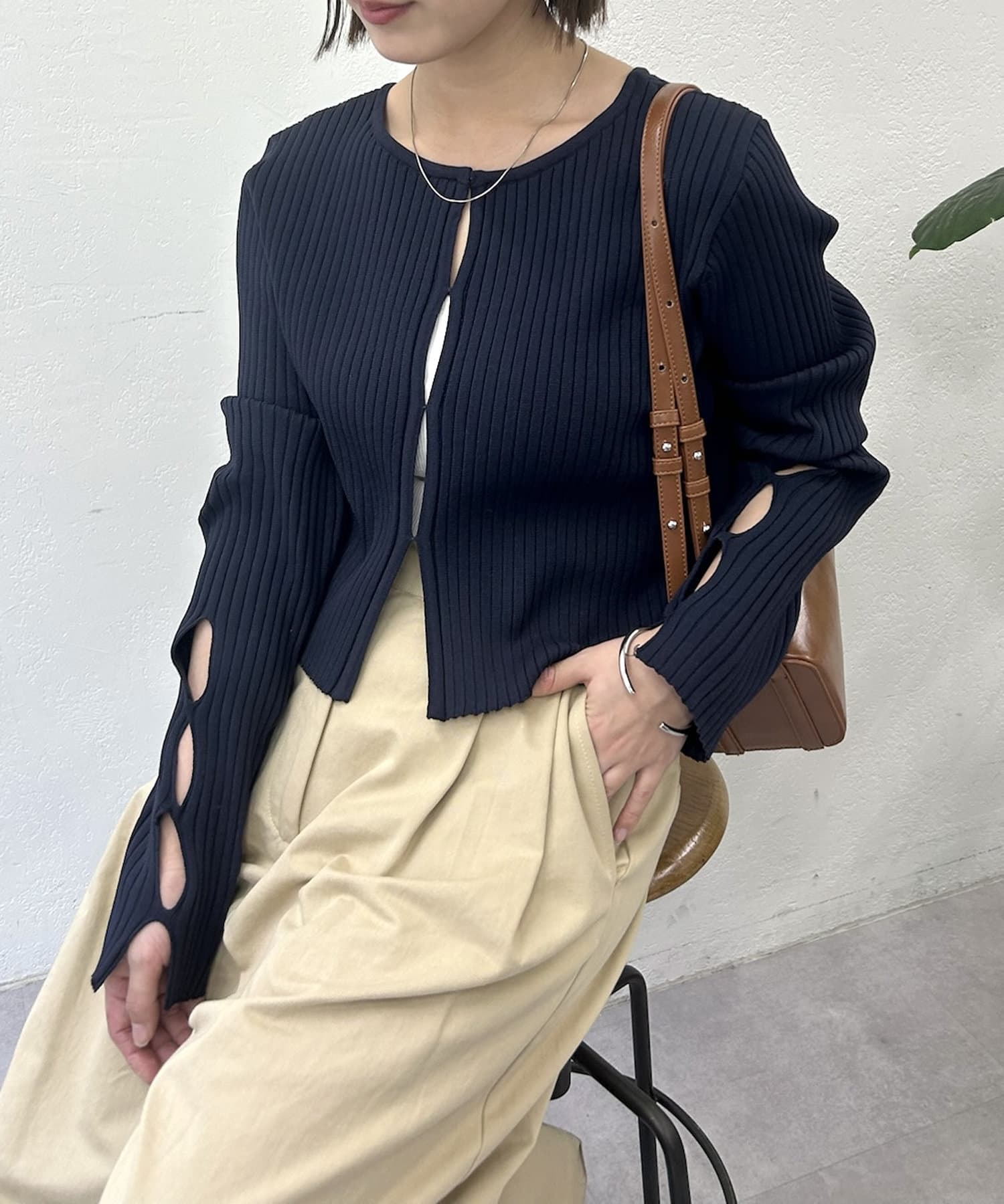 袖には大胆なカッティングが施されており、さりげない肌見せで女性らしさを演出♡