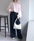 ・コンパクトなトップスなので、ワイドシルエットのボトムス合わせでトレンド感あるスタイリングに!