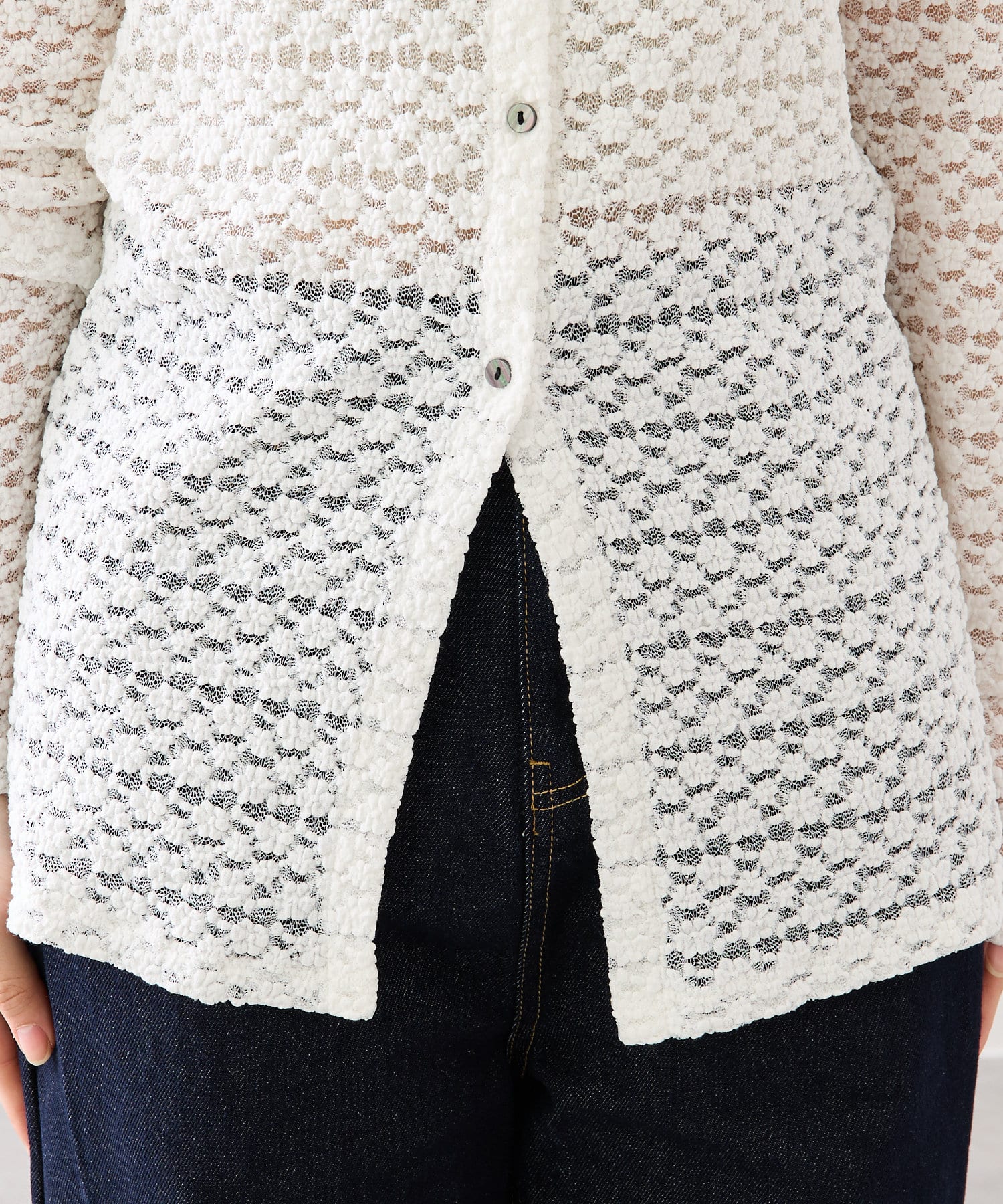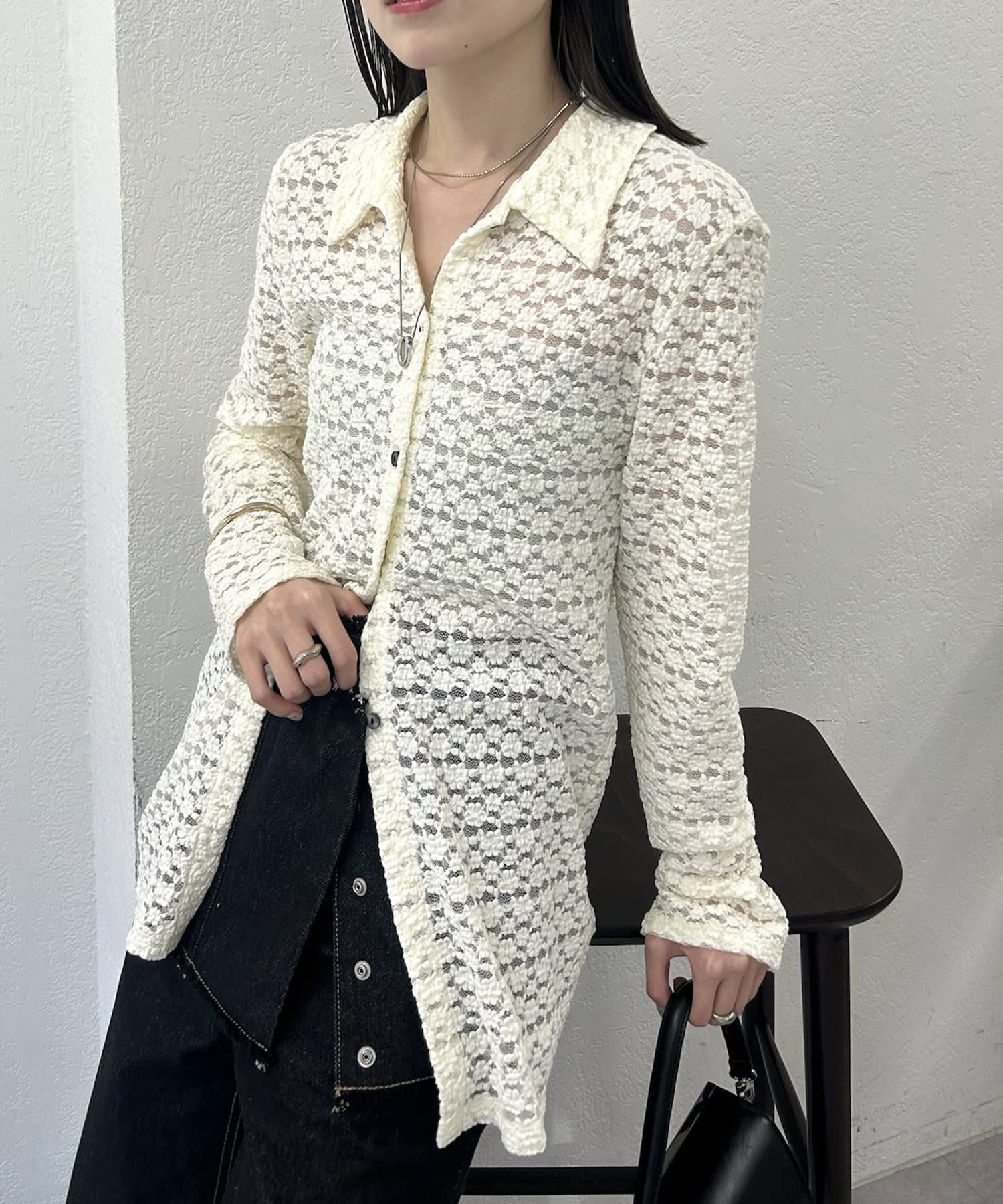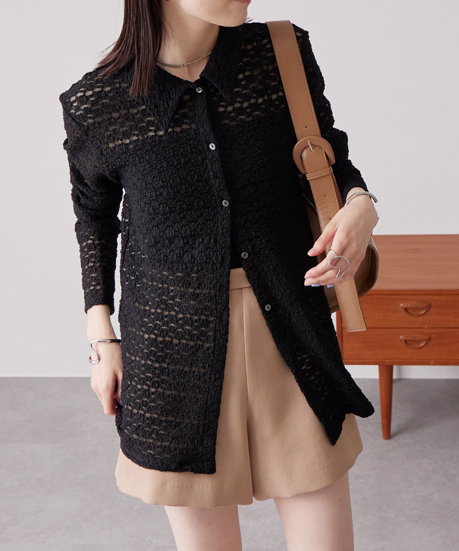 購入場所:店舗店舗でみて一目惚れで購入。きてみたら丈も長めでそこがかわいい。すっごく透けるかなーと思ったけど刺繍が濃いめ?なのでしたをパット付きのものにしたらサラッと切れる感じです。インナーは、気をつけた方がいいけど夏の冷房の羽織でも重宝しそうなアイテム。結構伸びるのでピタピタした感じはあんまり感じませんでした。