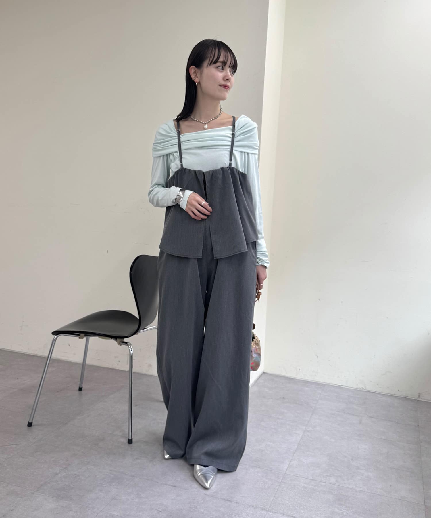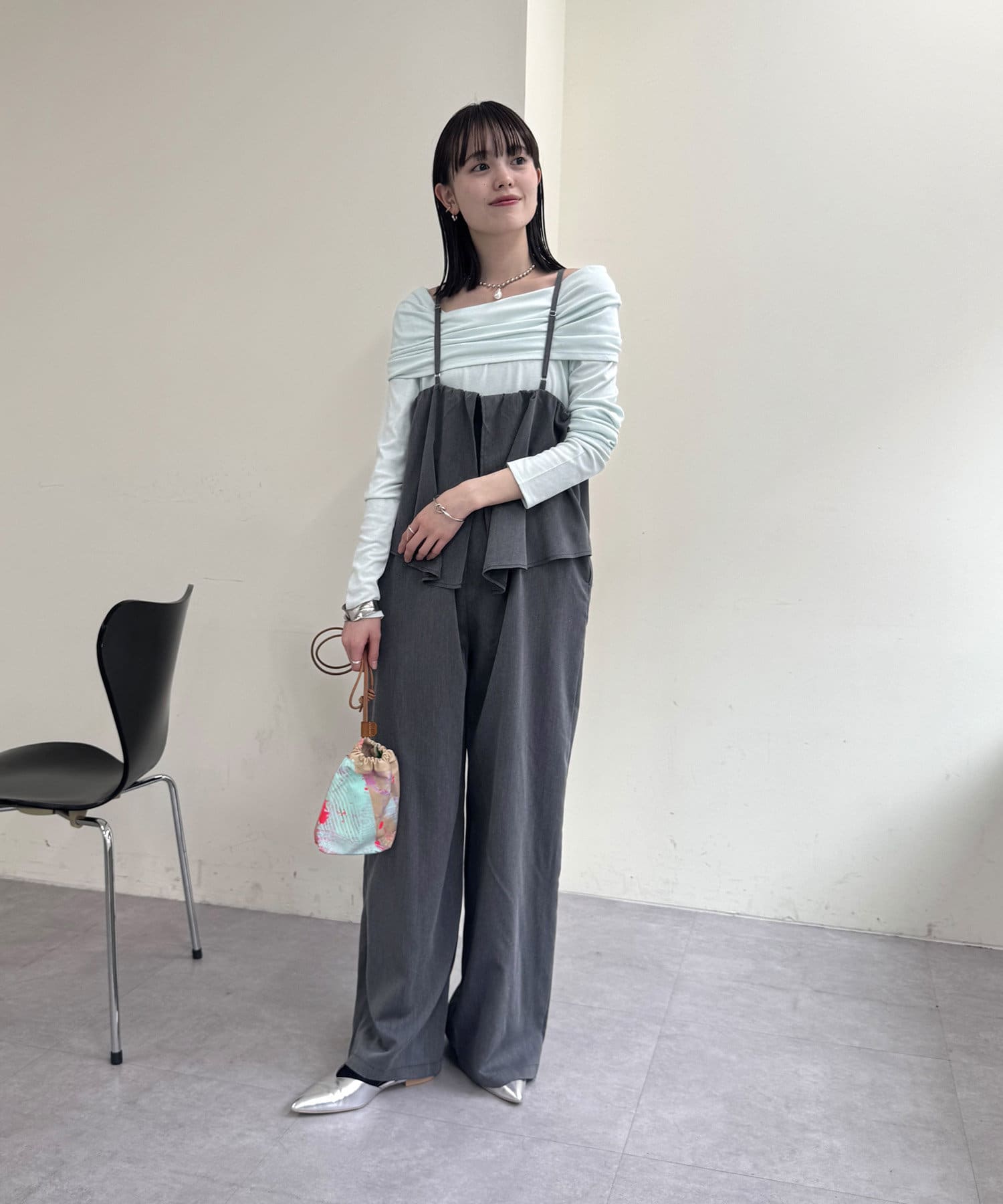 ・アメスリデザインで肩回りもスッキリ華奢に見せてくれるオールインワン。
