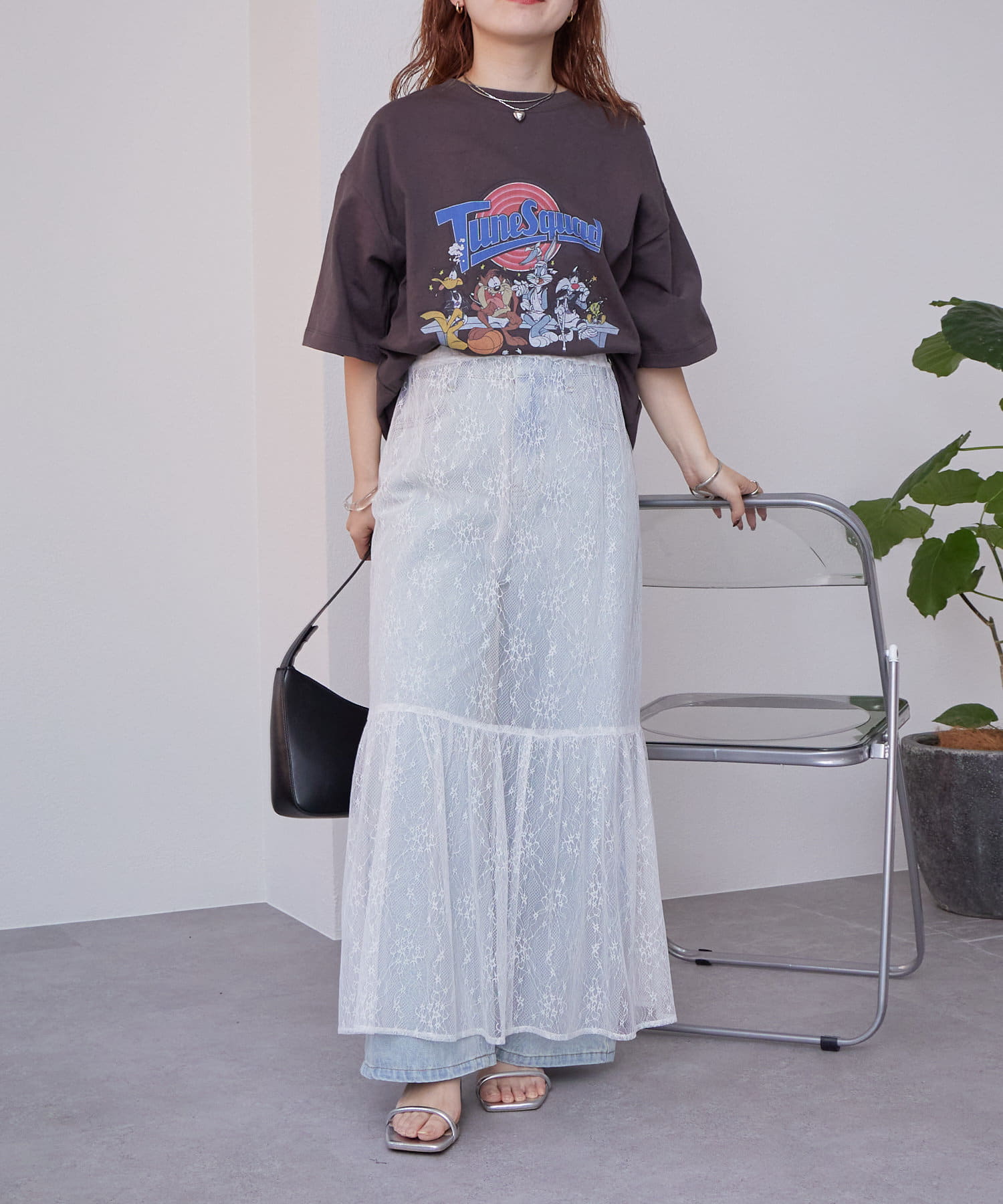 透け感のあるレース素材が、夏のコーディネートに涼しげなアクセントを加えます。