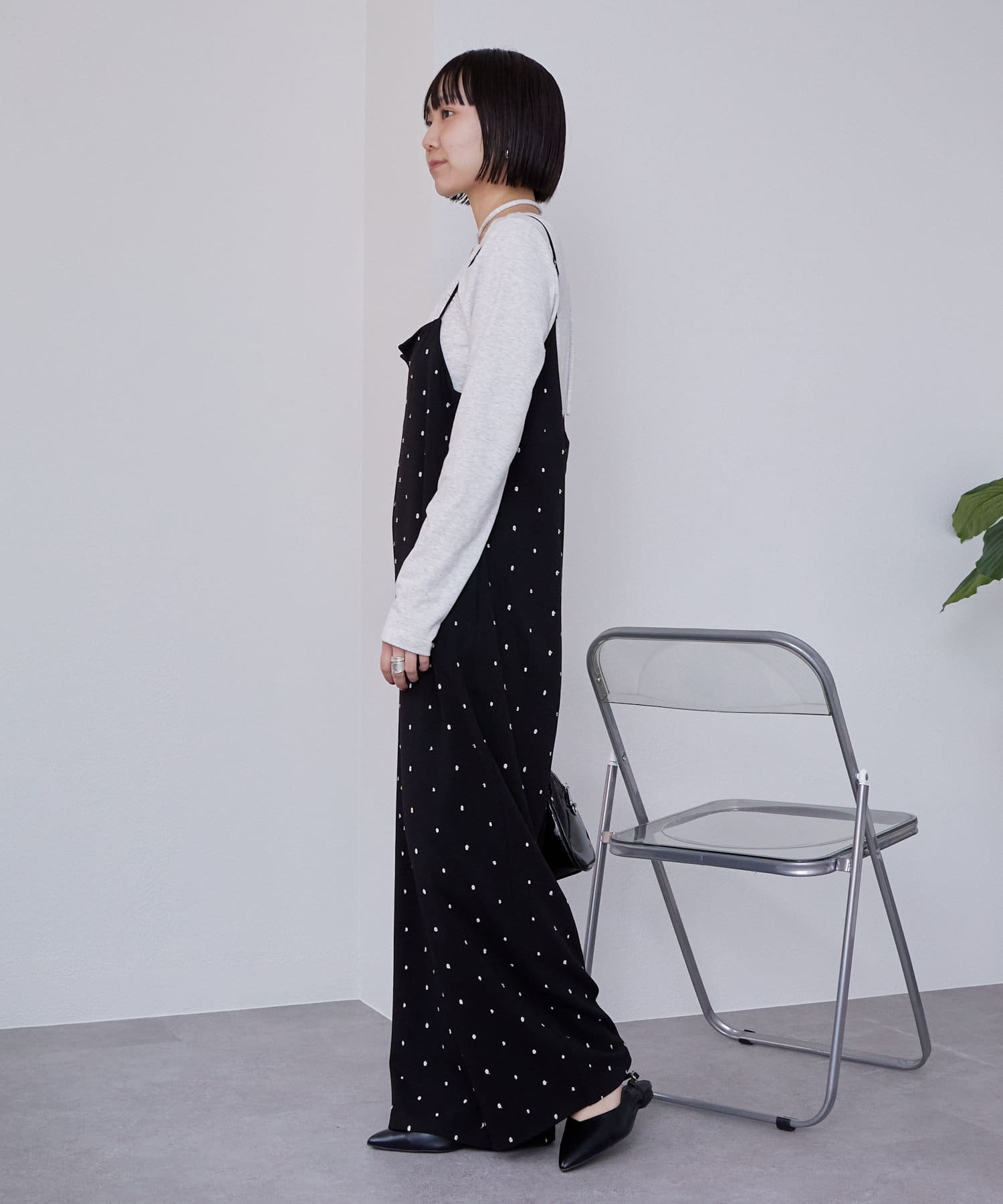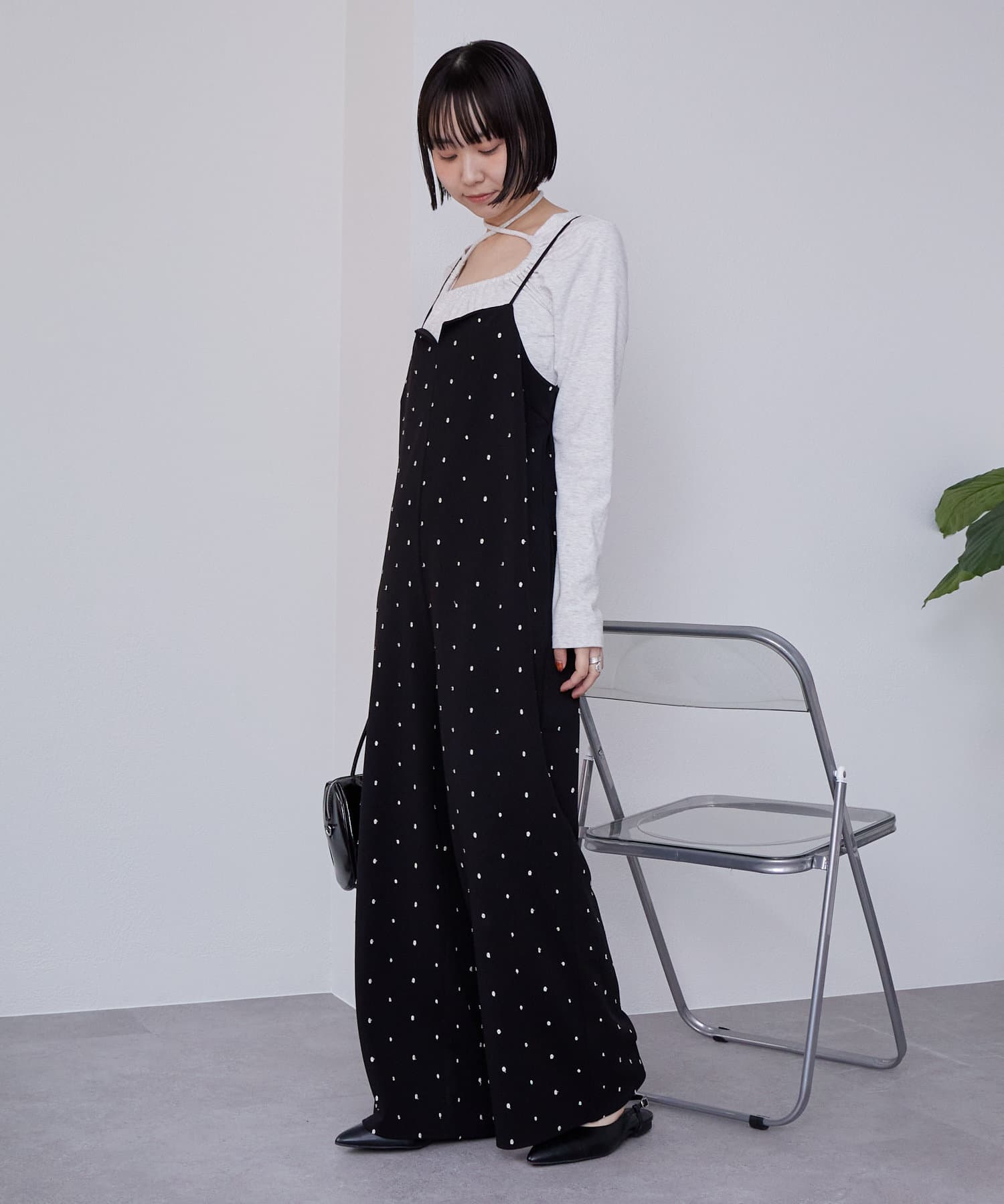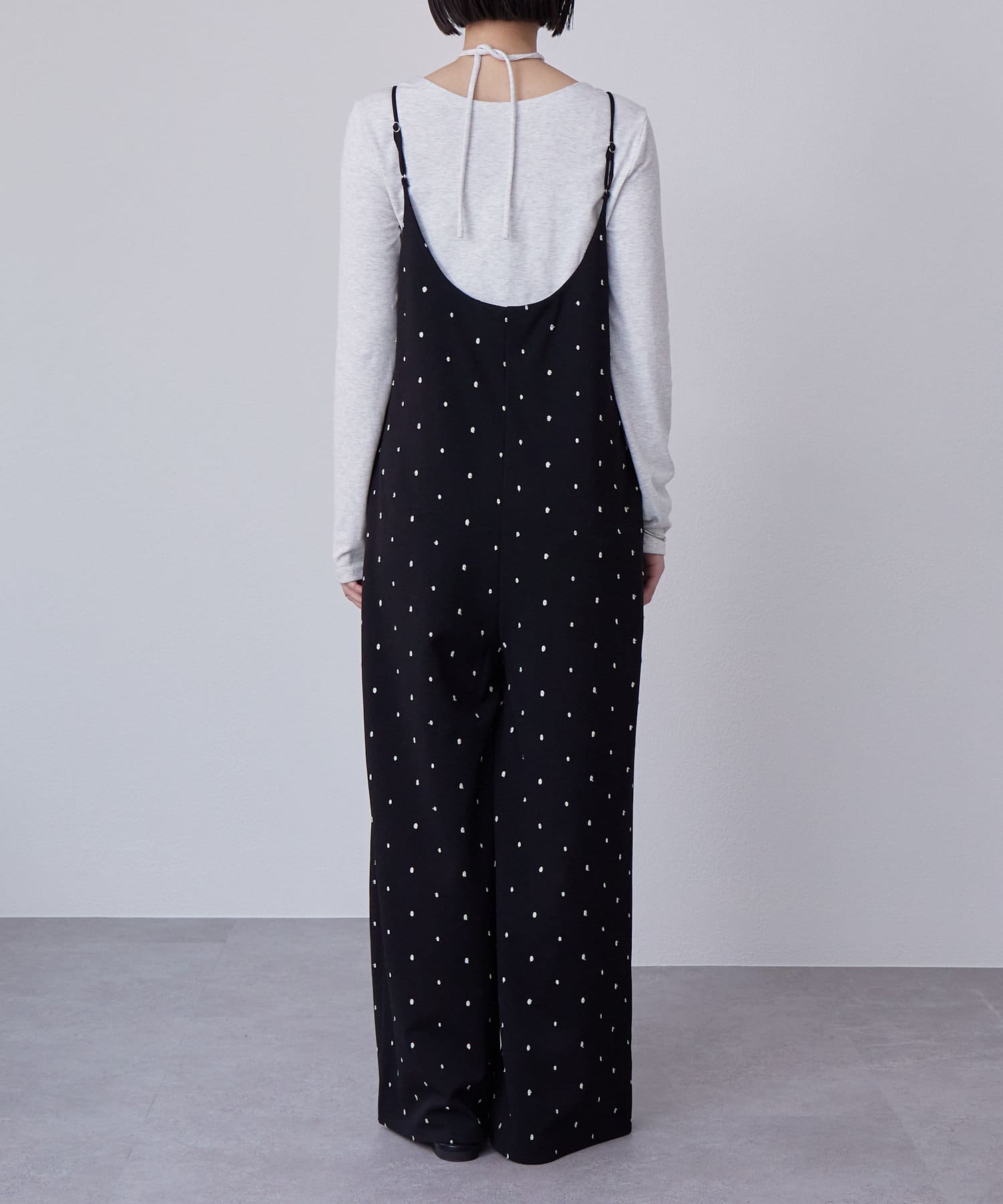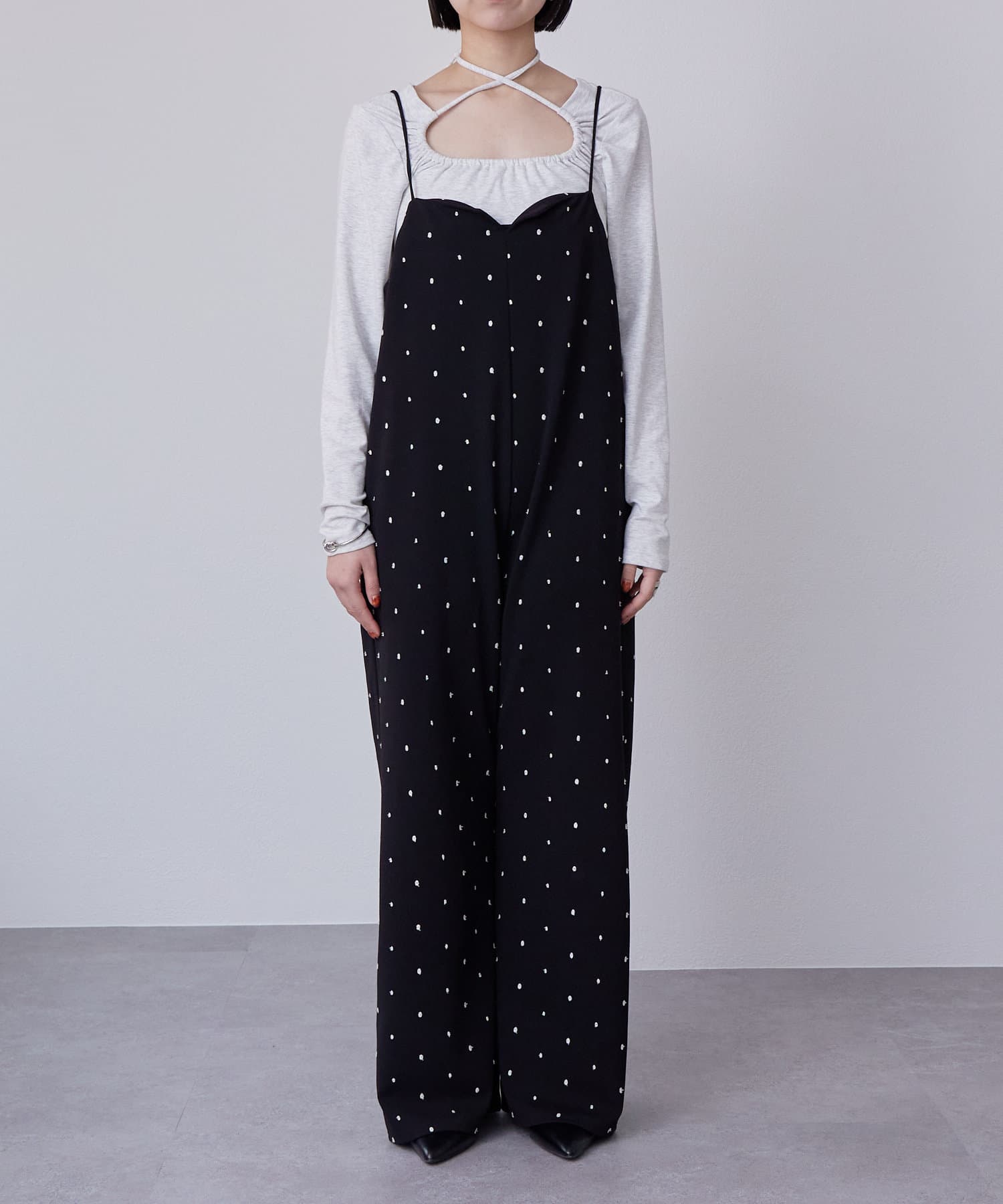 シンプルなデザインながら、華やかでドット柄の刺繍が魅力的なサロペット。