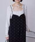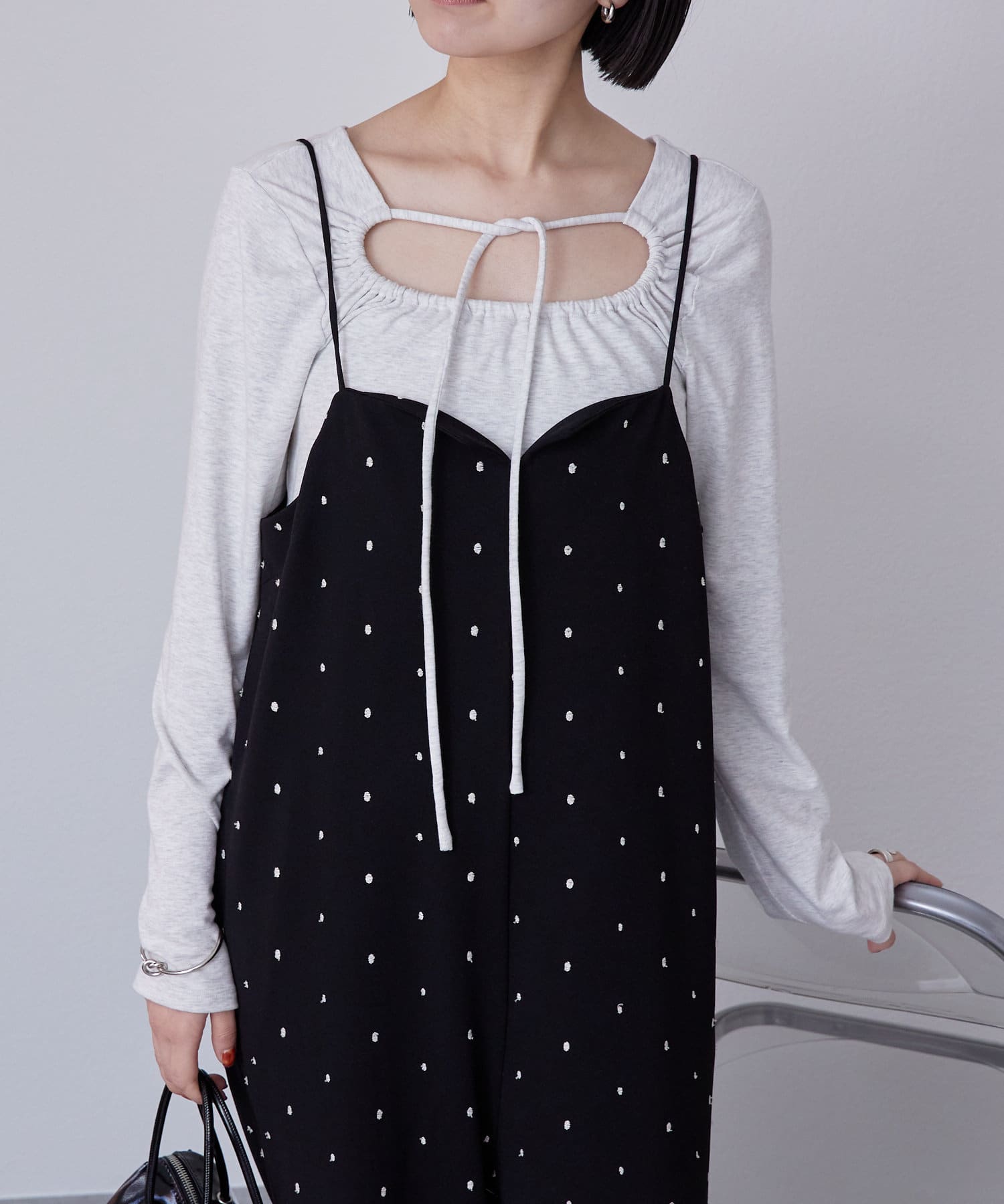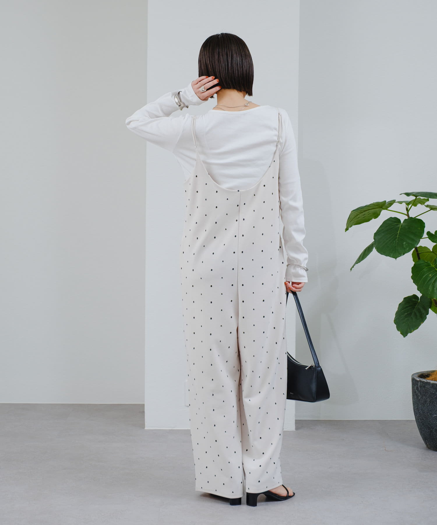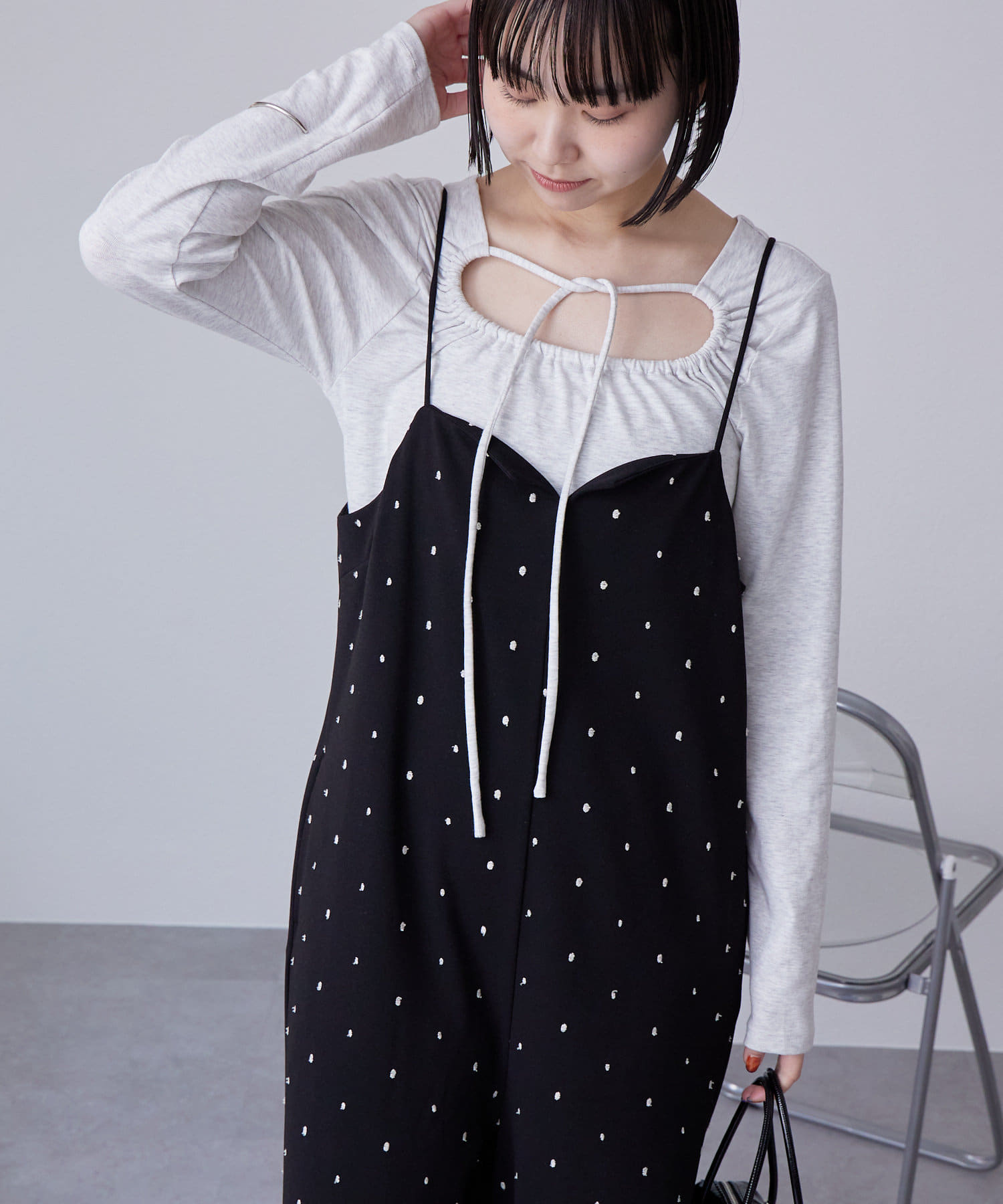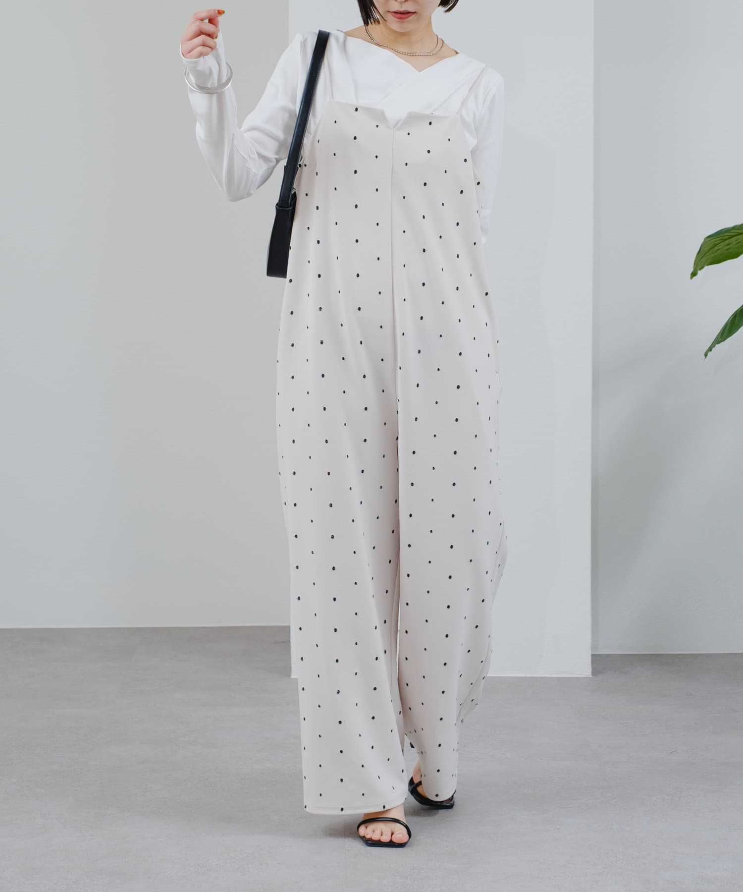 シンプルなデザインながら、華やかでドット柄の刺繍が魅力的なサロペット。