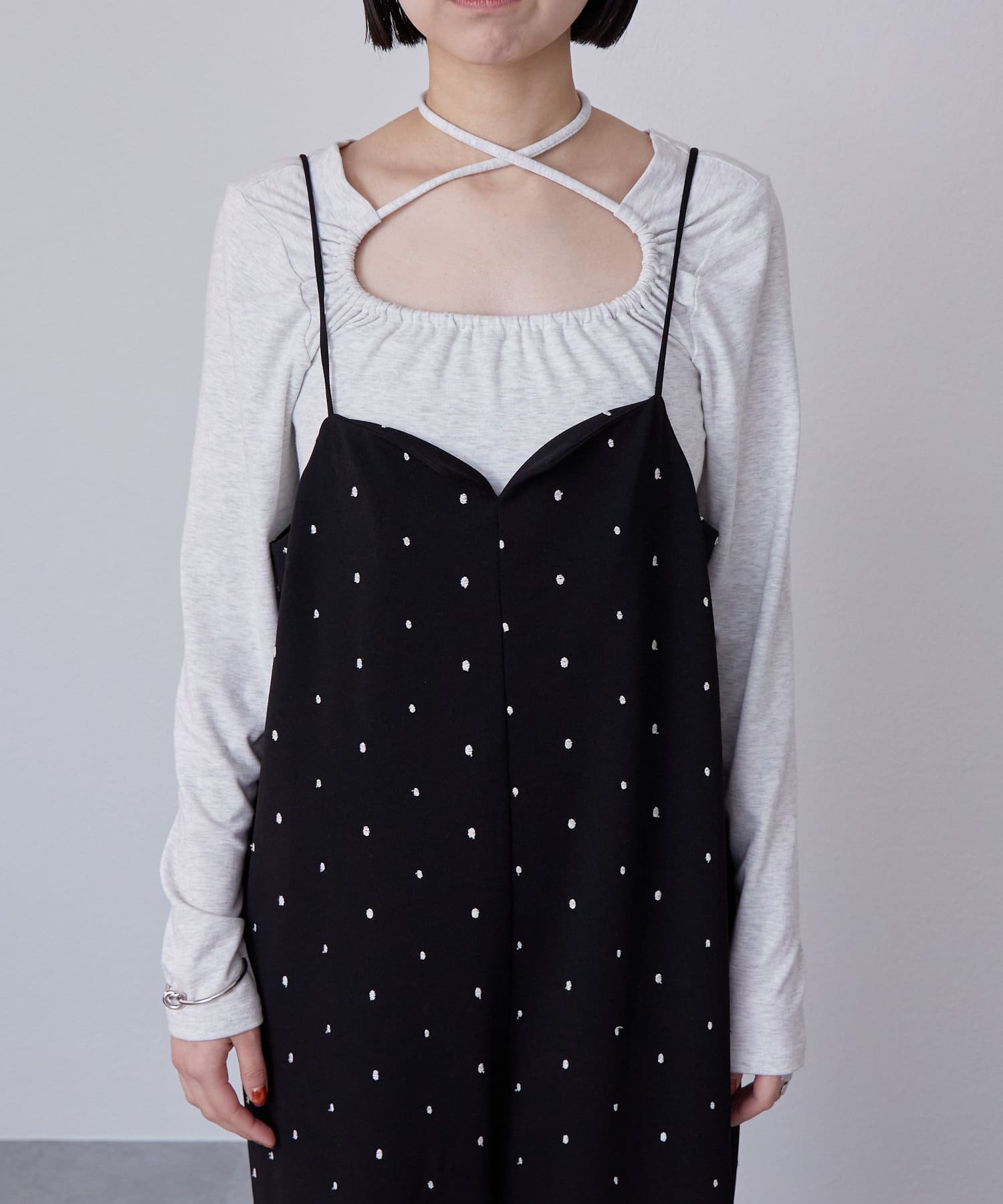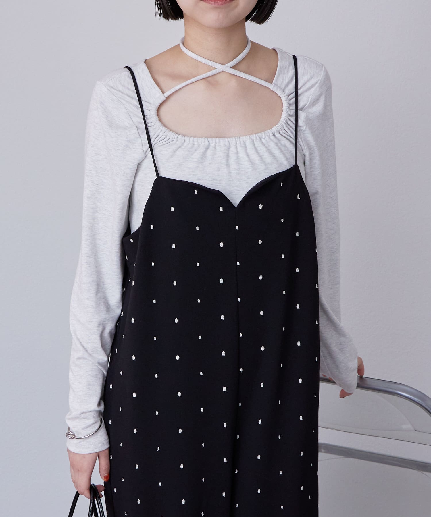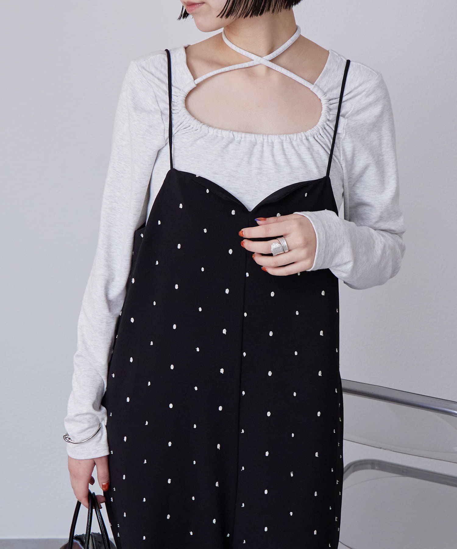 ストラップは細めで女性らしさを演出。胸元が少し開いたデザインで抜け感をプラス。