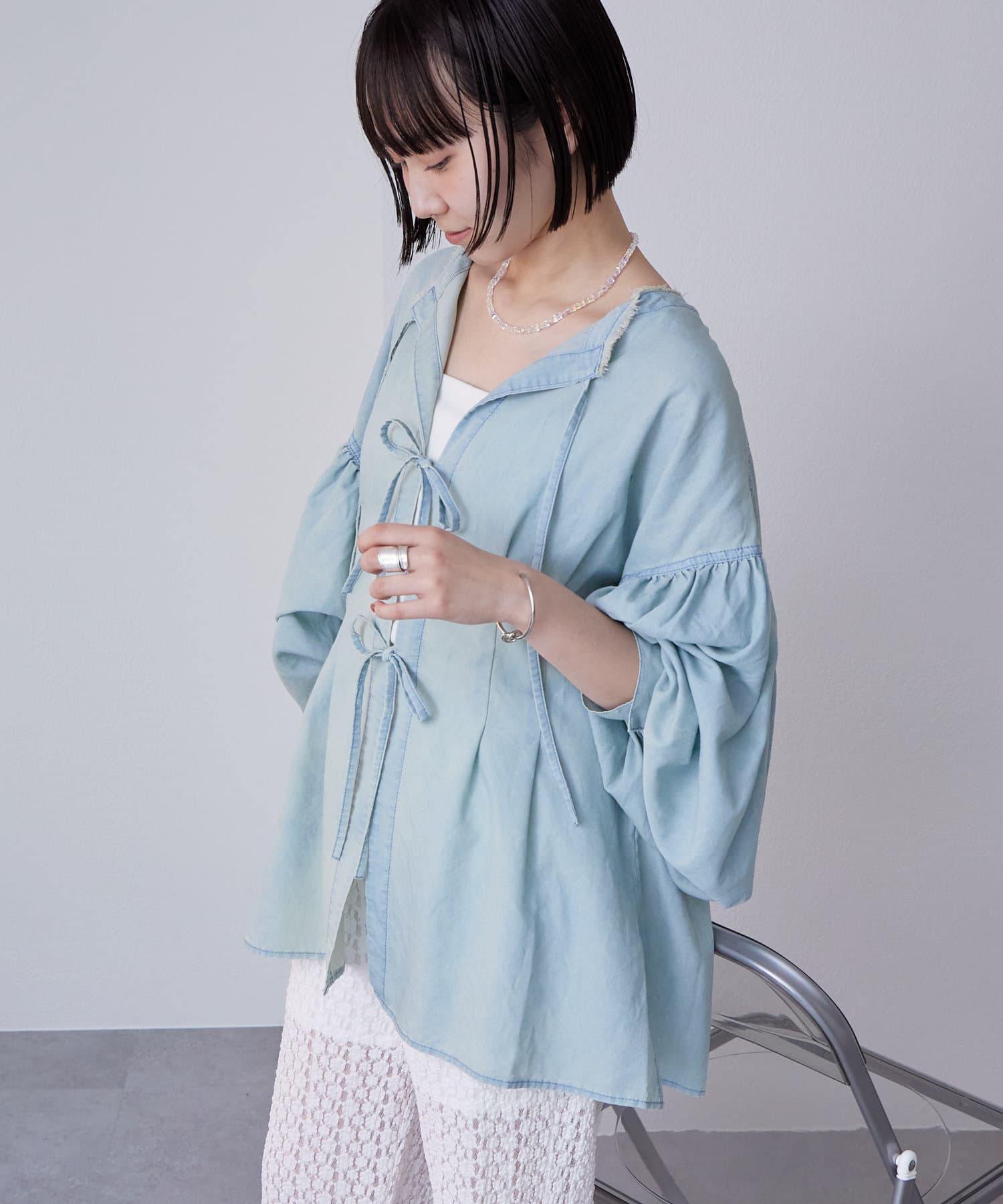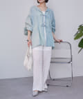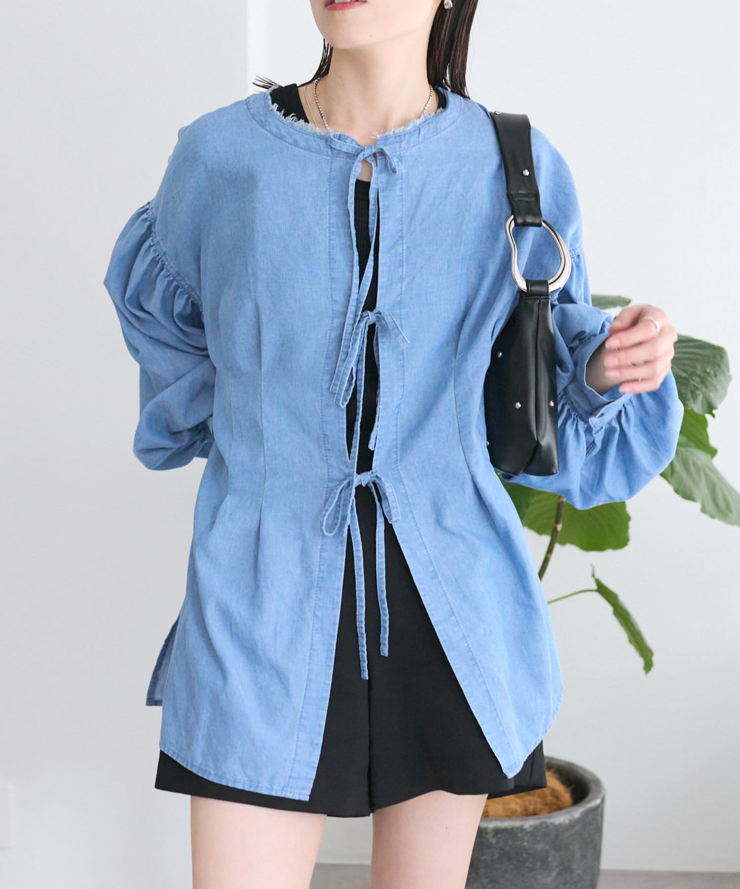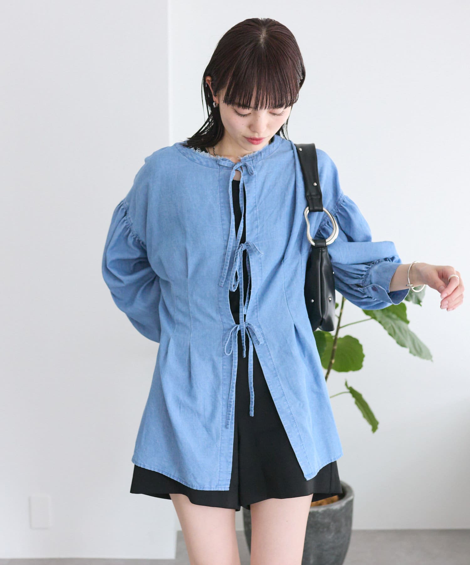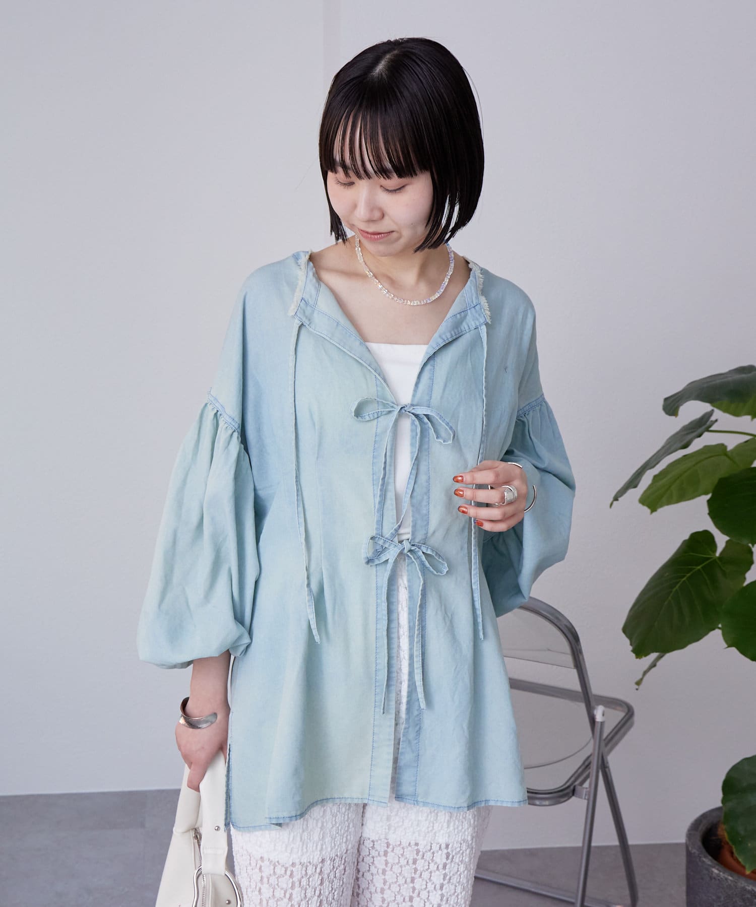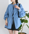 前開きデザインで、ウエスト部分にはリボンで結べる紐が付いているため、シルエットの変化を楽しめるシャツ。