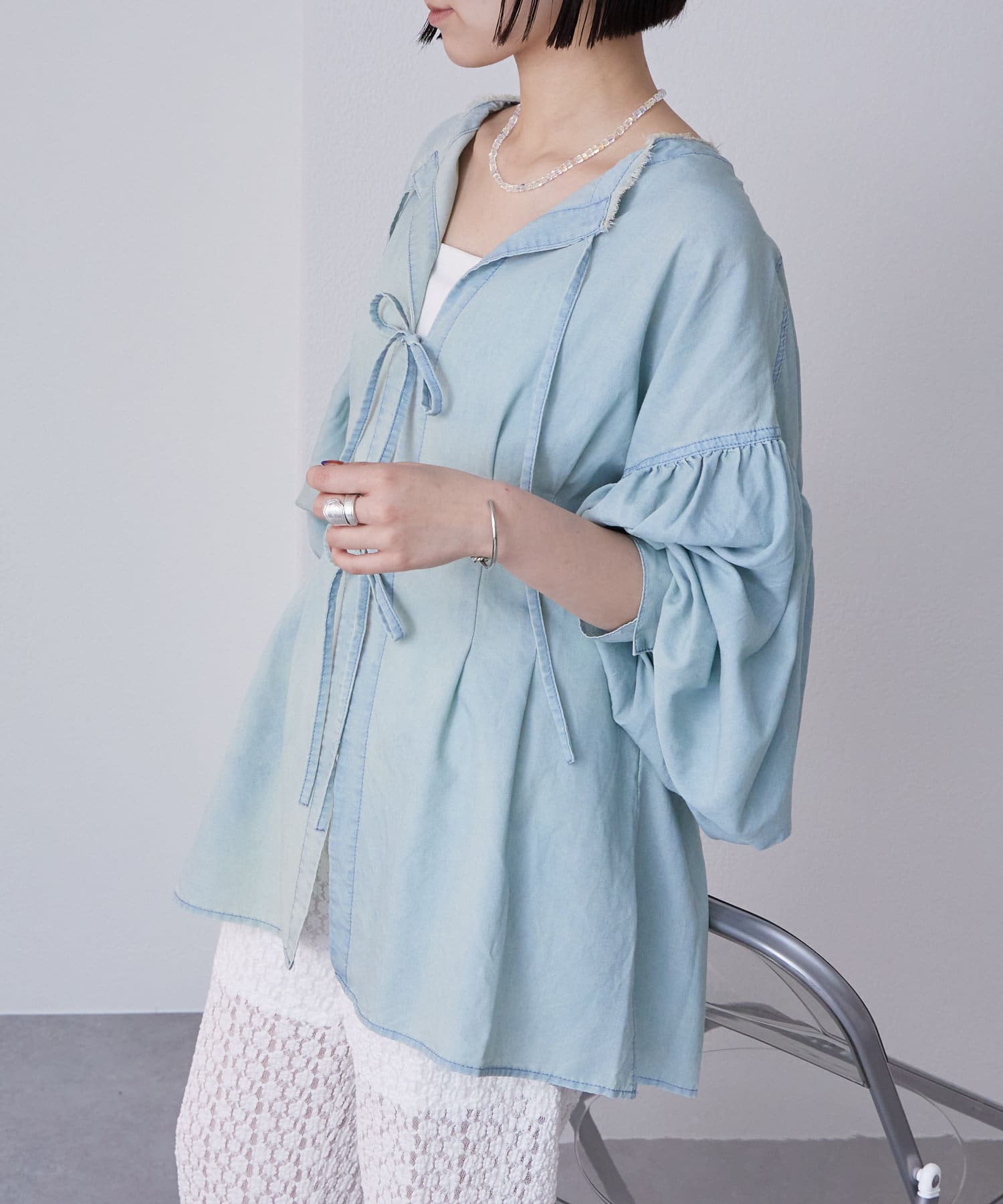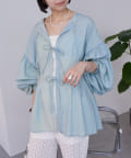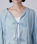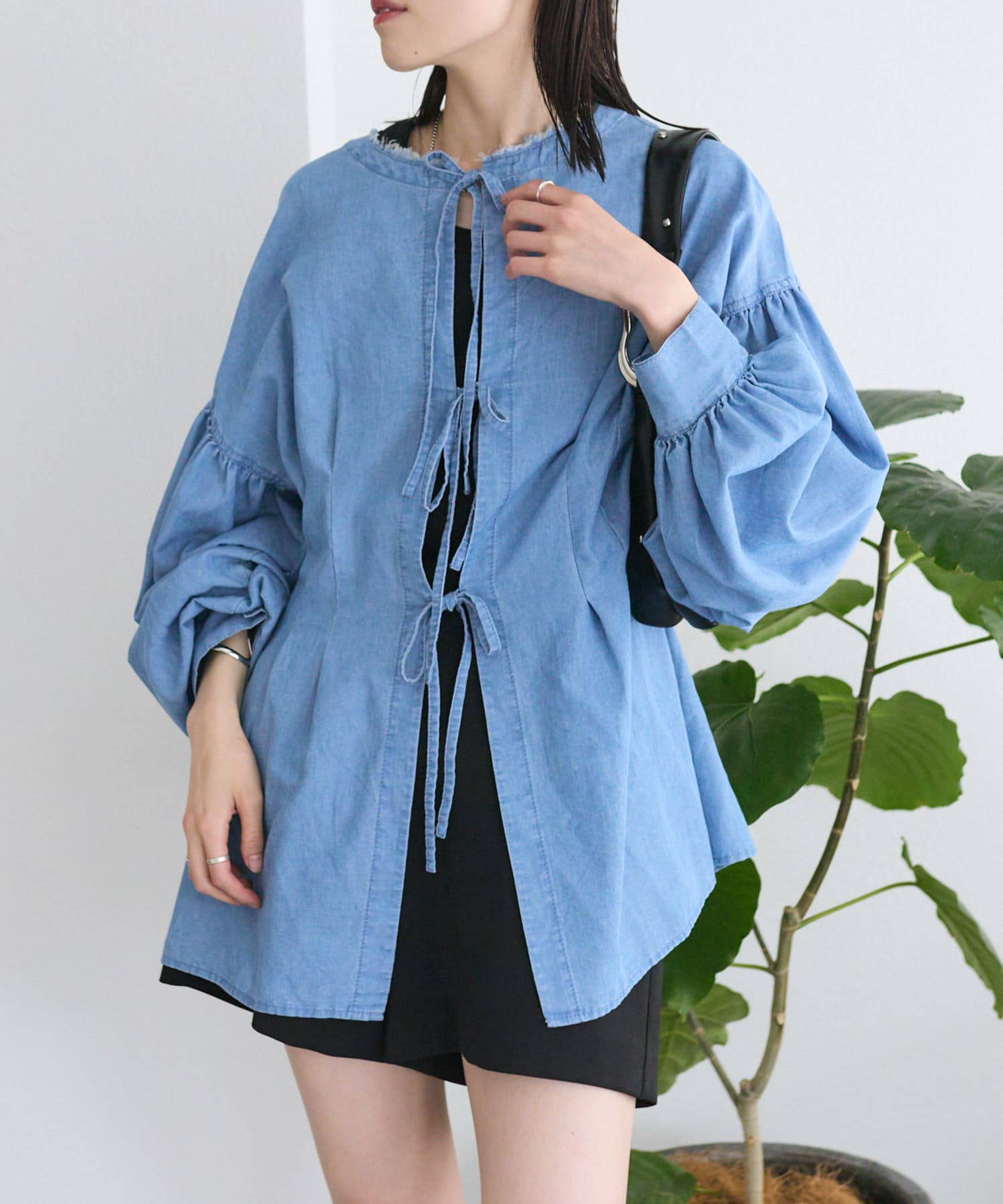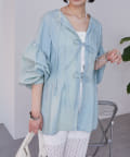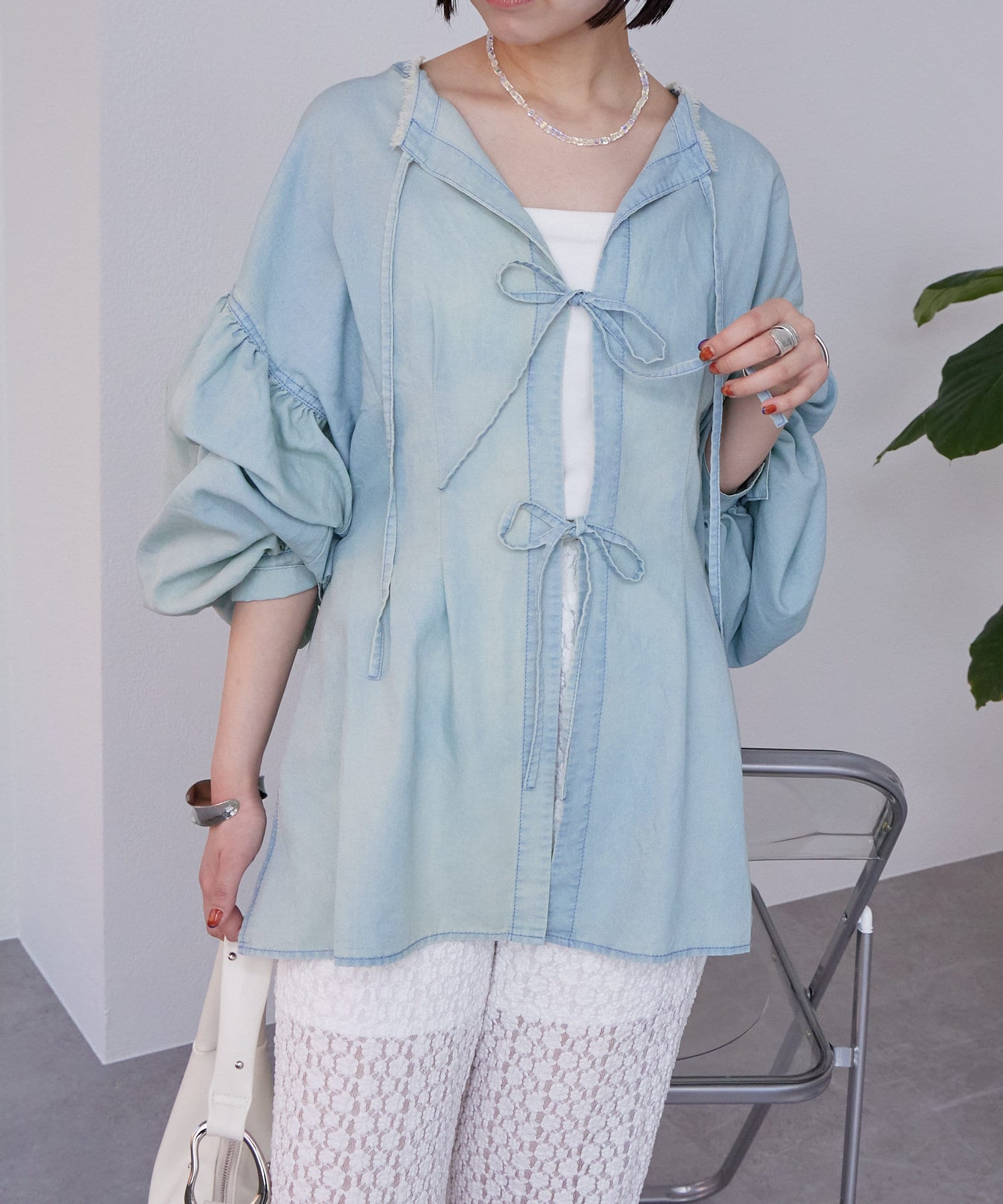 前開きデザインで、ウエスト部分にはリボンで結べる紐が付いているため、シルエットの変化を楽しめるシャツ。